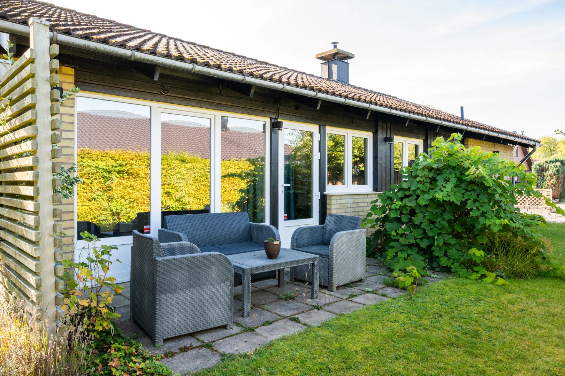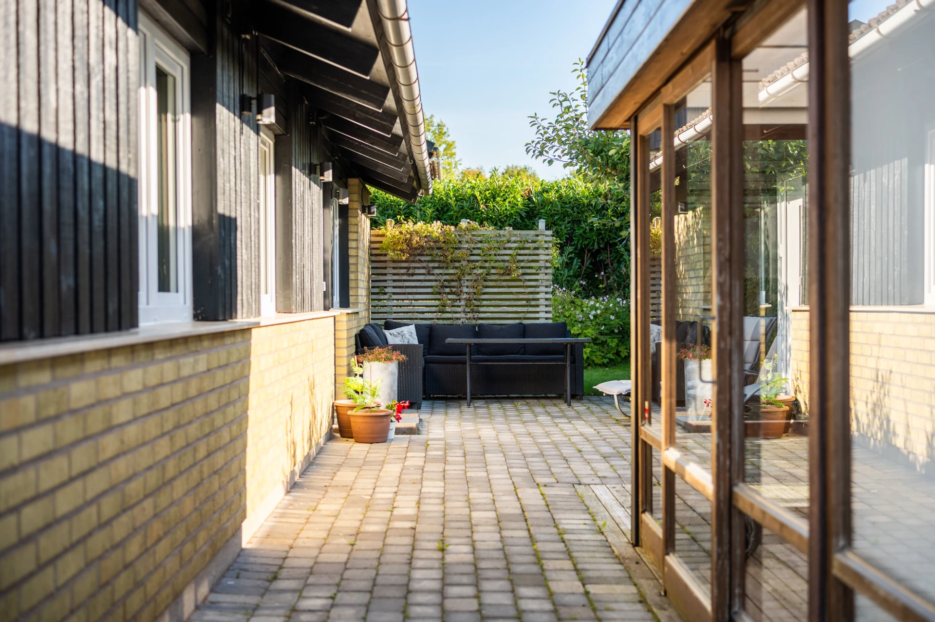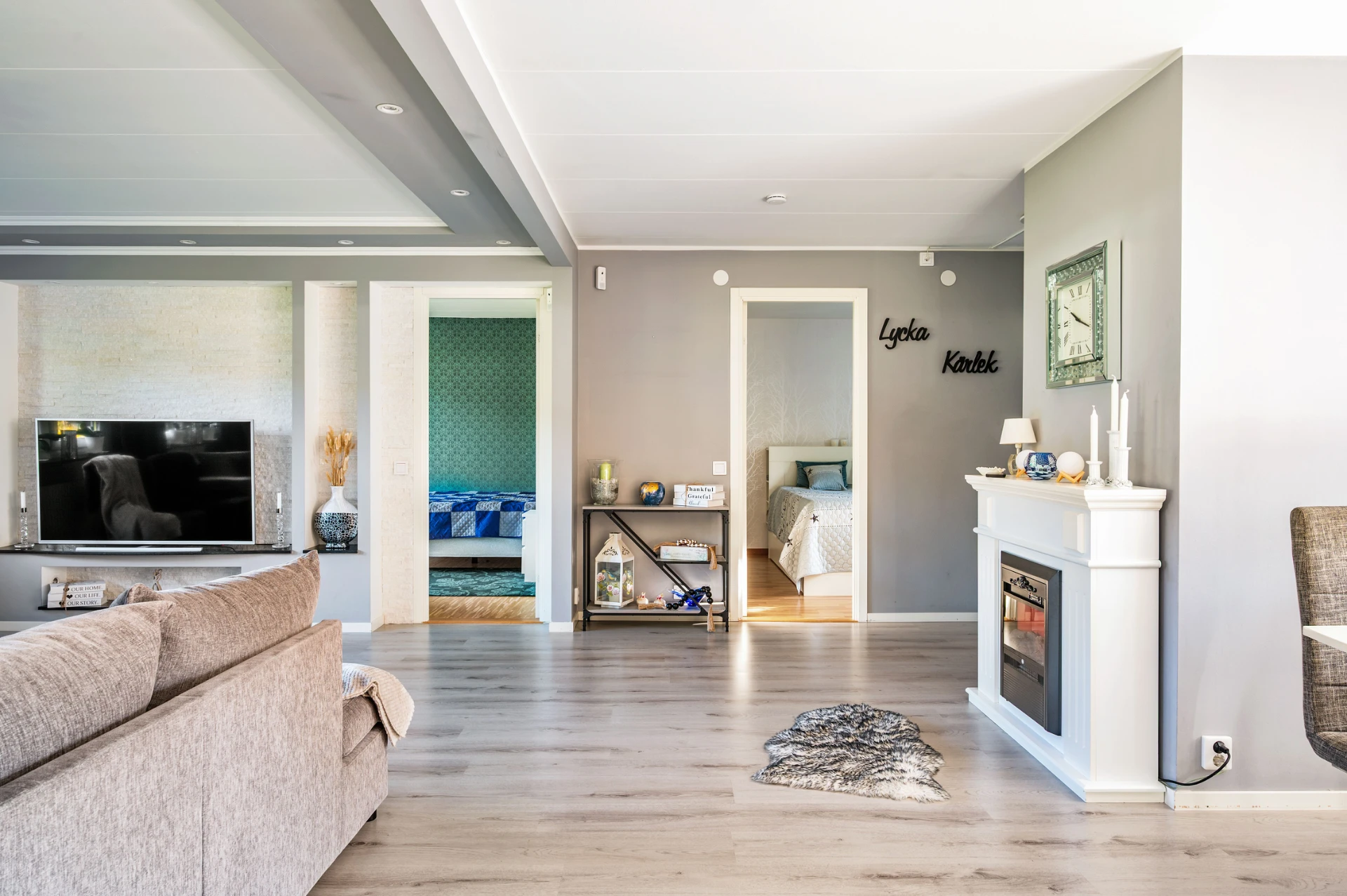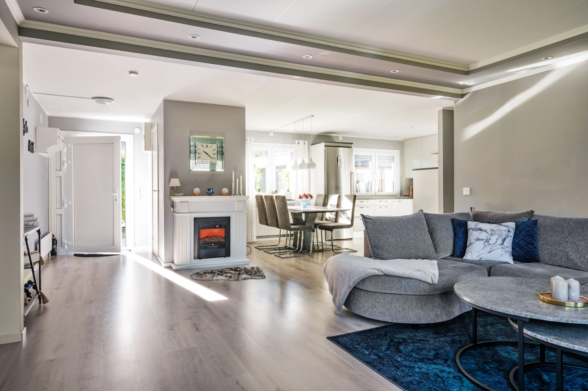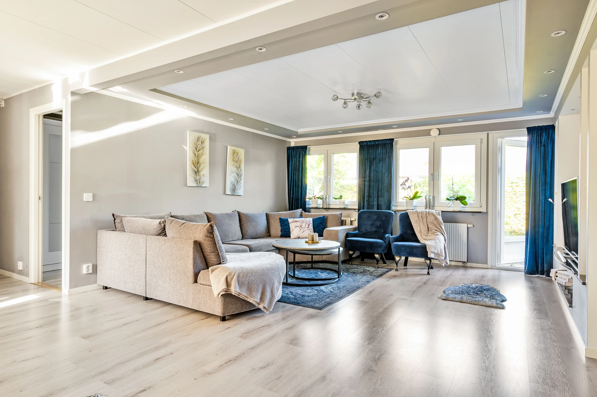Plats till stor soffa, fönster och altandörr gör rummet ljust. Spotlights i taket ramar in rummet.