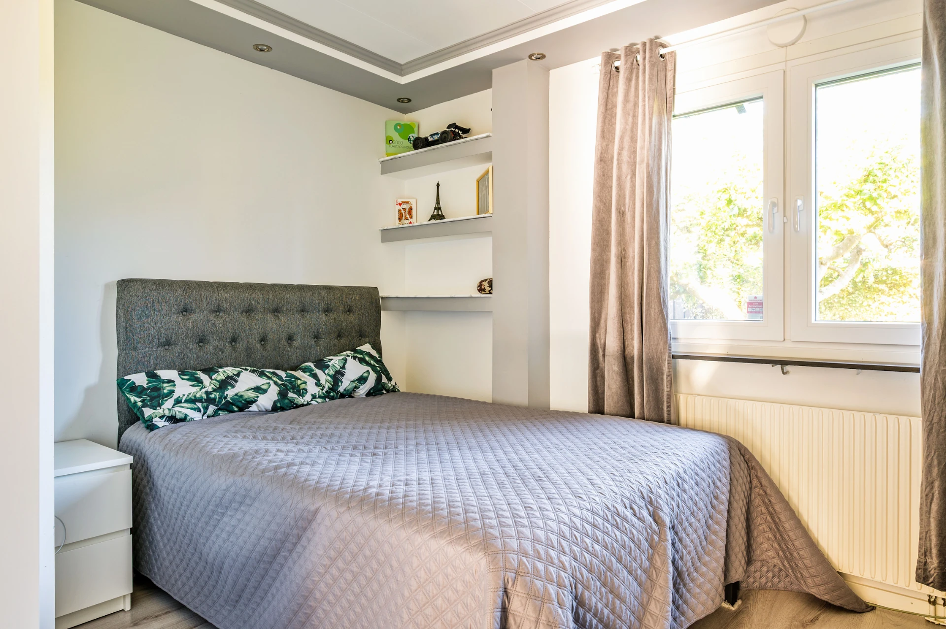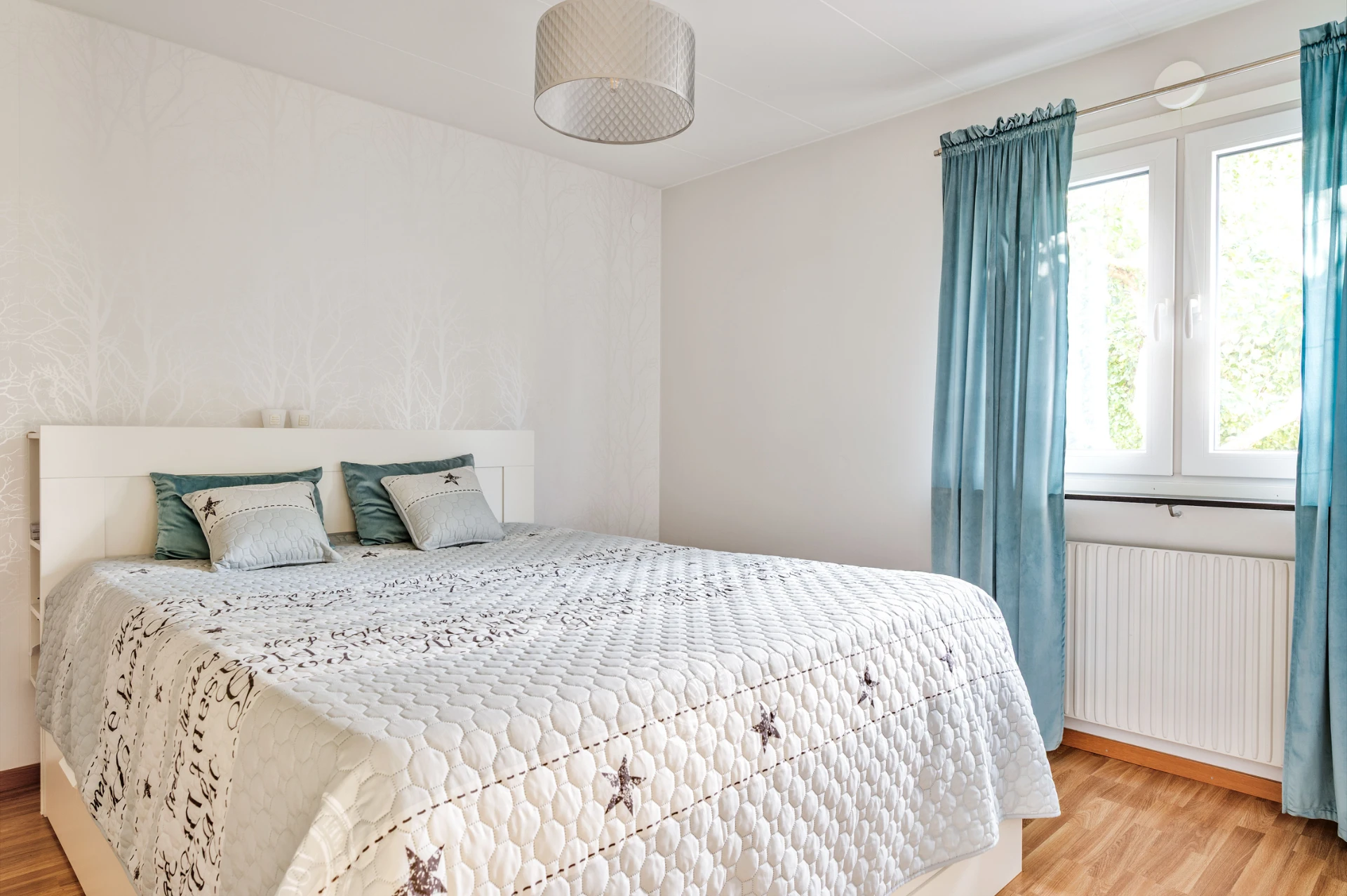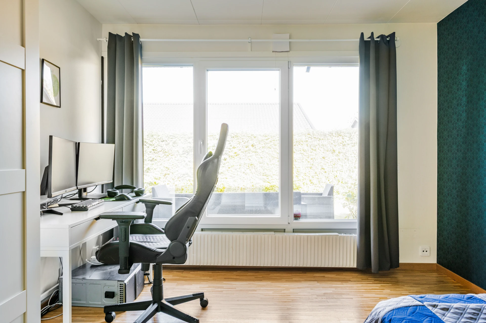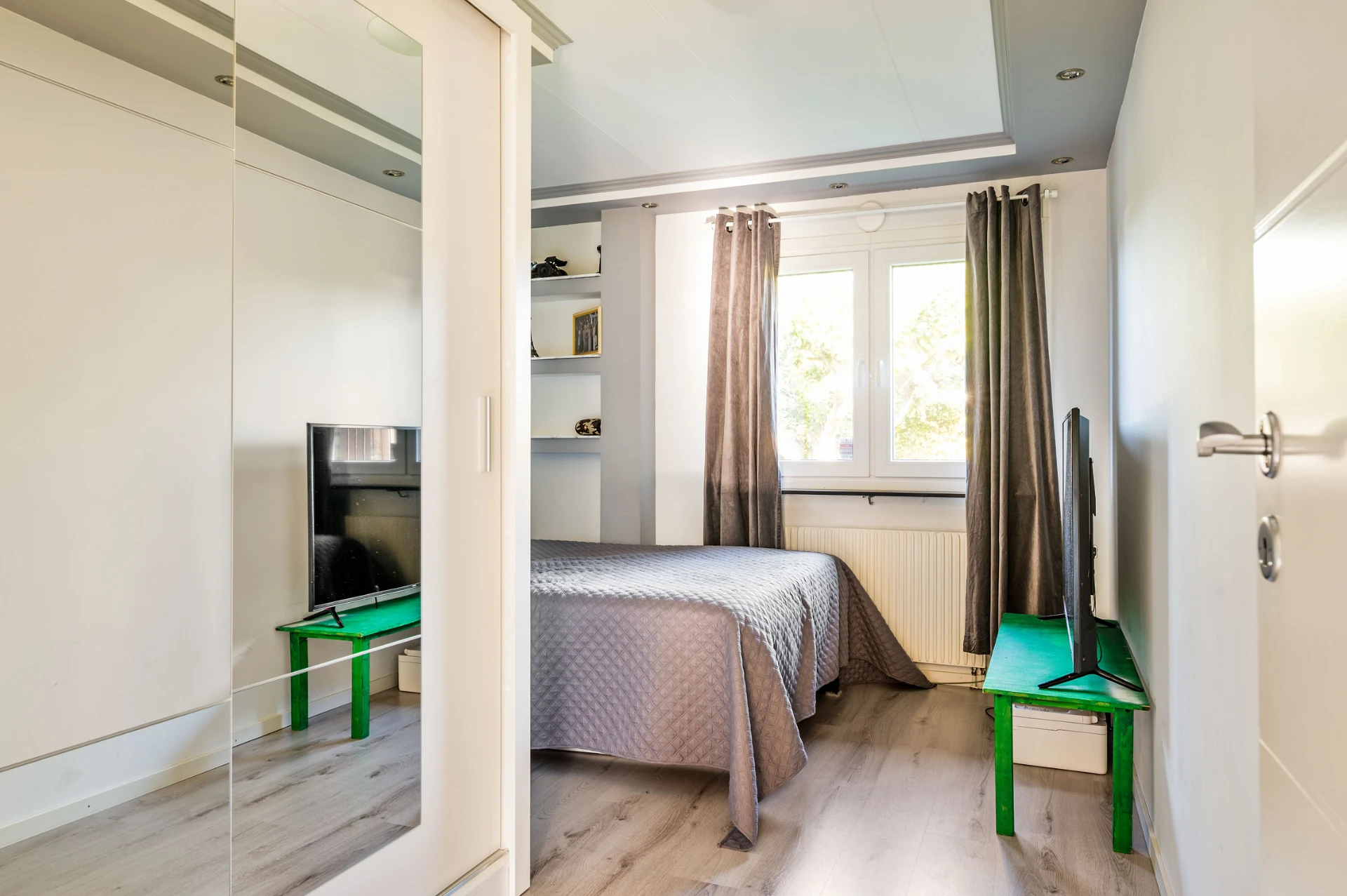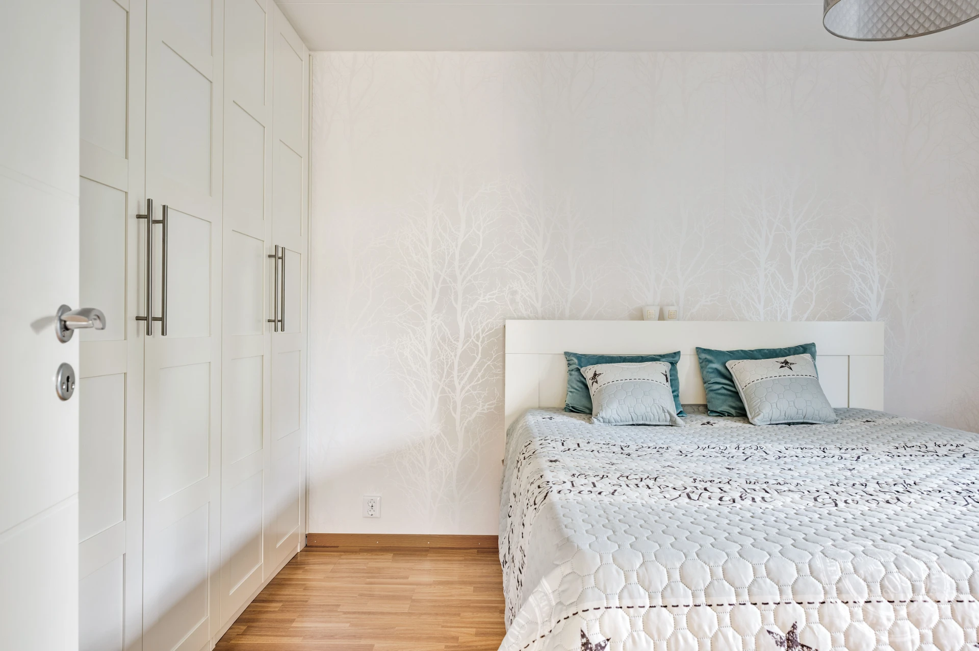 Plats till dubbelsäng, fönster, vita tapetserade väggar, parkettgolv, bra med förvaring i garderober längst väggen.
