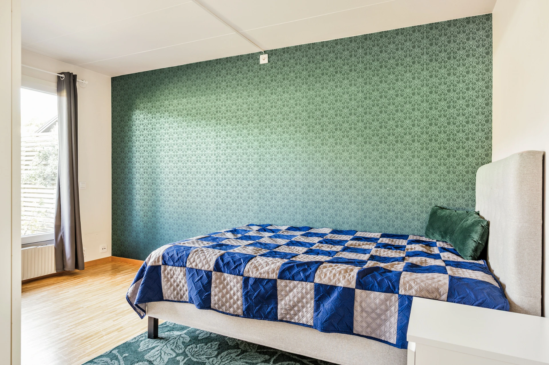 Rymligt med plats till dubbelsäng och andra möbler. Stort fönsterparti, grön fondtapet och parkettgolv.