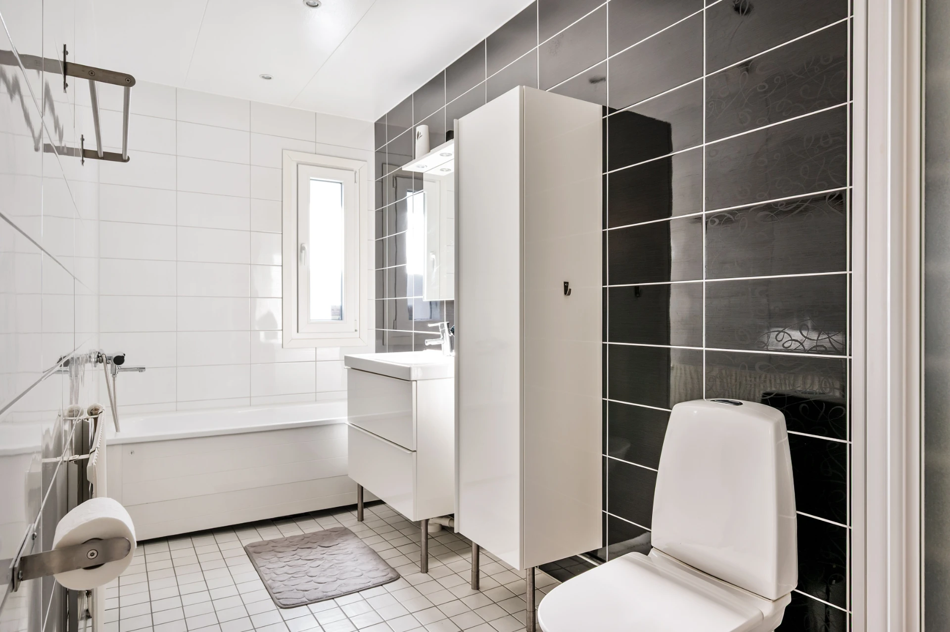 Helkaklat i vitt med svart fondvägg och ett fönster ovanför badkaret. Dusch, handfatskommod, spegel och badrumsskåp. Wc.