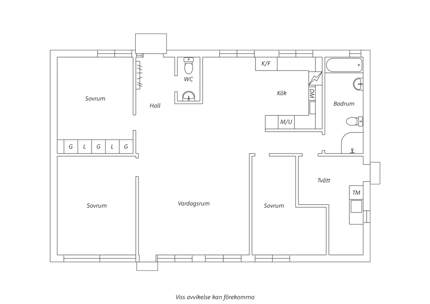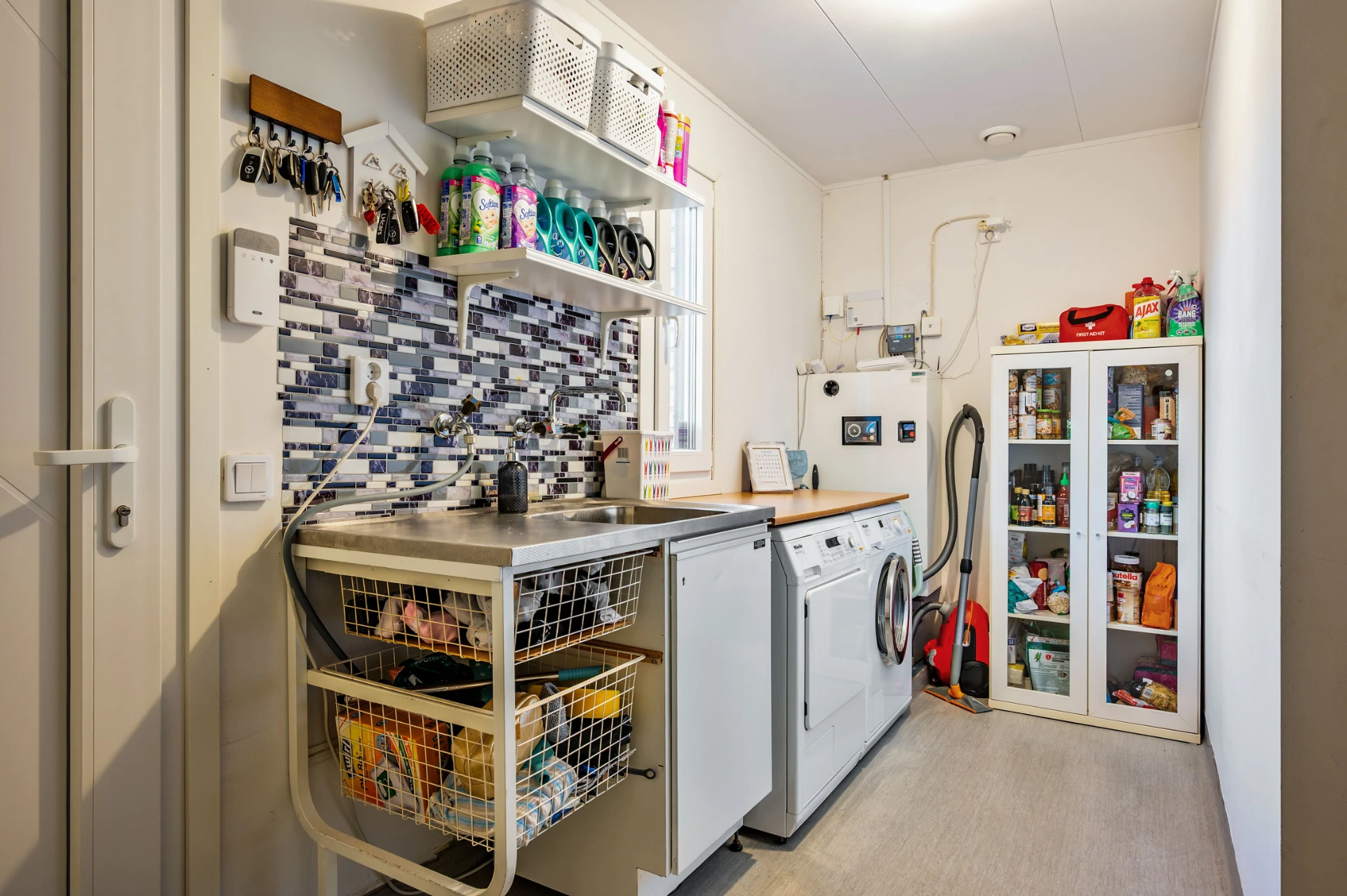 Rymlig med fönster och groventré. Tvättmaskin, torktumlare och tvättställ. Vita väggar och plastmatta.