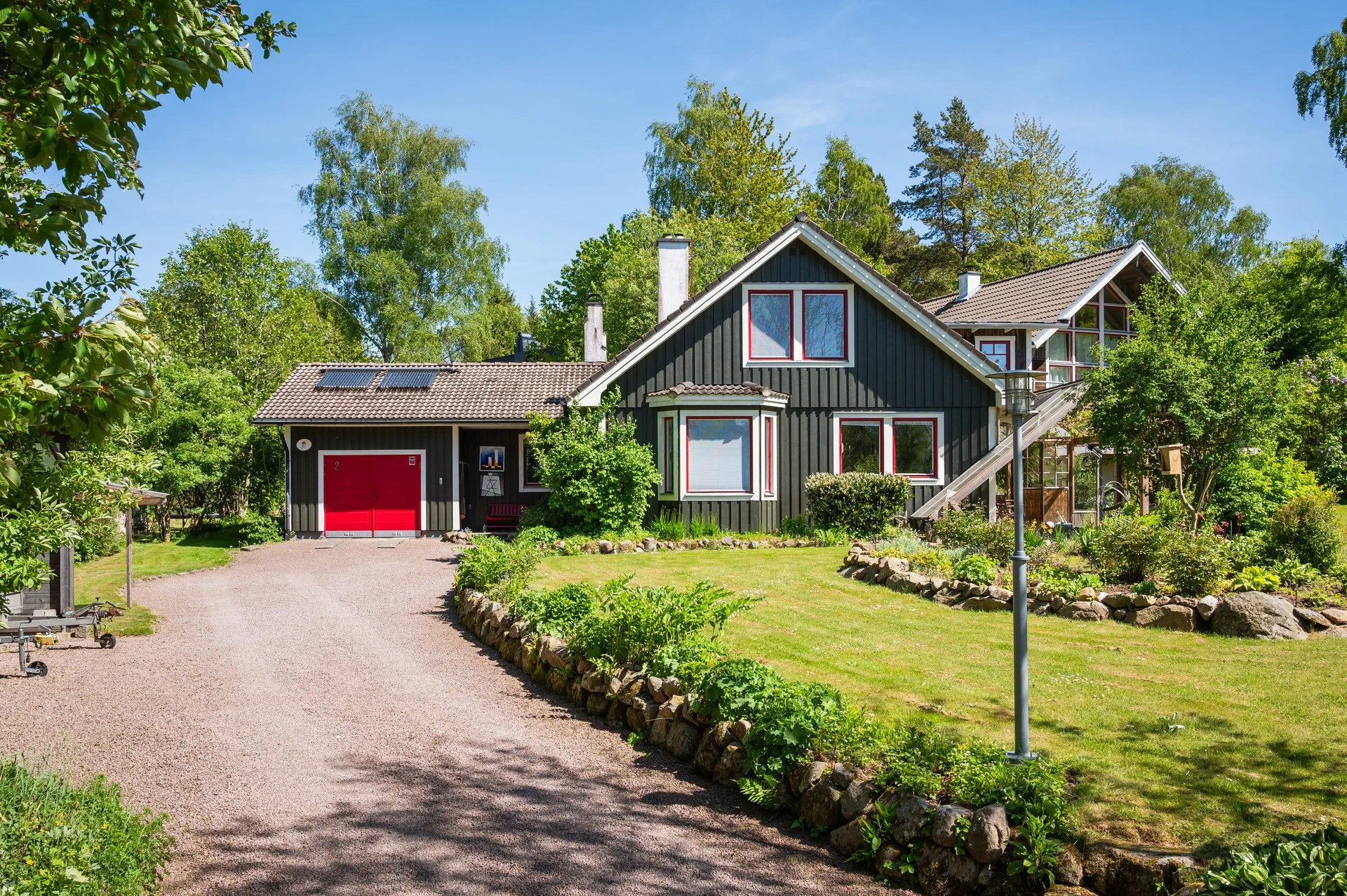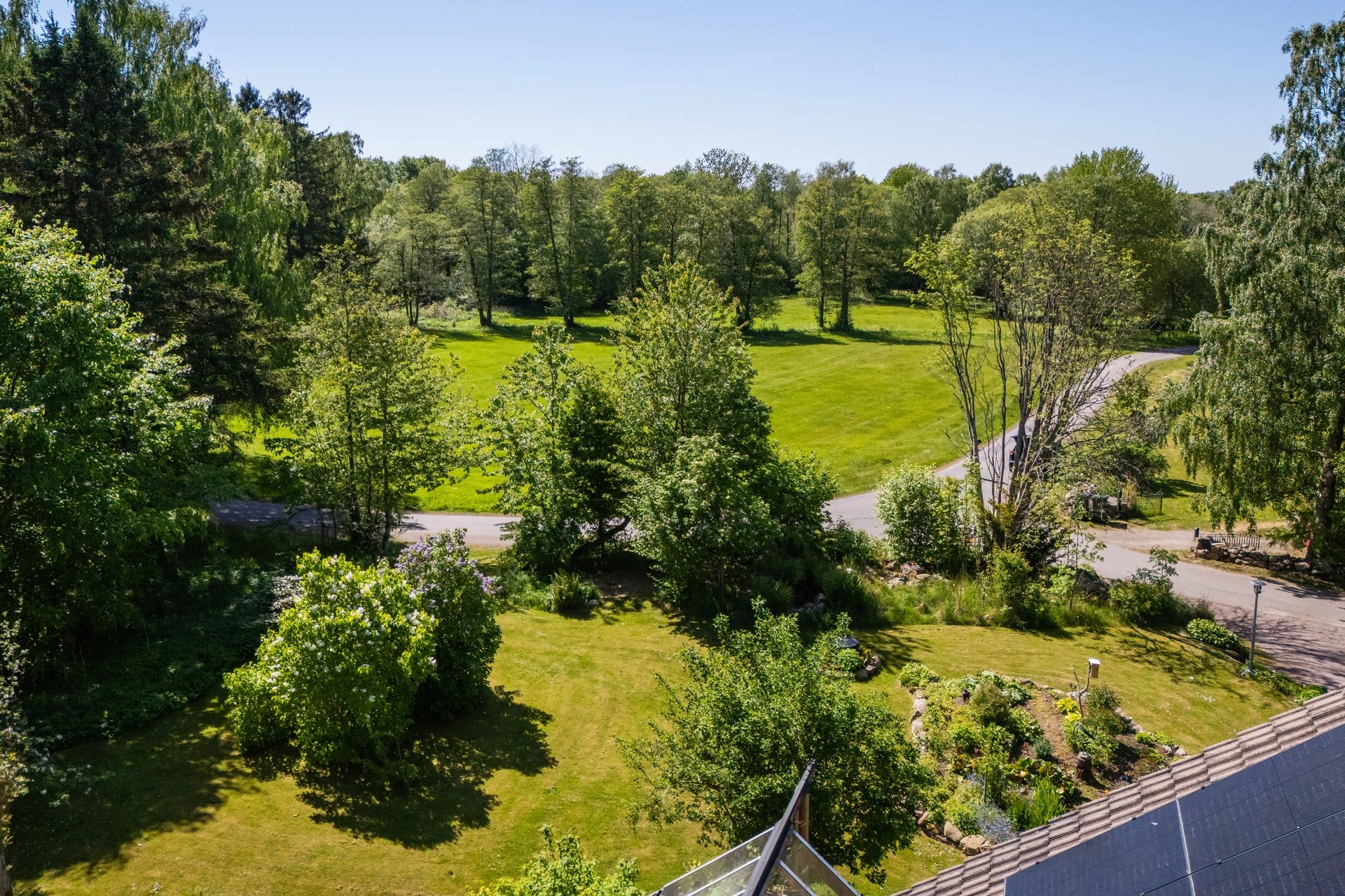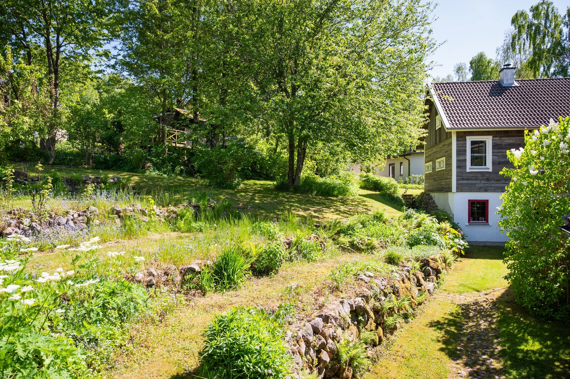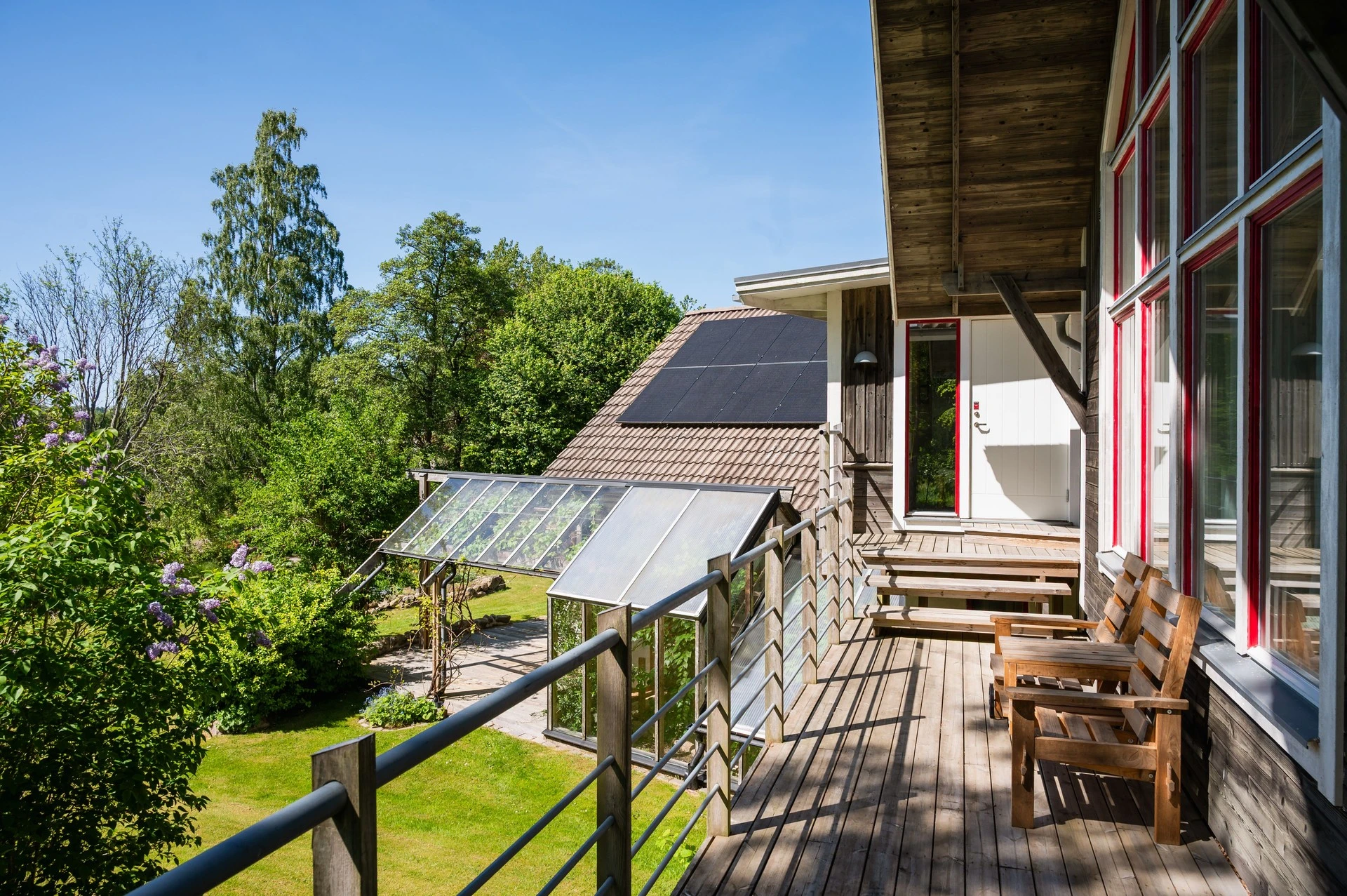 Trädgården är stor och lummig med buskar, träd, uteplatser och rabatter. Här finns även ett växthus med söderläge, en altan och en balkong med västerläge. Fastigheten har solfångare, solceller och fiber, samt en vedpanna och värmepump för effektiv uppvärmning.