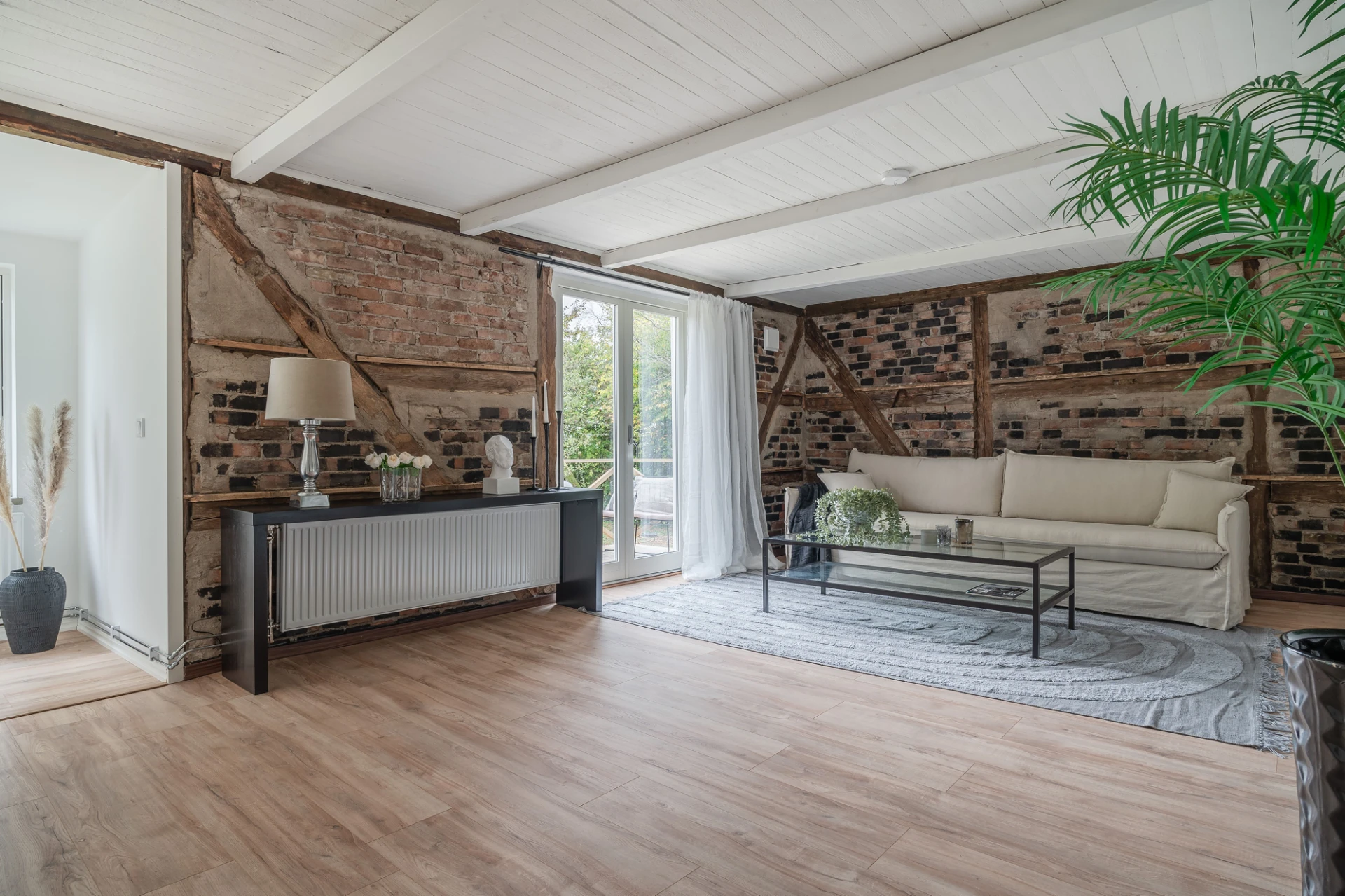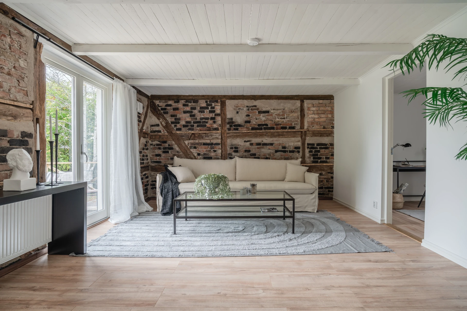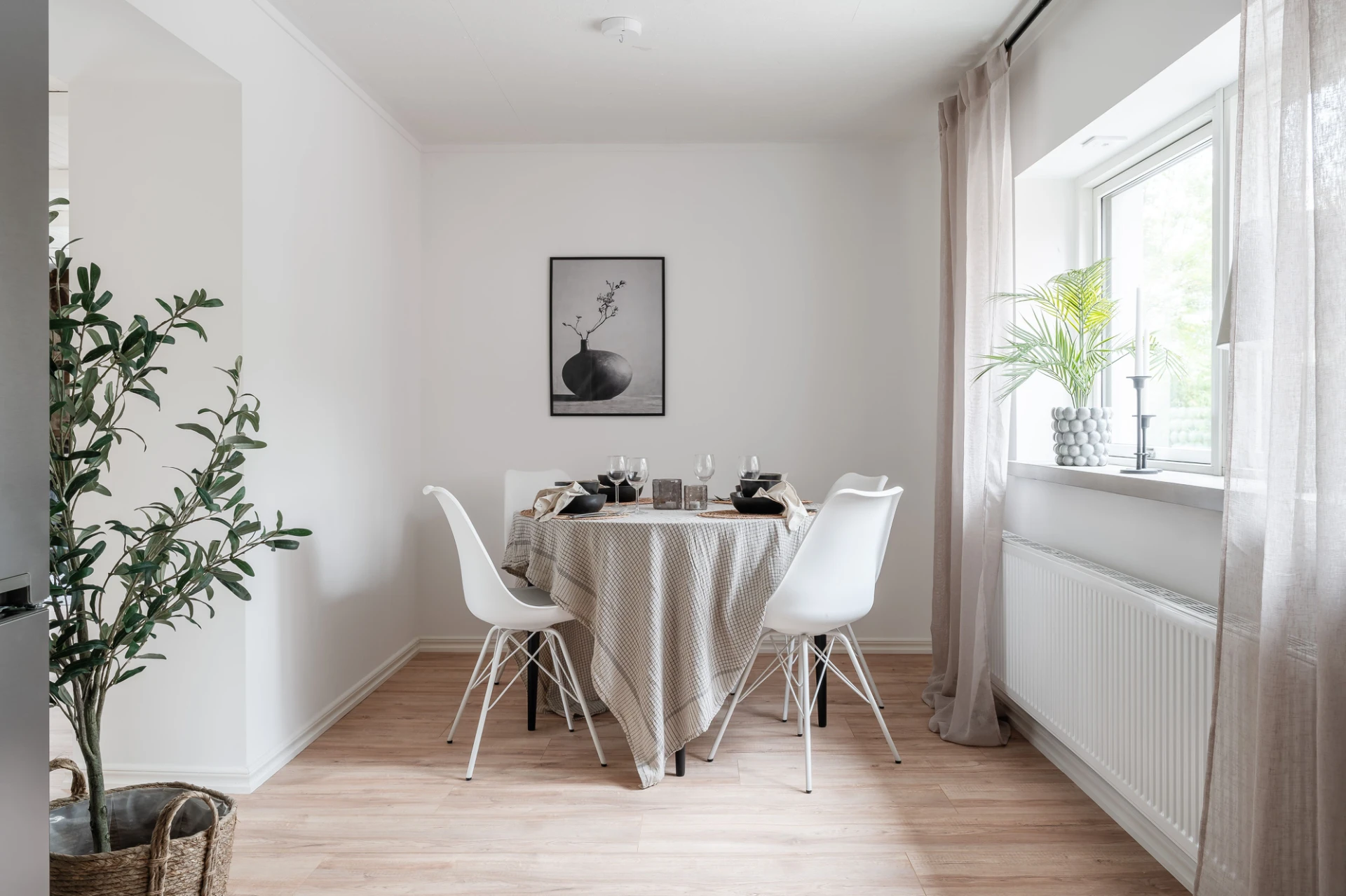 Ett luftigt och stilrent vardagsrum med högt i tak och stora fönster som släpper in rikligt med naturligt ljus. Rummet erbjuder gott om utrymme för både soffgrupp och matsalsmöbel, perfekt för sociala tillställningar.