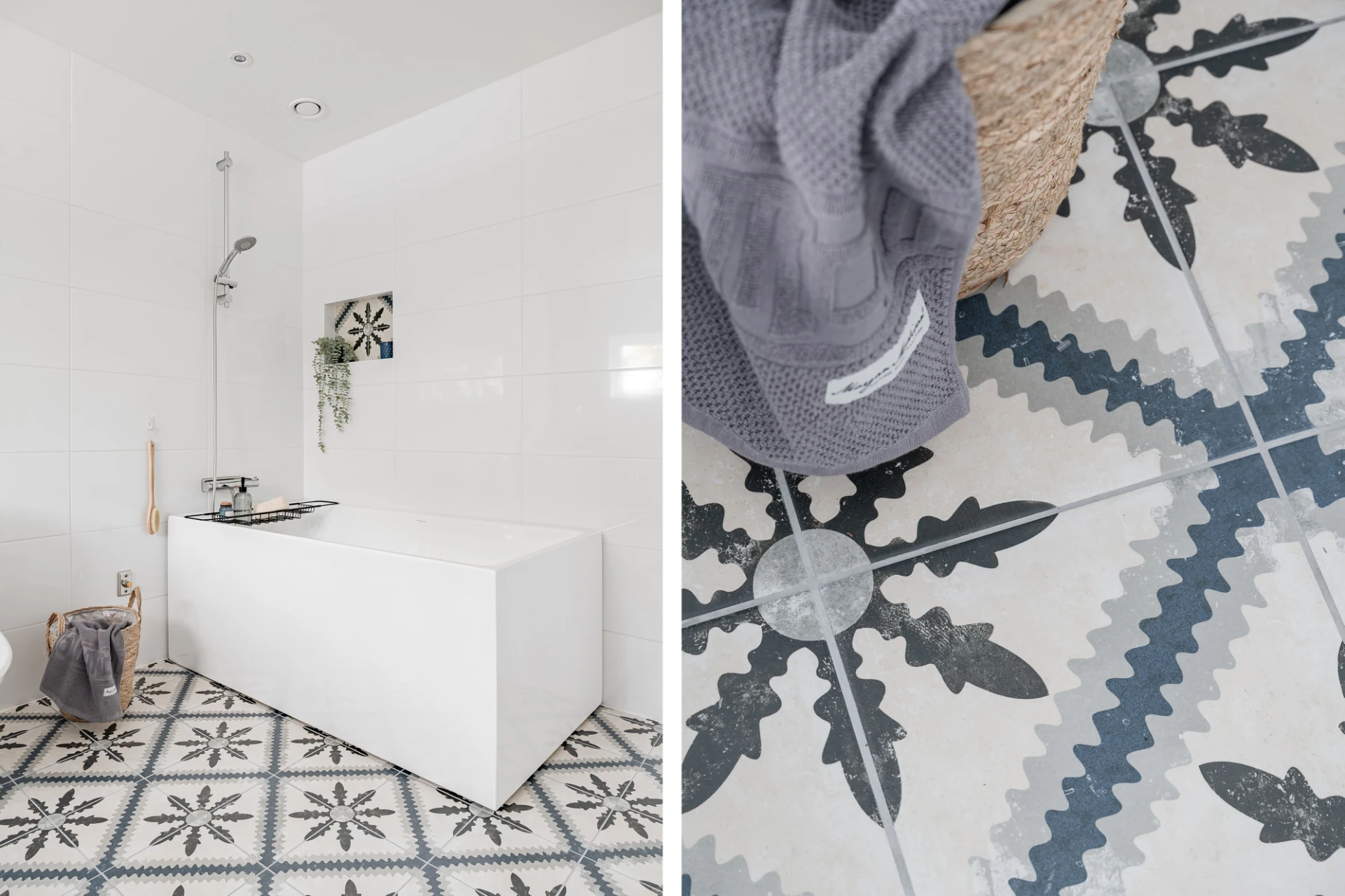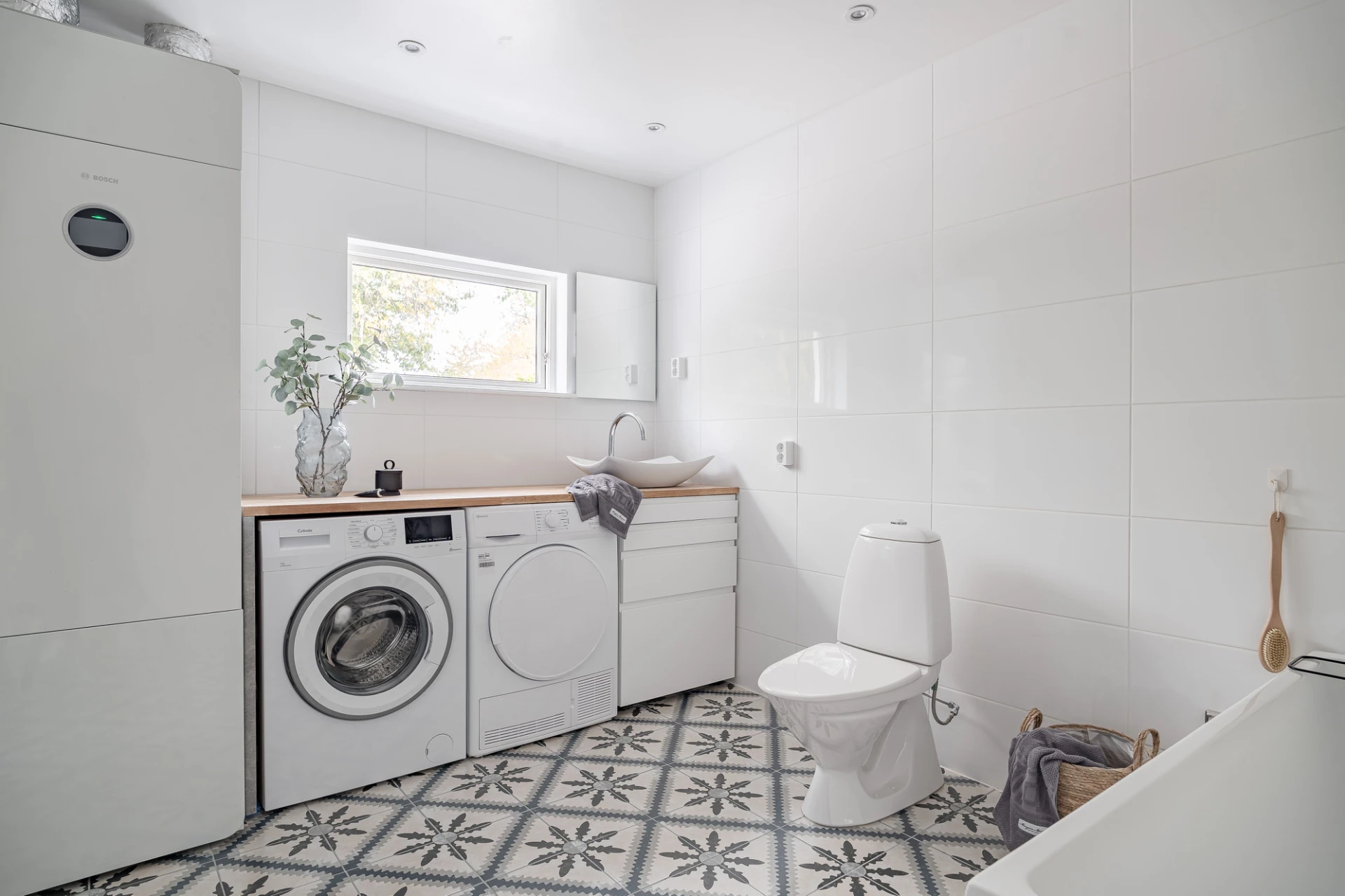 Ett stilrent badrum med moderna ytskikt, badkar, WC och handfat. Funktionellt och lätt att hålla rent. En praktisk tvättstuga med tvättmaskin, torktumlare och arbetsyta.