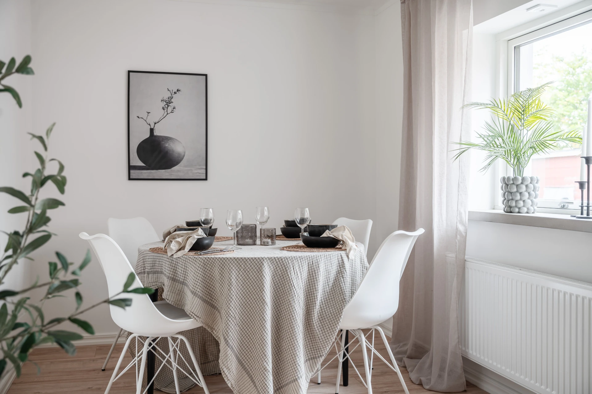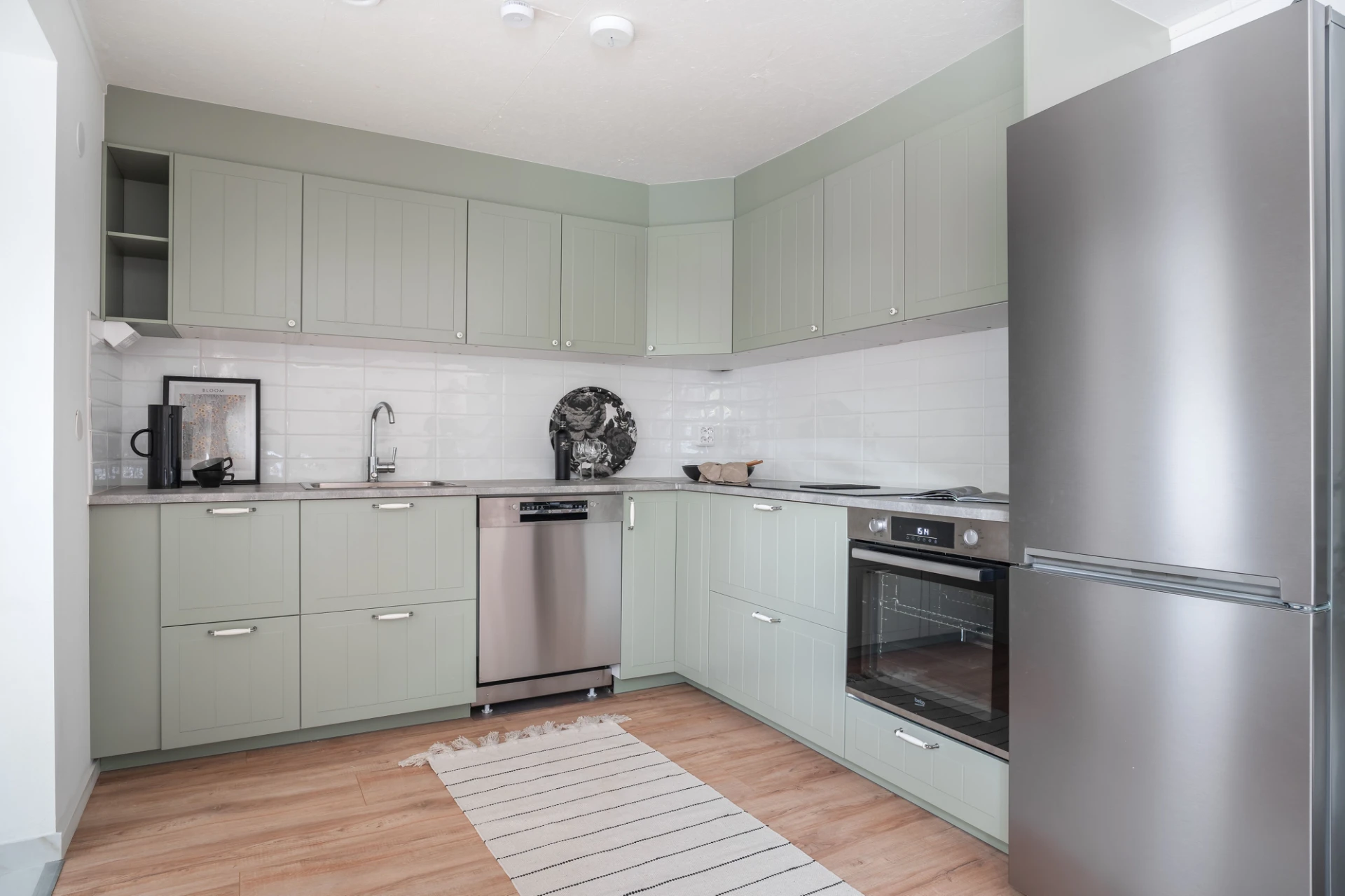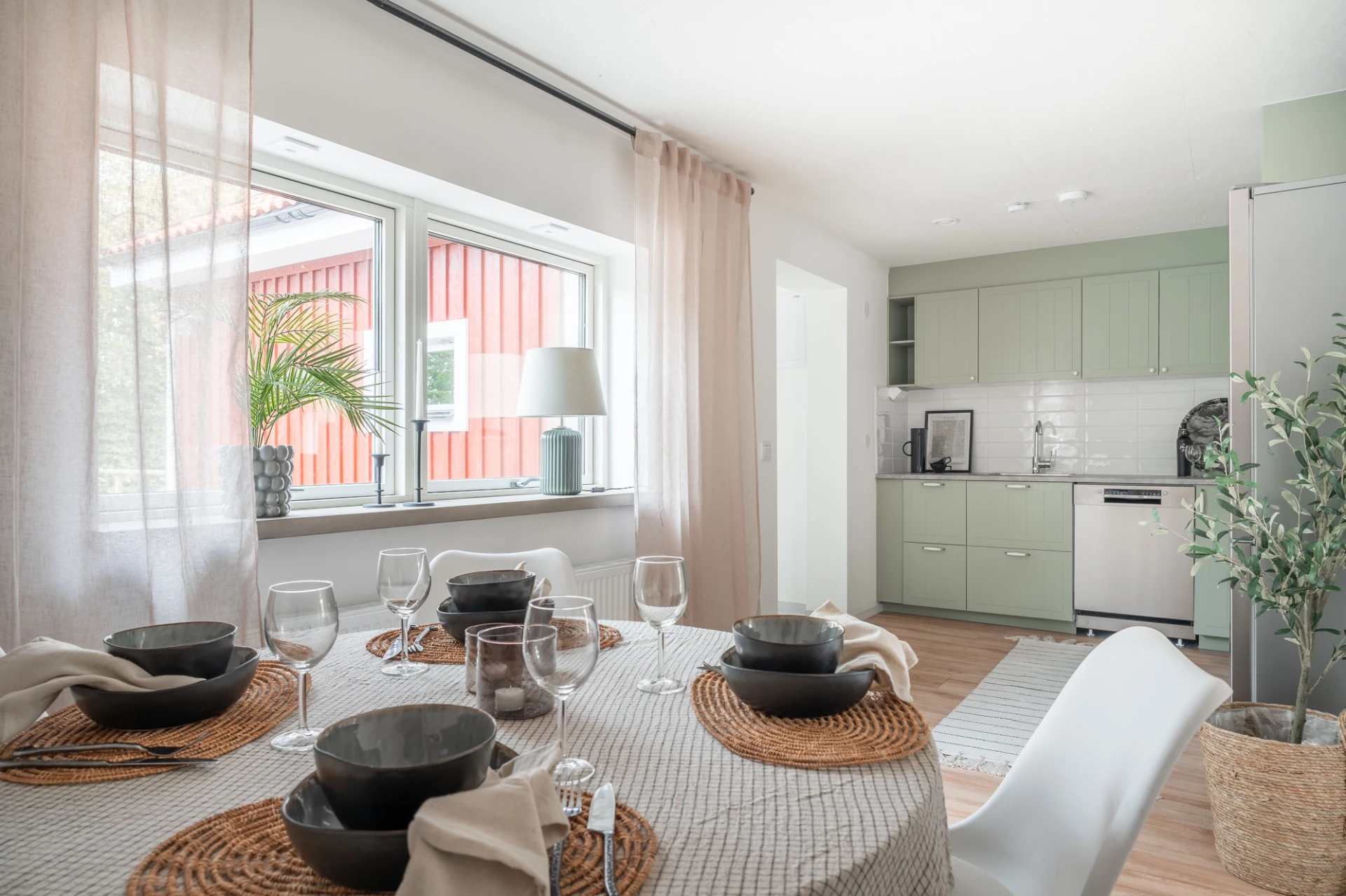 Ett nyrenoverat och modernt kök med smakfulla materialval och funktionella lösningar. Här finns plats för en större matgrupp, vilket gör det till en självklar samlingspunkt för familj och vänner.