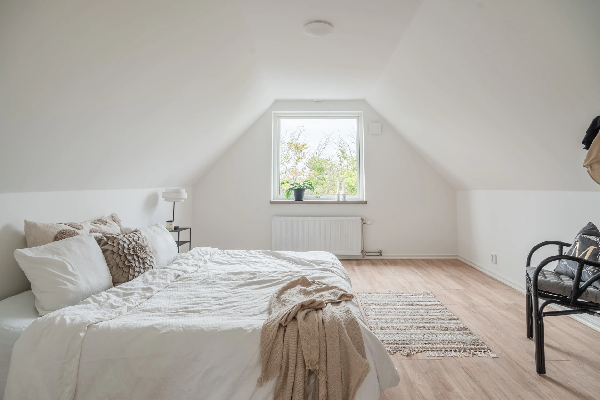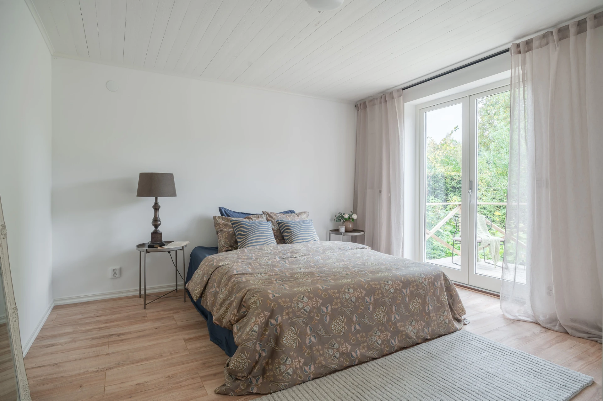 Ett ljust och rymligt sovrum med plats för dubbelsäng och förvaringsmöbel. Fönster mot trädgården ger ett lugnt och privat läge.