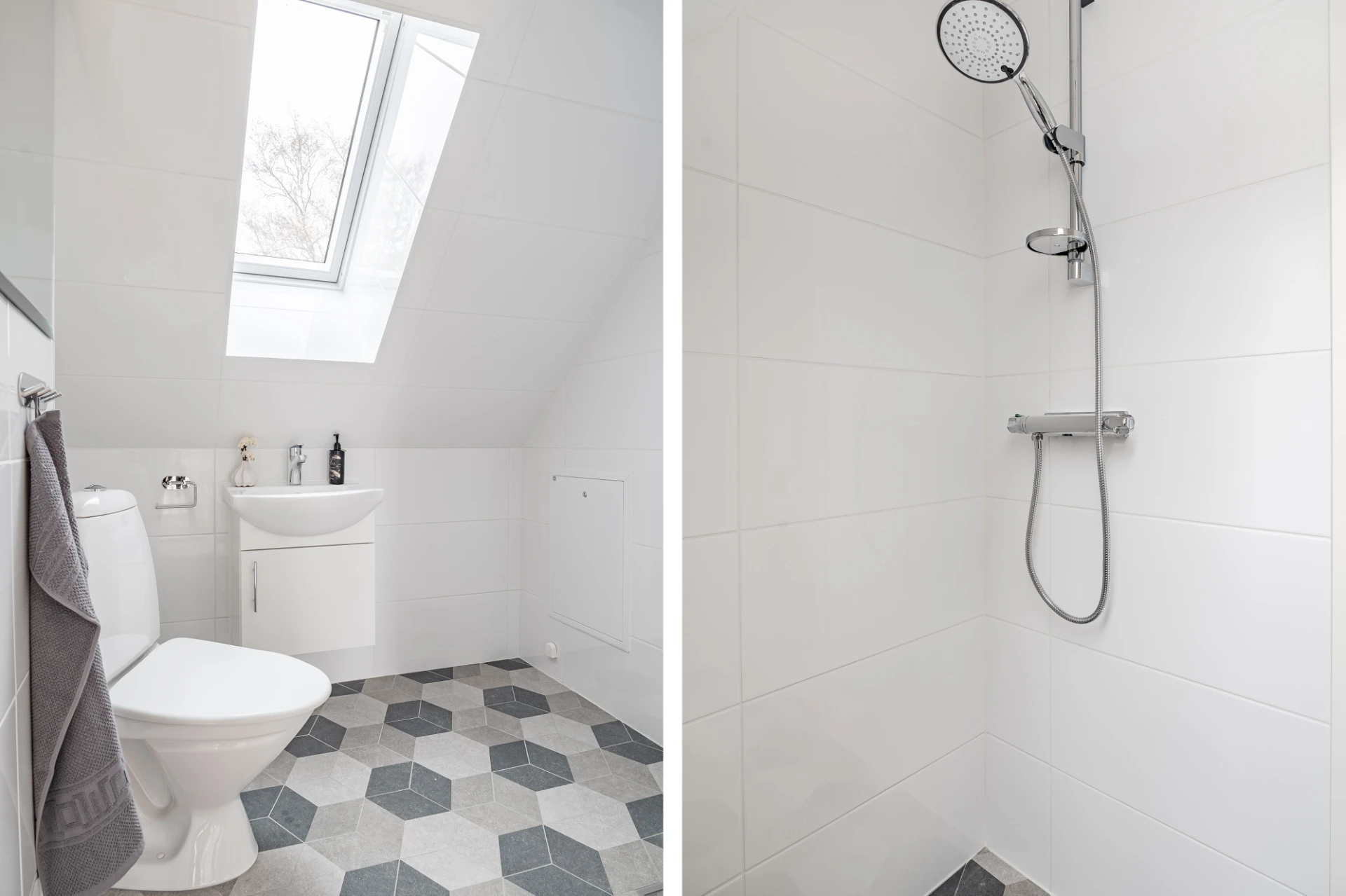 Ett stilrent badrum med moderna ytskikt, dusch, WC och handfat. Funktionellt och lätt att hålla rent.