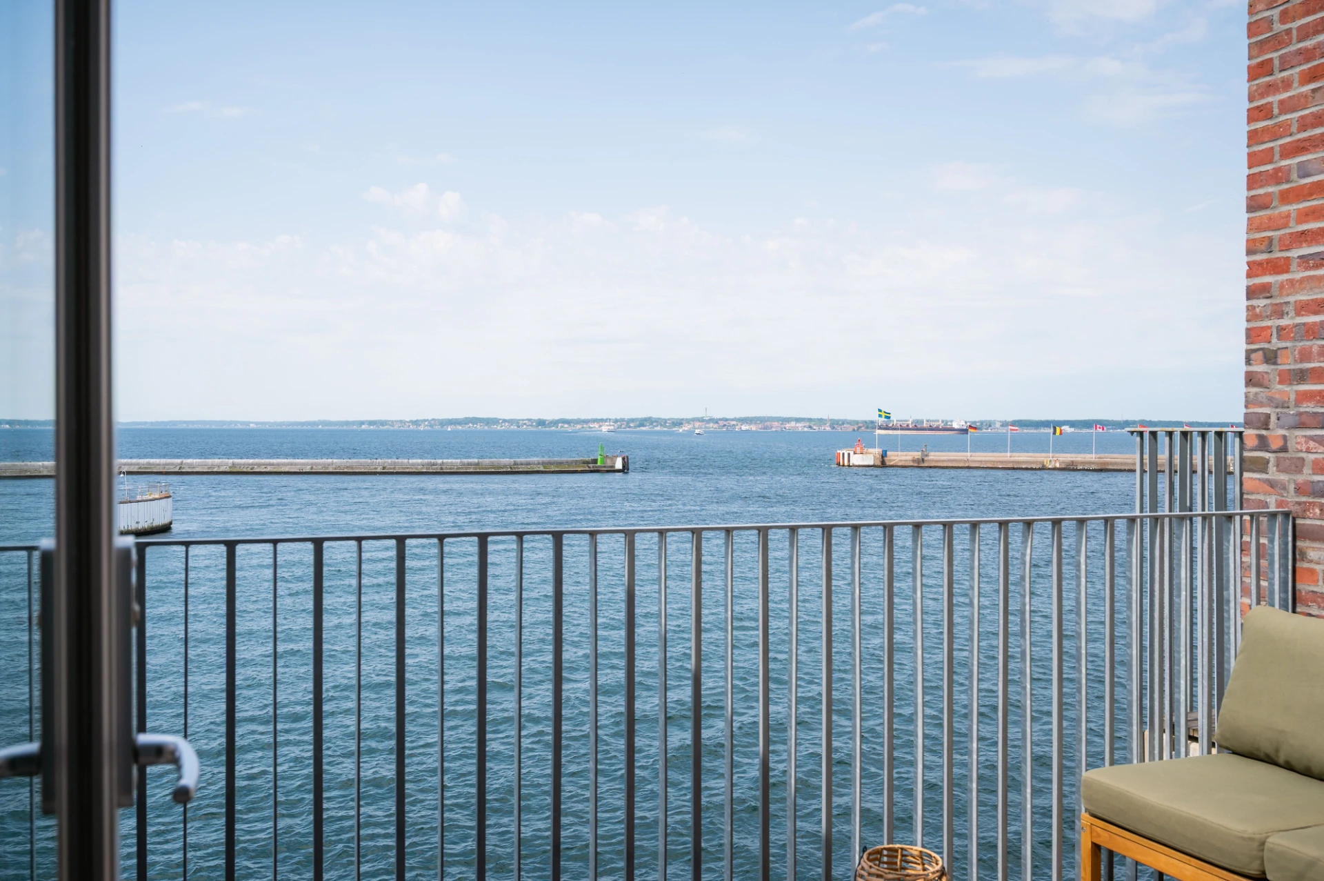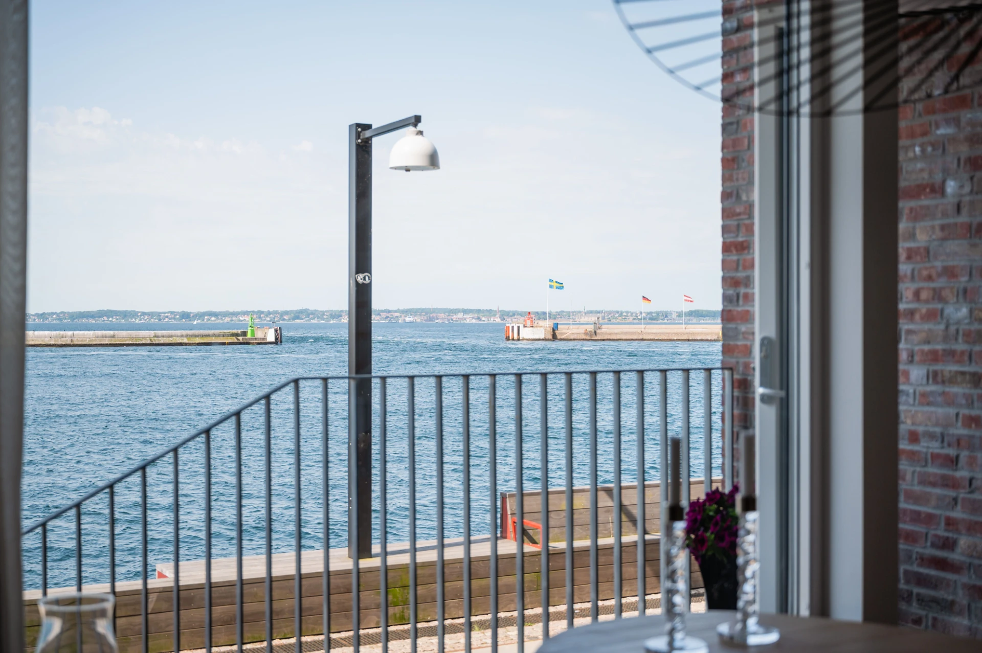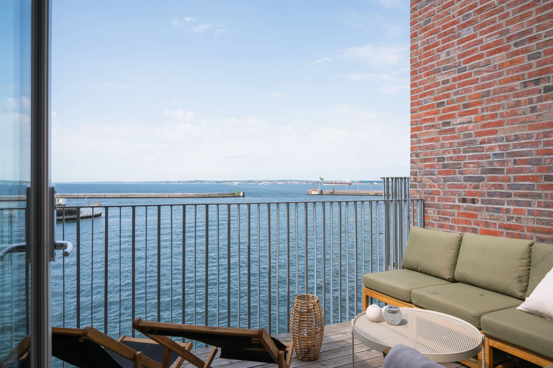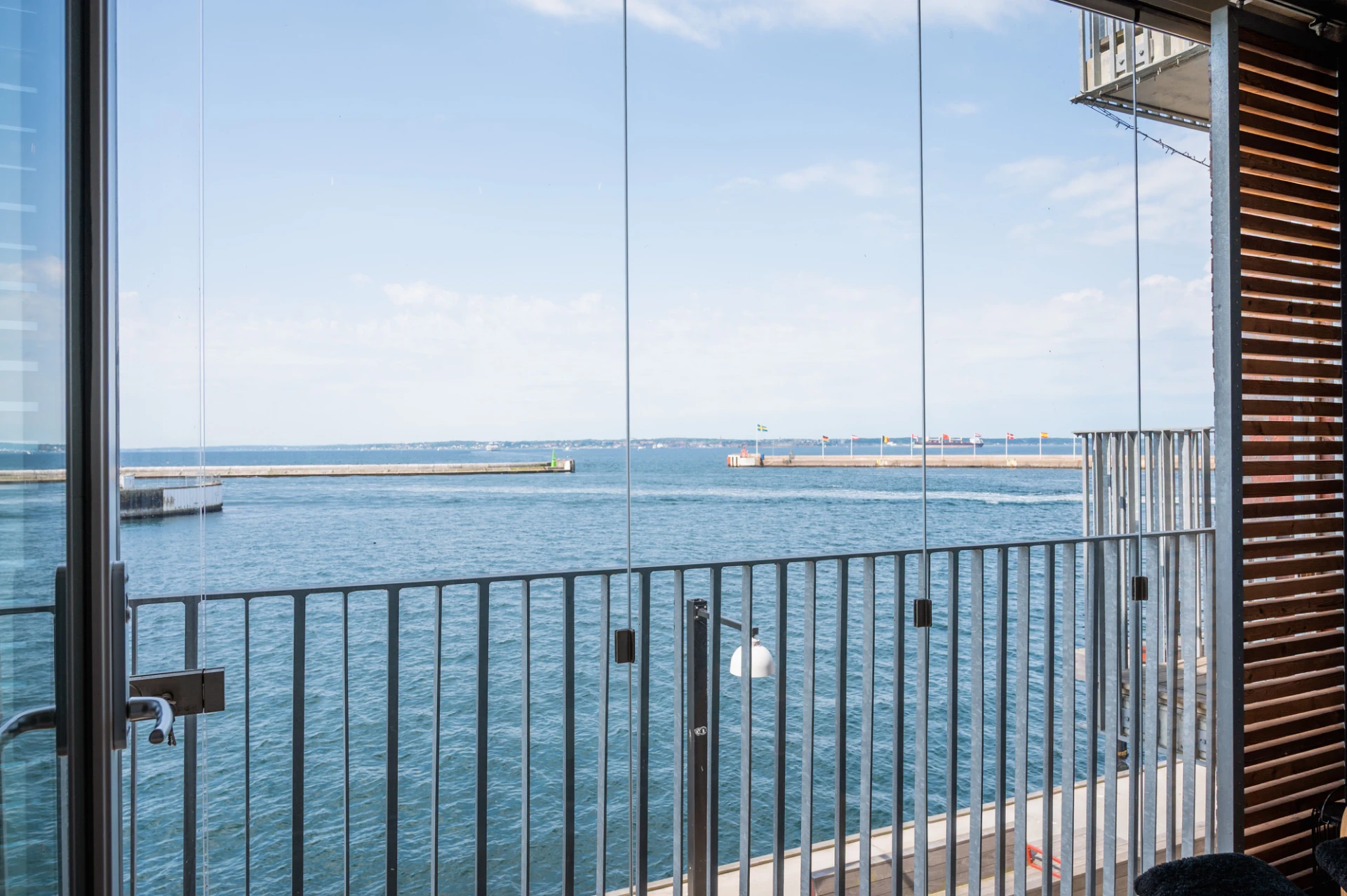 Full sundsutsikt, öppningsbar inglasning, stålräcke, trägolv och skjutbara solskyddspaneler.