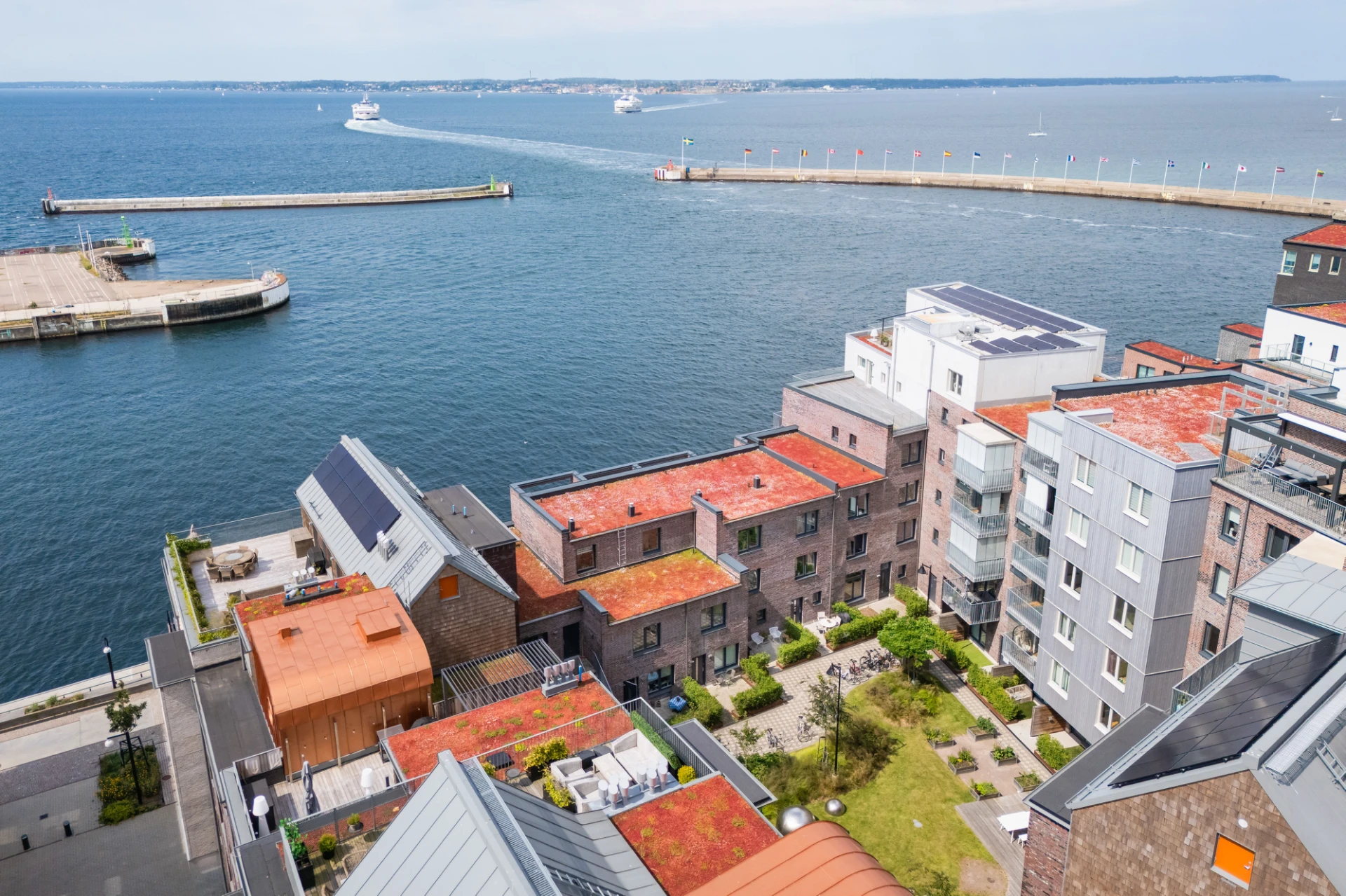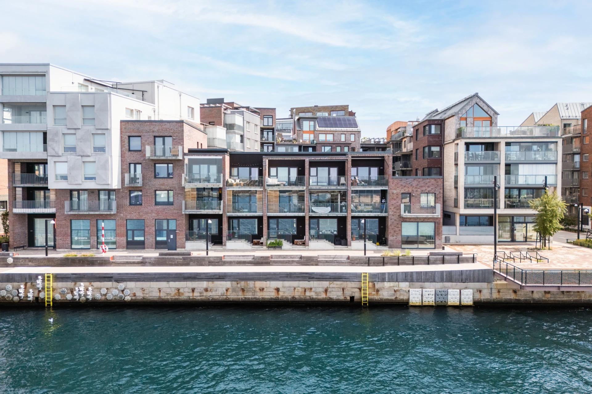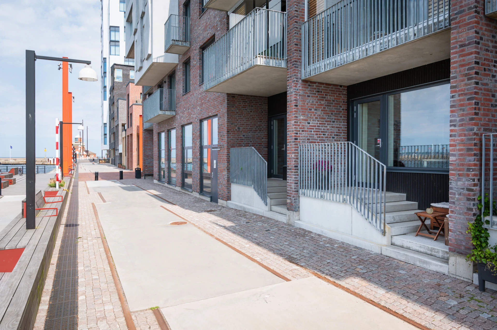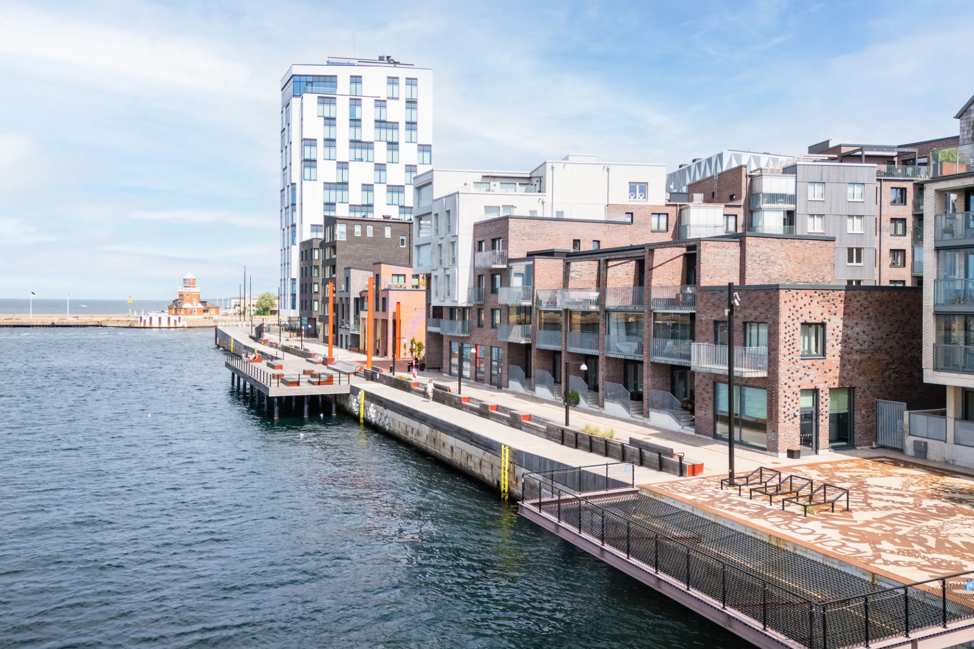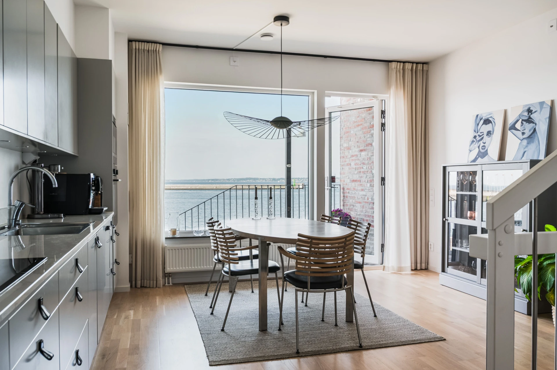 Ljusgråa luckor, ljus bänkskiva i sten, stänkskydd i sten och svart spishäll med matchande fläkt. Integrerad diskmaskin samt ugn och mikro i arbetshöjd. Ytterst trevlig matbordsplats vid stort fönster med utsikt över havet och Danmark. Altandörr leder ut till öppen balkong med plats till mindre möblemang. En härlig kajpromenad i oceanhamnen väntar via en trappa ner till kajen. Vita väggar och parkettgolv.