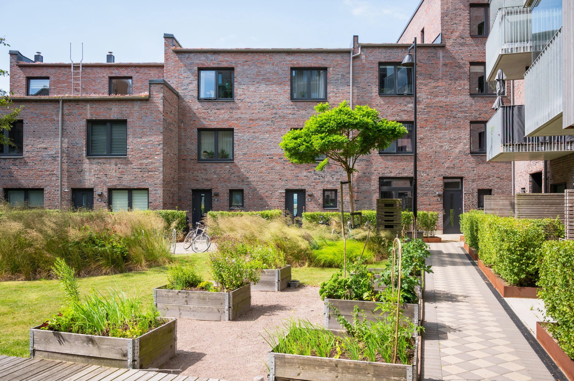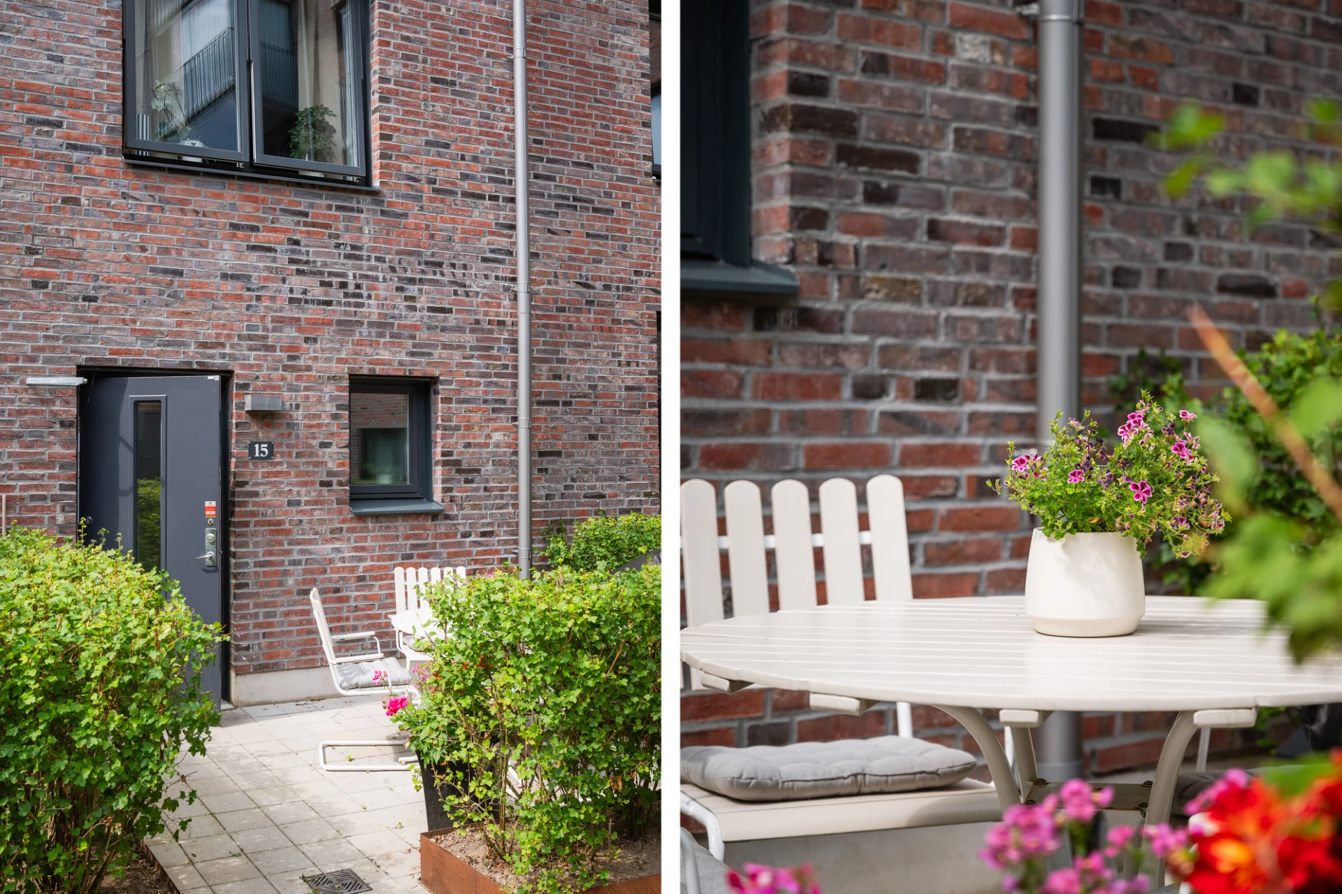 Ingång med privat dörr på innergården via stenlagd uteplats med morgonsol, plats till utemöblemang samt insynskyddande buskar.