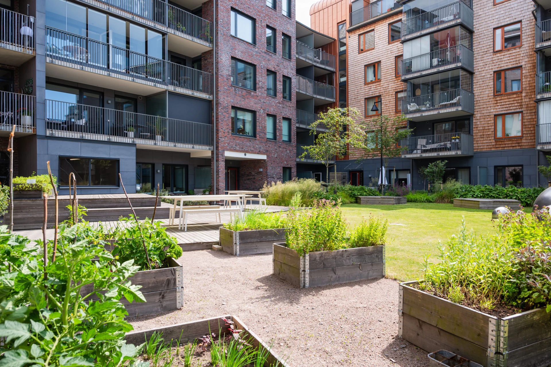 Föreningen har gemensam uteplats, gästlägenhet på innergården (300kr per natt) och gemensam takterrass.