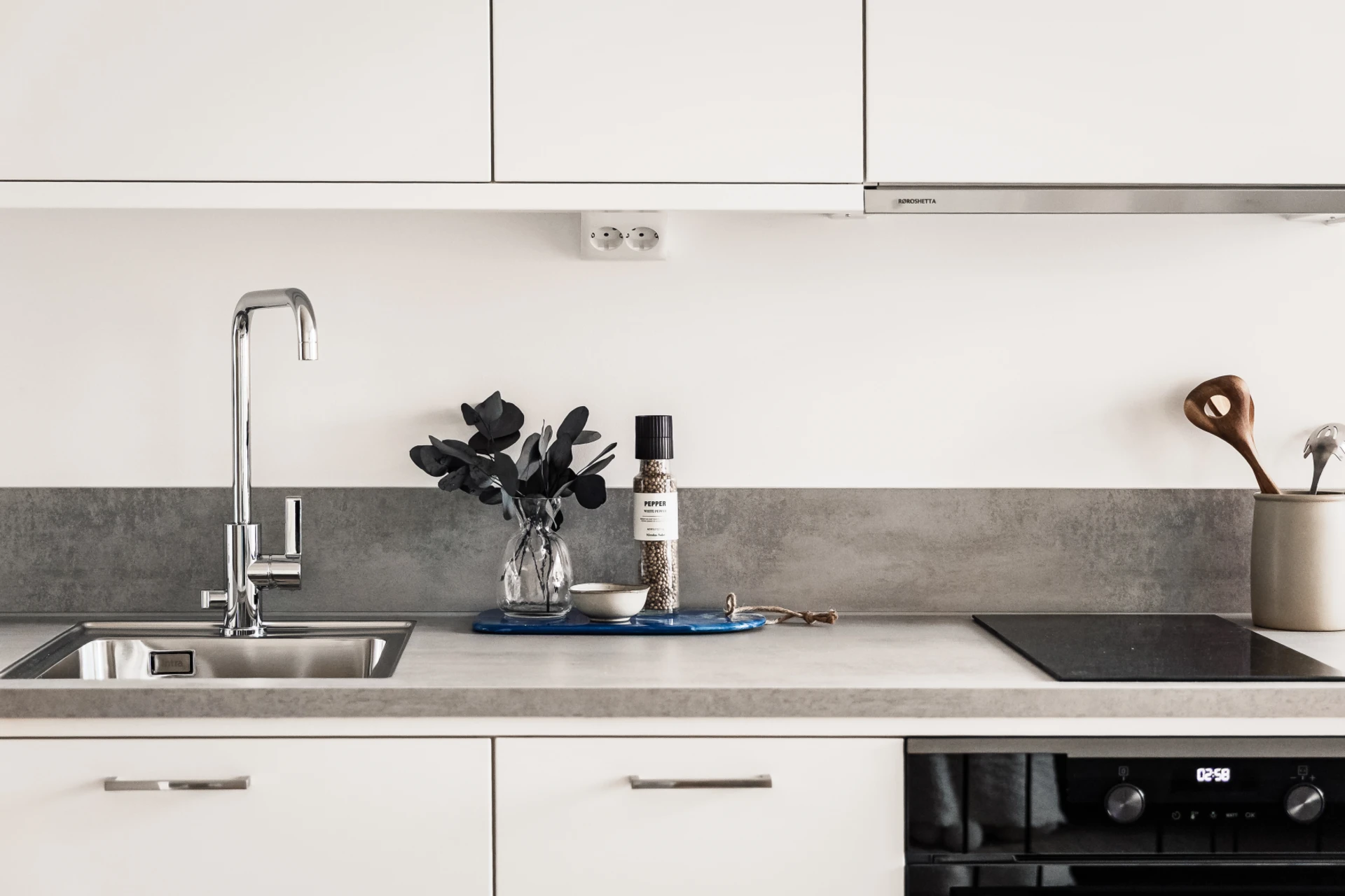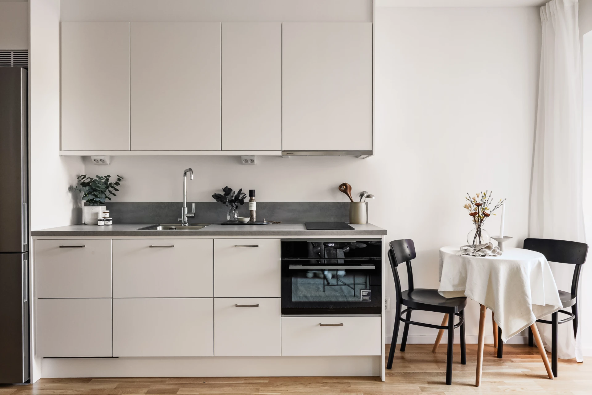 Kök från Marbodal i vit nyans, bänkskiva i ljuslaminat infälld häll och diskho, integrerad kombinerad ugn/mikro, diskmaskin och fristående kyl/frys.