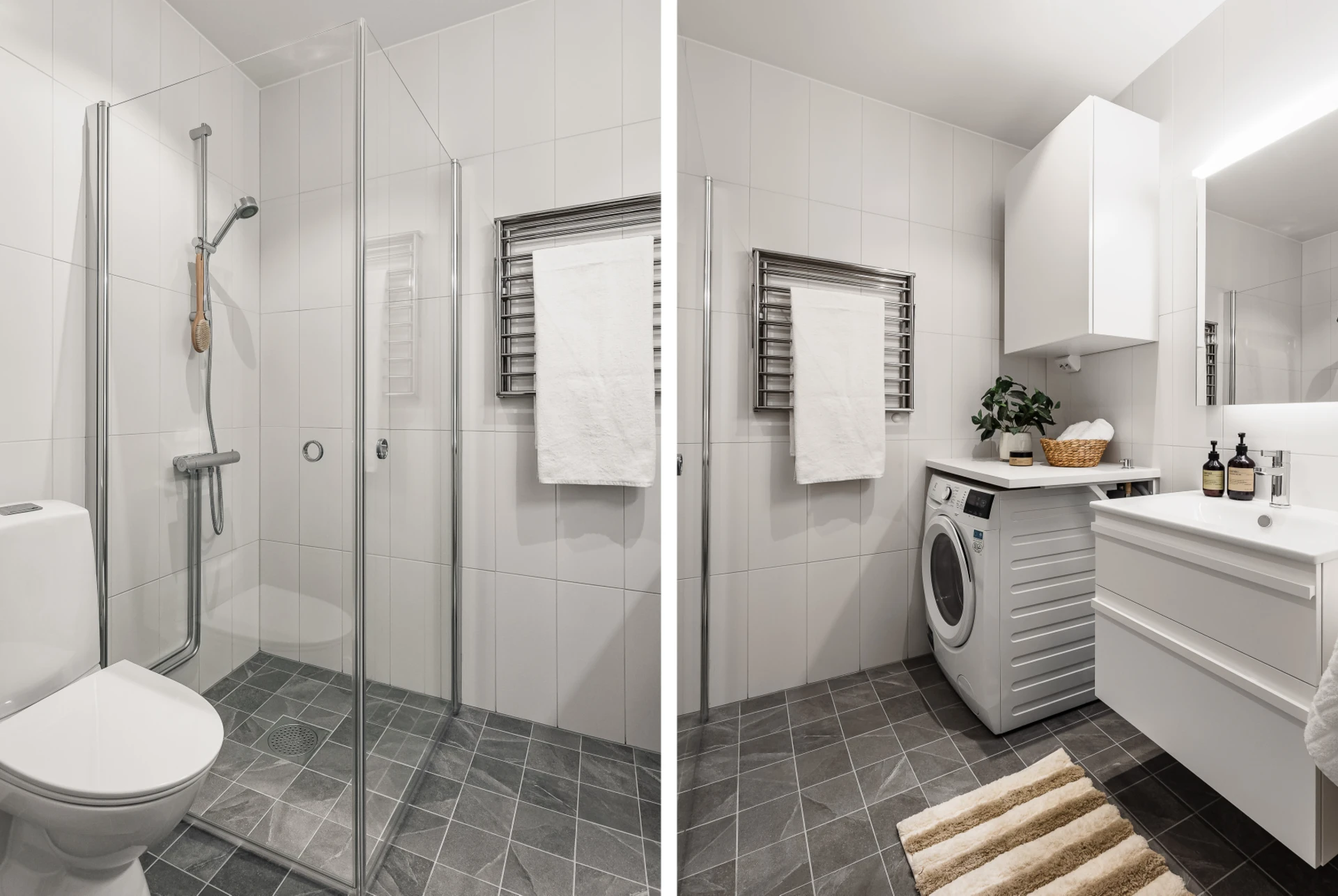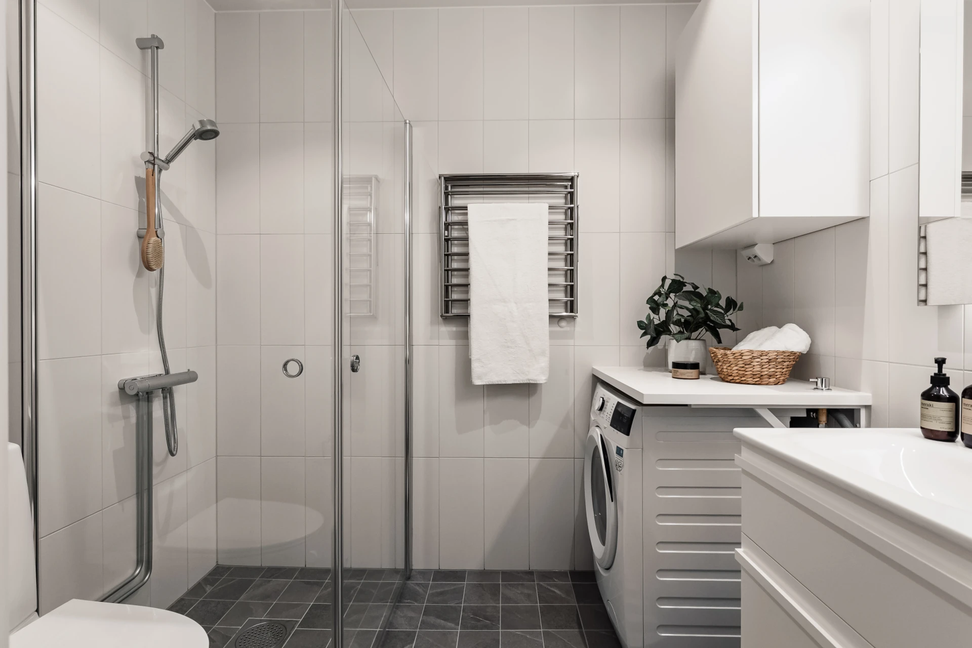 Klinker i mörk kulör på golv och kakel i vit nyans. Duschhörna med glasväggar, handfat, WC, torkställning och kombinerad tvättmaskin och torktumlare.