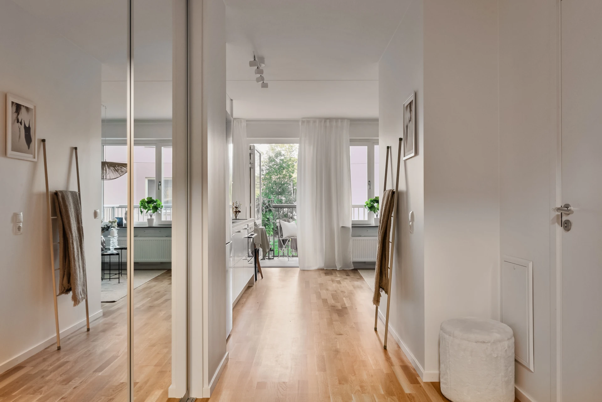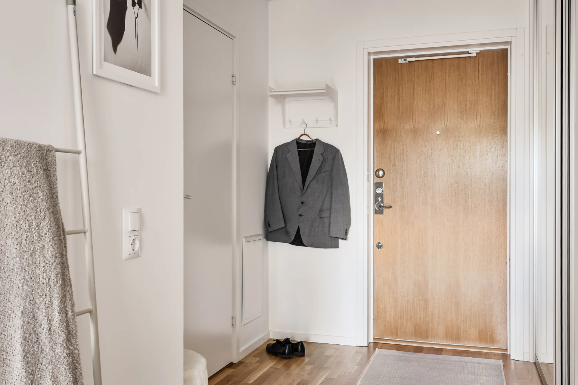 Parkettgolv och ljust målade väggar. Plats för avhängning i skjutdörrsgarderob och hatthylla. Ingång till badrum och övriga delar av bostaden.
