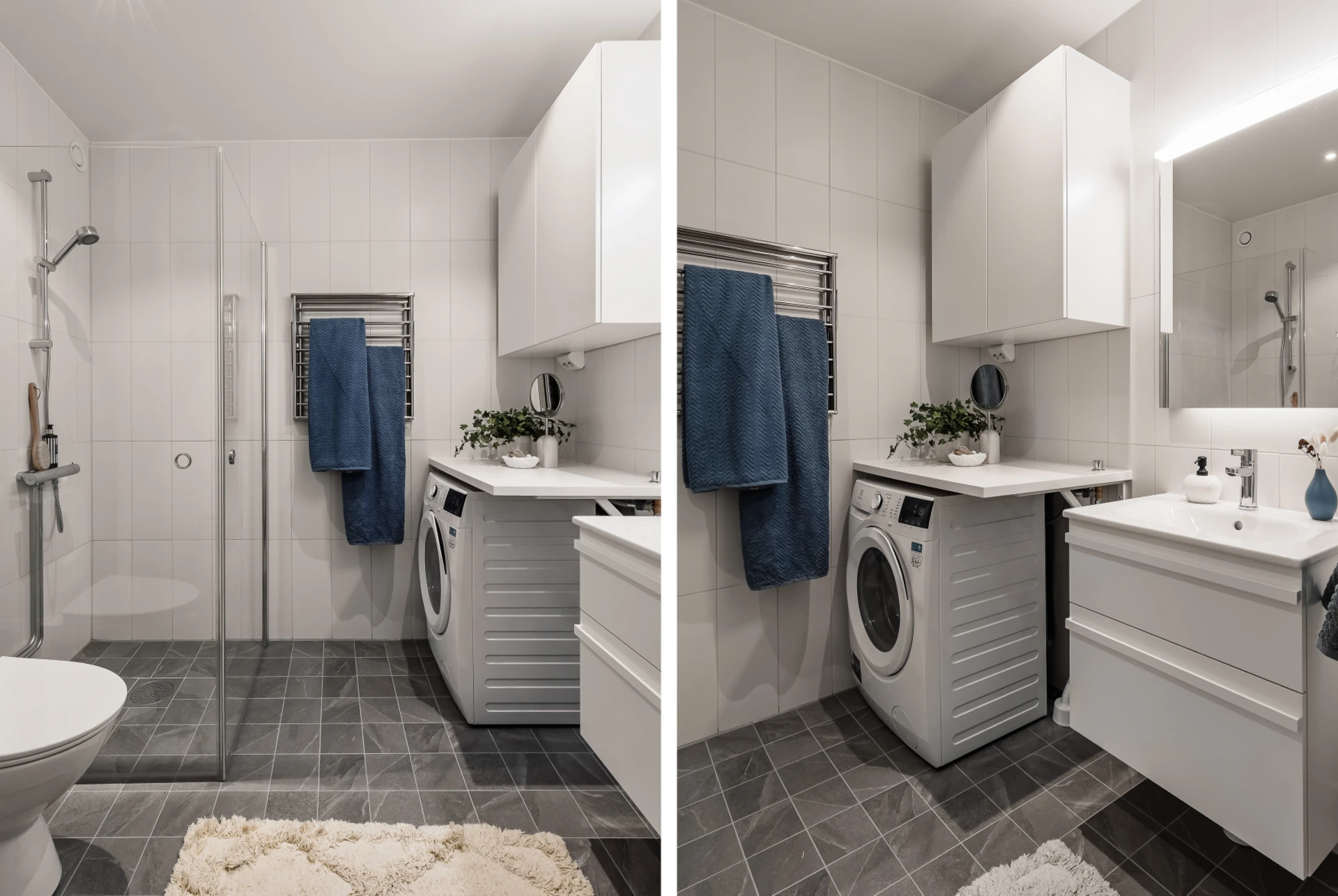 Mörkt klinker på golv och vitt kakel på väggarna. Duschhörna, handfat, WC, torkställning, kombinerad tvätt och torkmaskin.