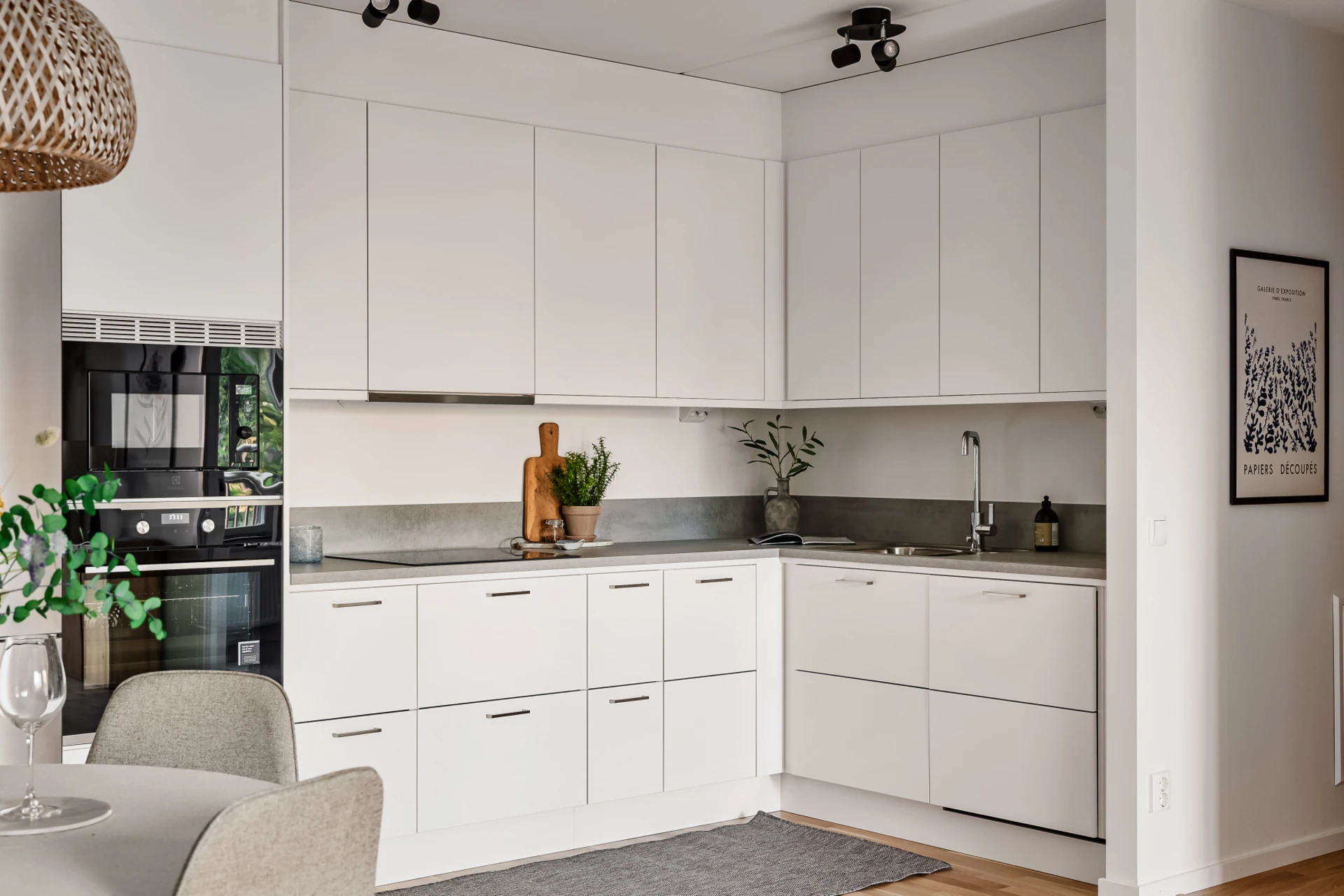 Parkettgolv och ljust målade väggar. Öppen planlösning till rum. Kök från Marbodal i vit nyans. Integrerad diskmaskin, ugn/mikro, K/F i rostfritt, laminat bänk med infälld diskho och spishäll.