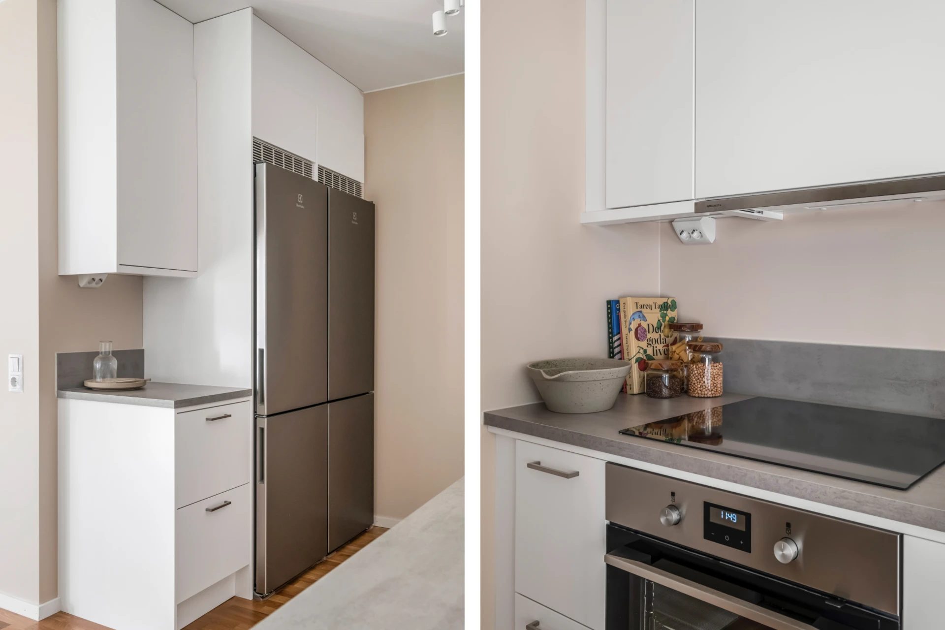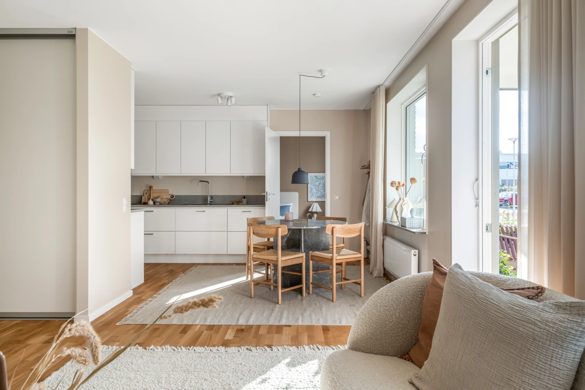 Bostadens hjärta är det öppna sambandet mellan vardagsrum och kök, där stora fönsterpartier fyller rummen med ljus. Köket från Vedum går i en elegant och modern stil med vita släta luckor, grå bänkskiva och integrerade vitvaror från Electrolux. Här finns både dubbla kyl/frysar och alla bekvämligheter en hemmakock kan önska.