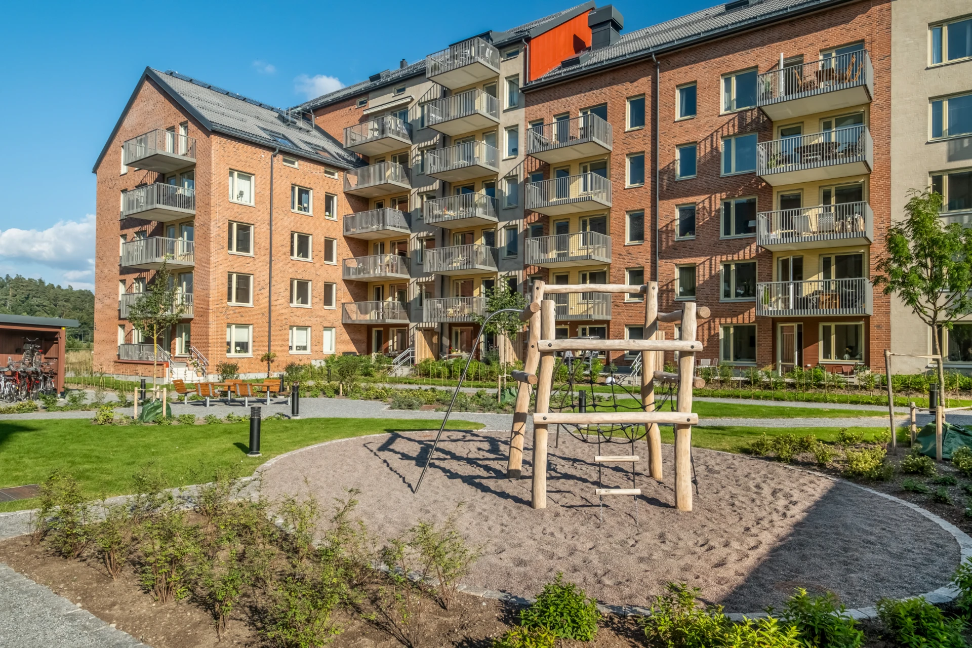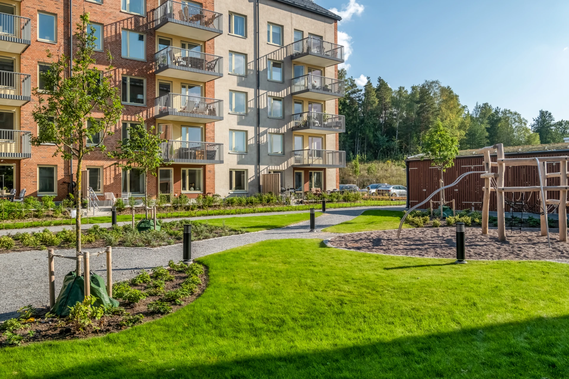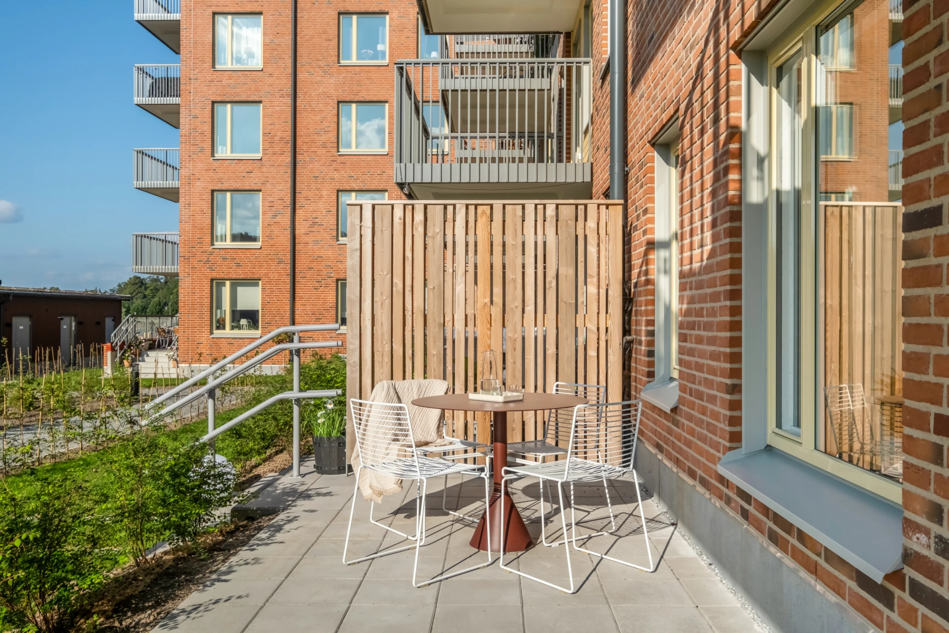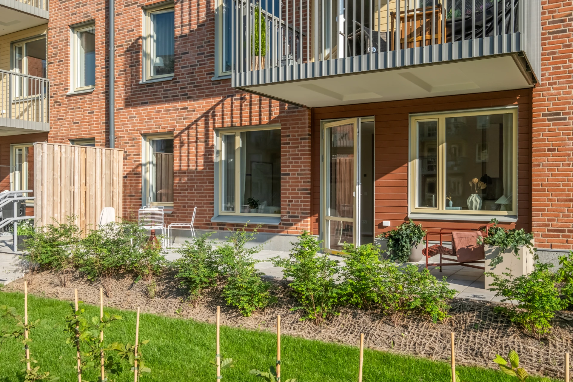 Familjevänlig trea med stor uteplats och egen tomt i populära Tegelbruket
