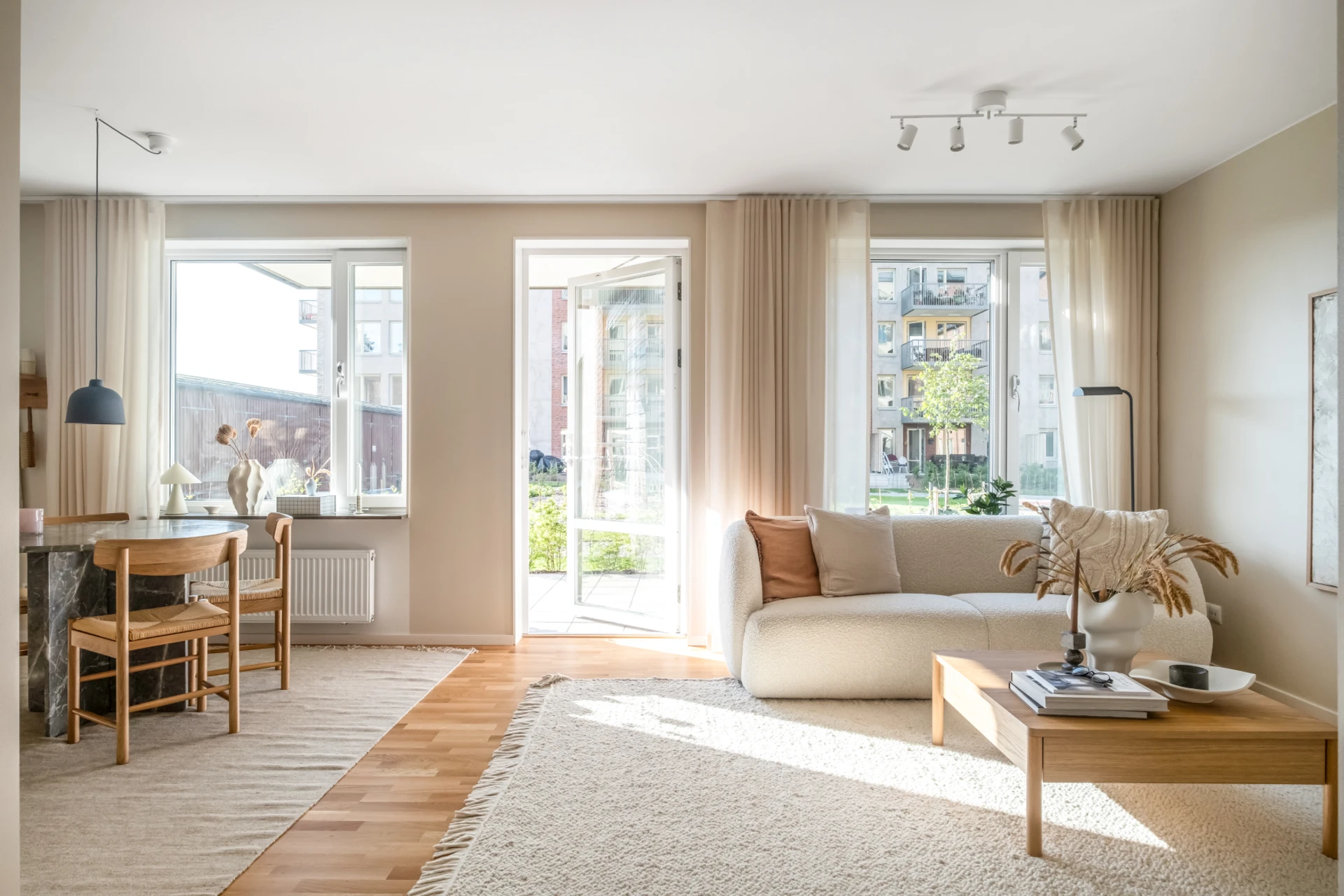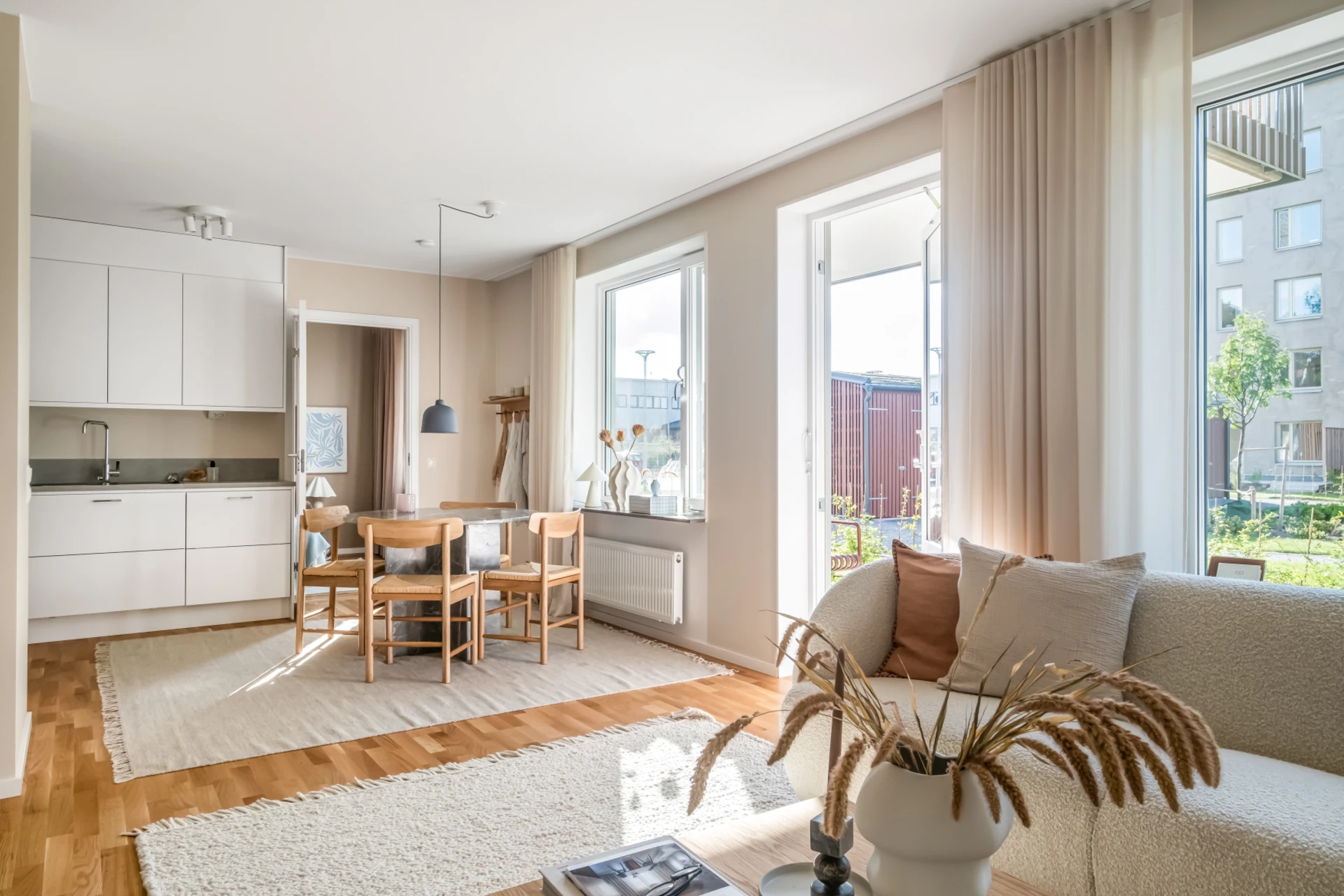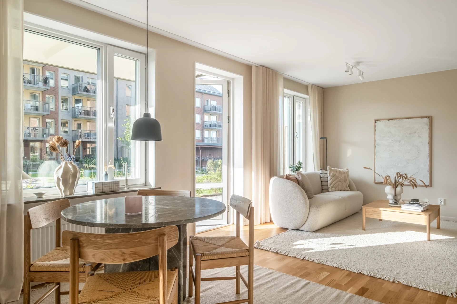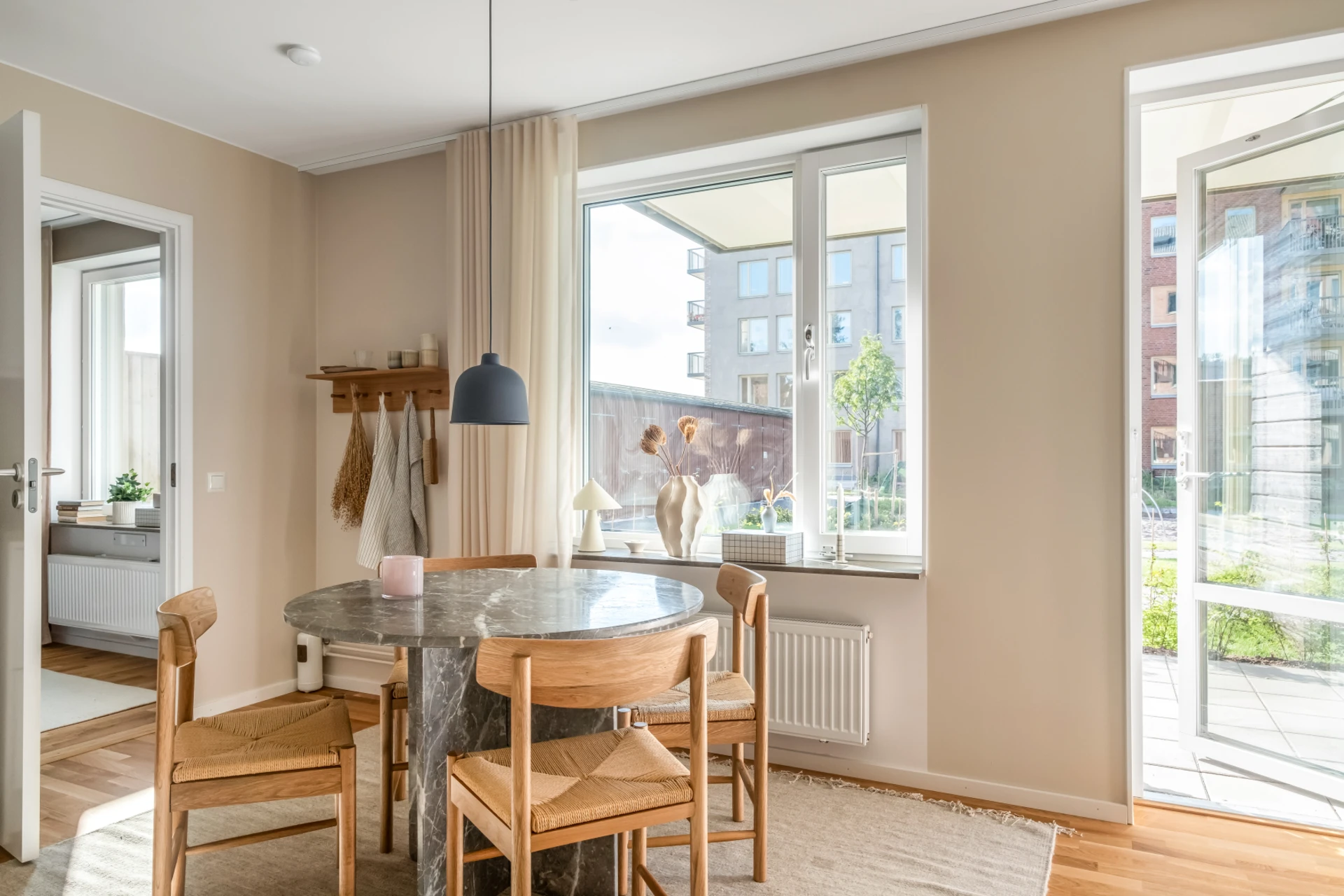 Välkommen hem till en bostad som kombinerar modern elegans med hemtrevlig komfort. Här bor du med känslan av ett radhus tack vare den generösa uteplatsen och den egna tomten som vetter mot föreningens lugna och gröna innergård – en perfekt plats för sociala middagar, lek eller avkopplande stunder i solen.