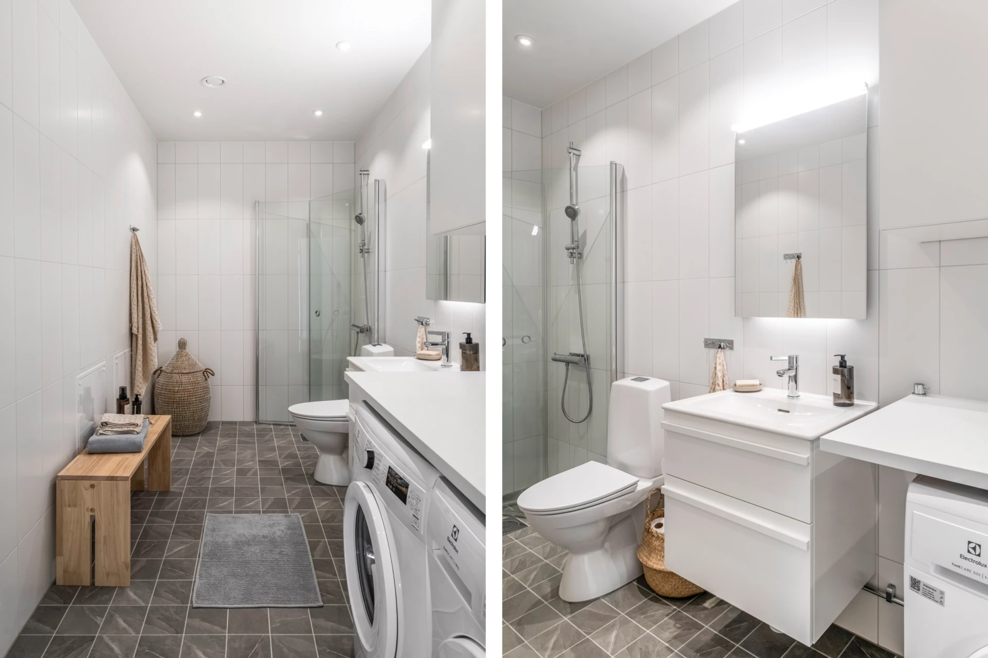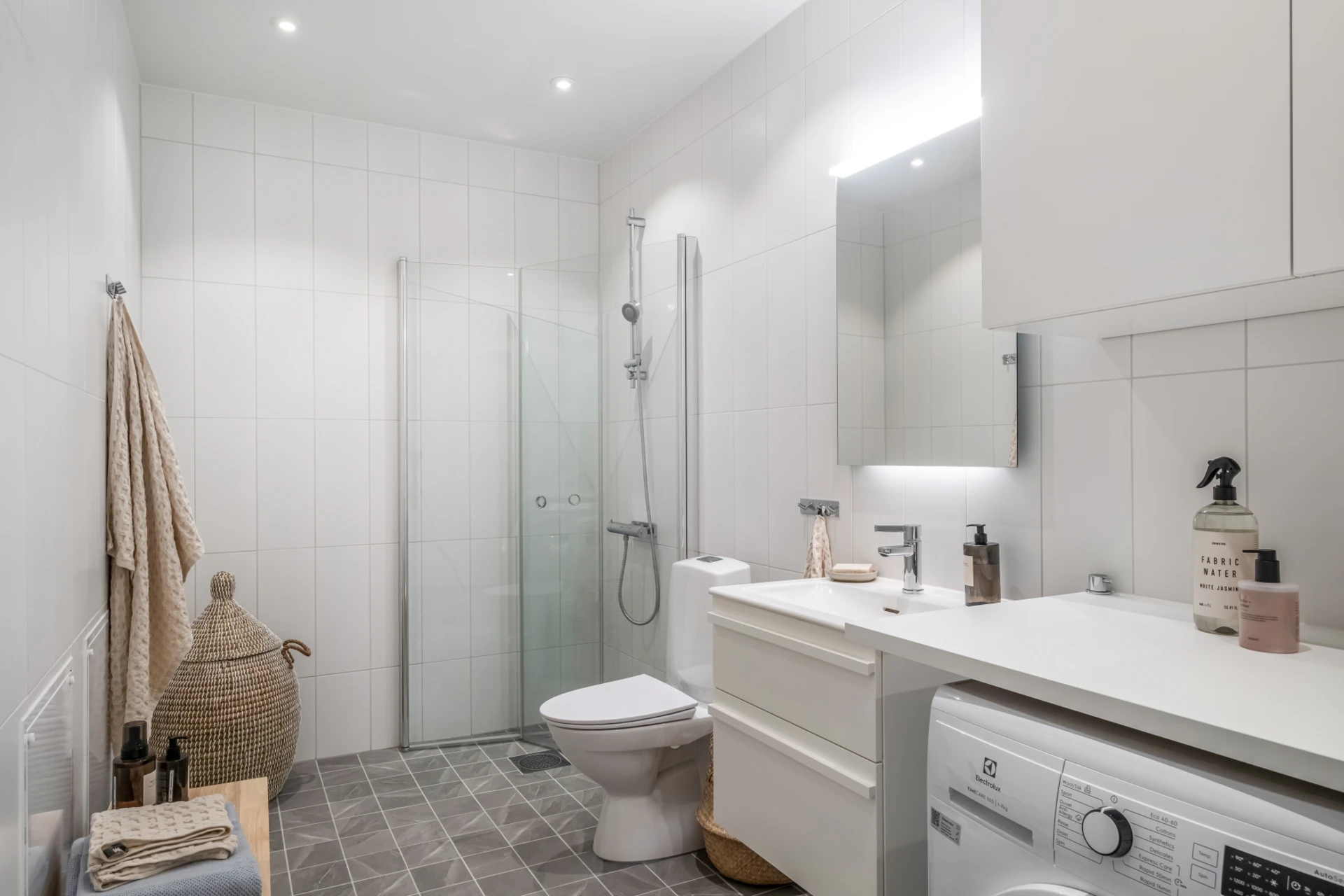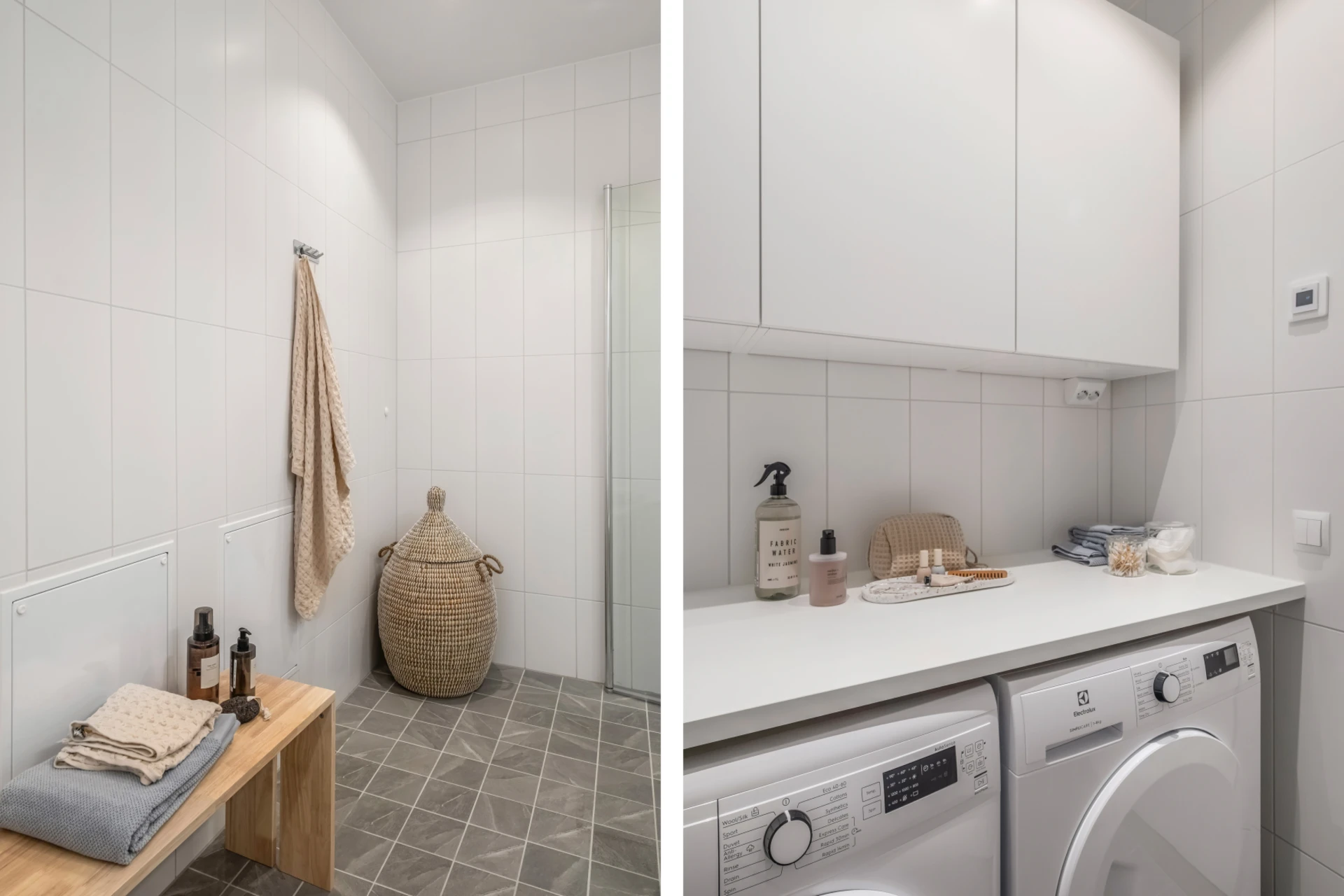 När du kliver in möts du av en rymlig hall med gott om förvaring och direkt anslutning till bostadens stilrena badrum. Här samsas tidlös design med praktisk funktion – grått klinkergolv, vita stående kakelplattor och vikbara duschväggar i glas skapar en fräsch och modern känsla. Den egna tvättdelen med både tvättmaskin och torktumlare under arbetsbänk samt överskåp ger allt du behöver för en smidig vardag.