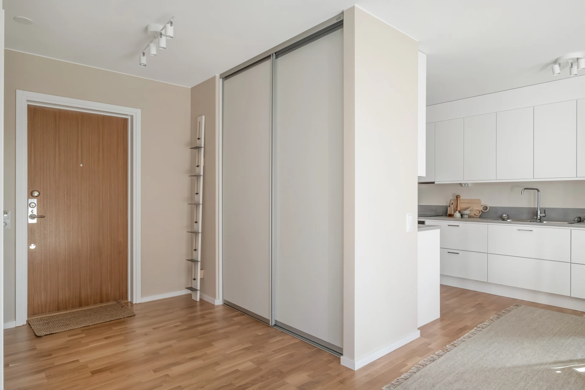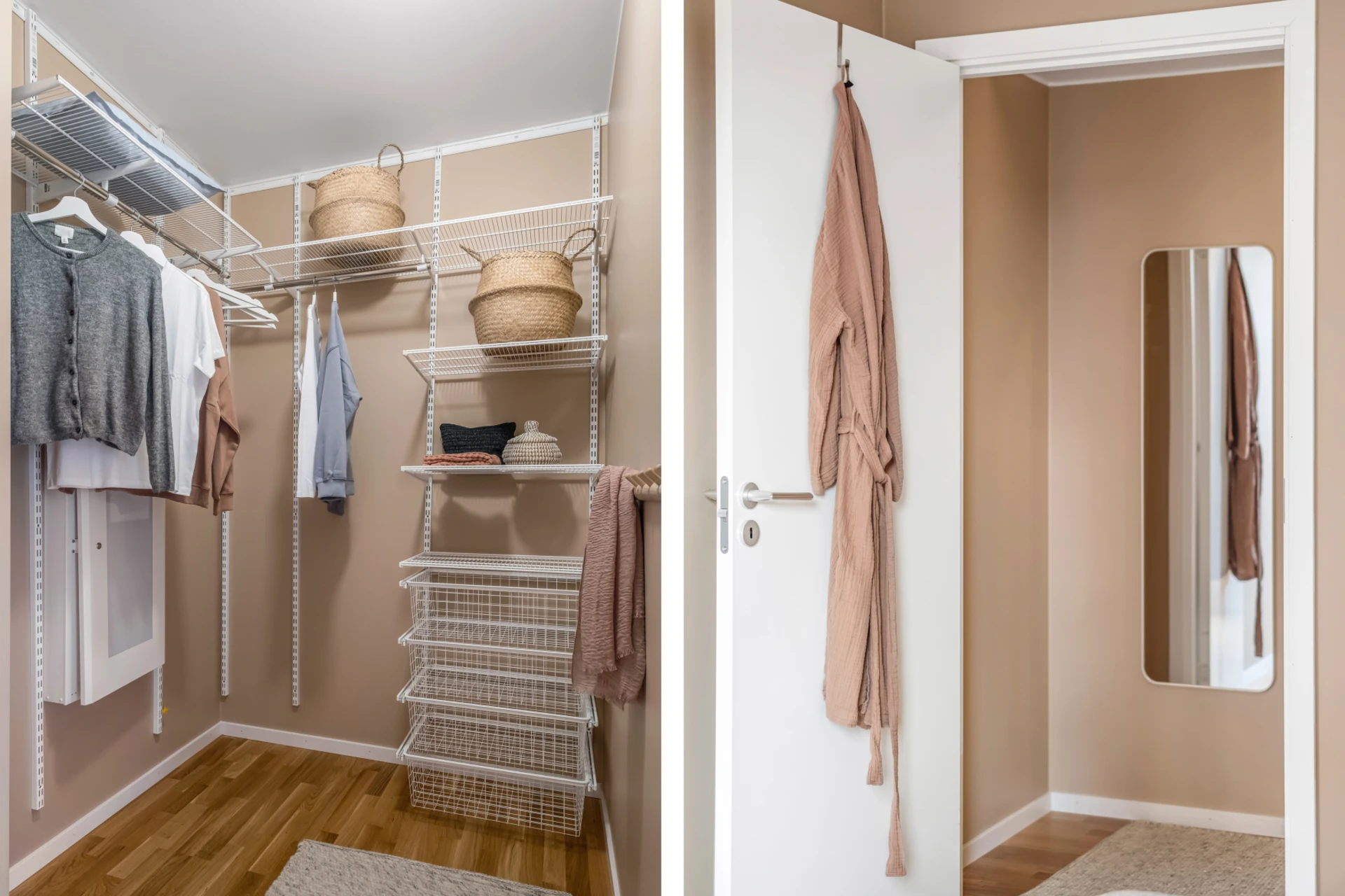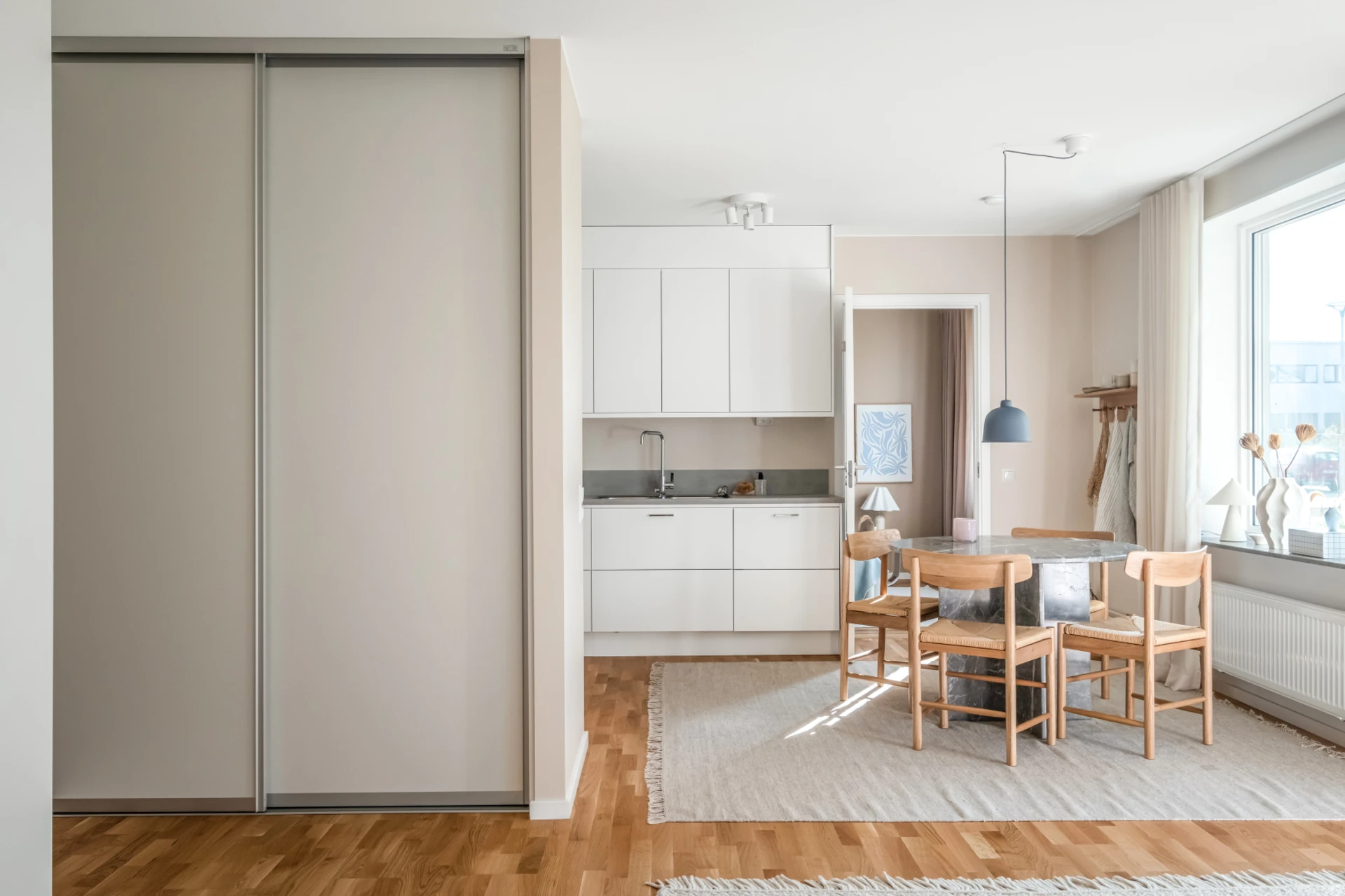 När du kliver in möts du av en rymlig hall med gott om förvaring och direkt anslutning till bostadens stilrena badrum. Här samsas tidlös design med praktisk funktion – grått klinkergolv, vita stående kakelplattor och vikbara duschväggar i glas skapar en fräsch och modern känsla. Den egna tvättdelen med både tvättmaskin och torktumlare under arbetsbänk samt överskåp ger allt du behöver för en smidig vardag.