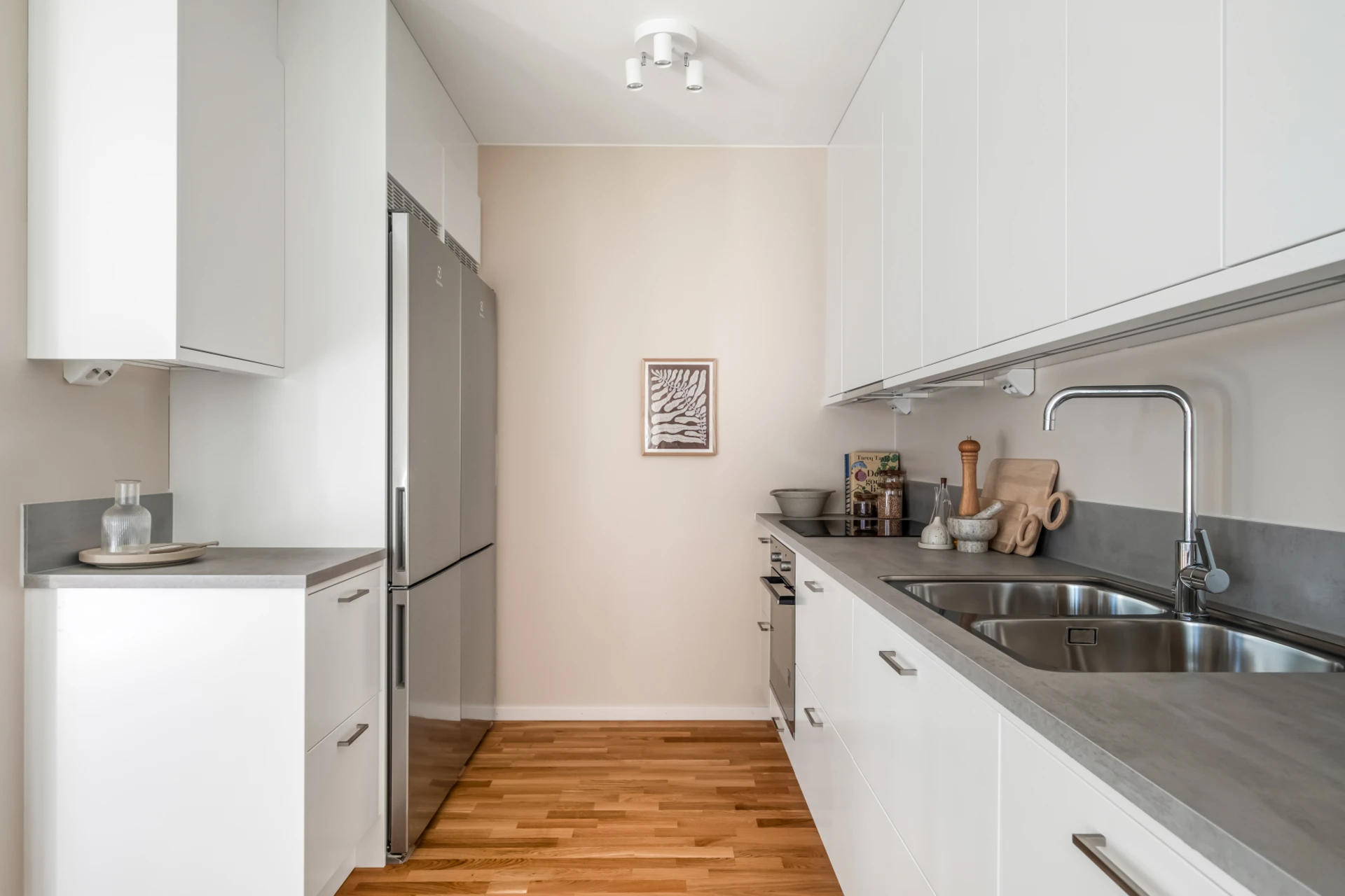 Materialvalen är genomgående moderna och tidlösa: vitmålade väggar, trestavsparkett samt smakfulla detaljer som LED-belysning under köksskåpen.
