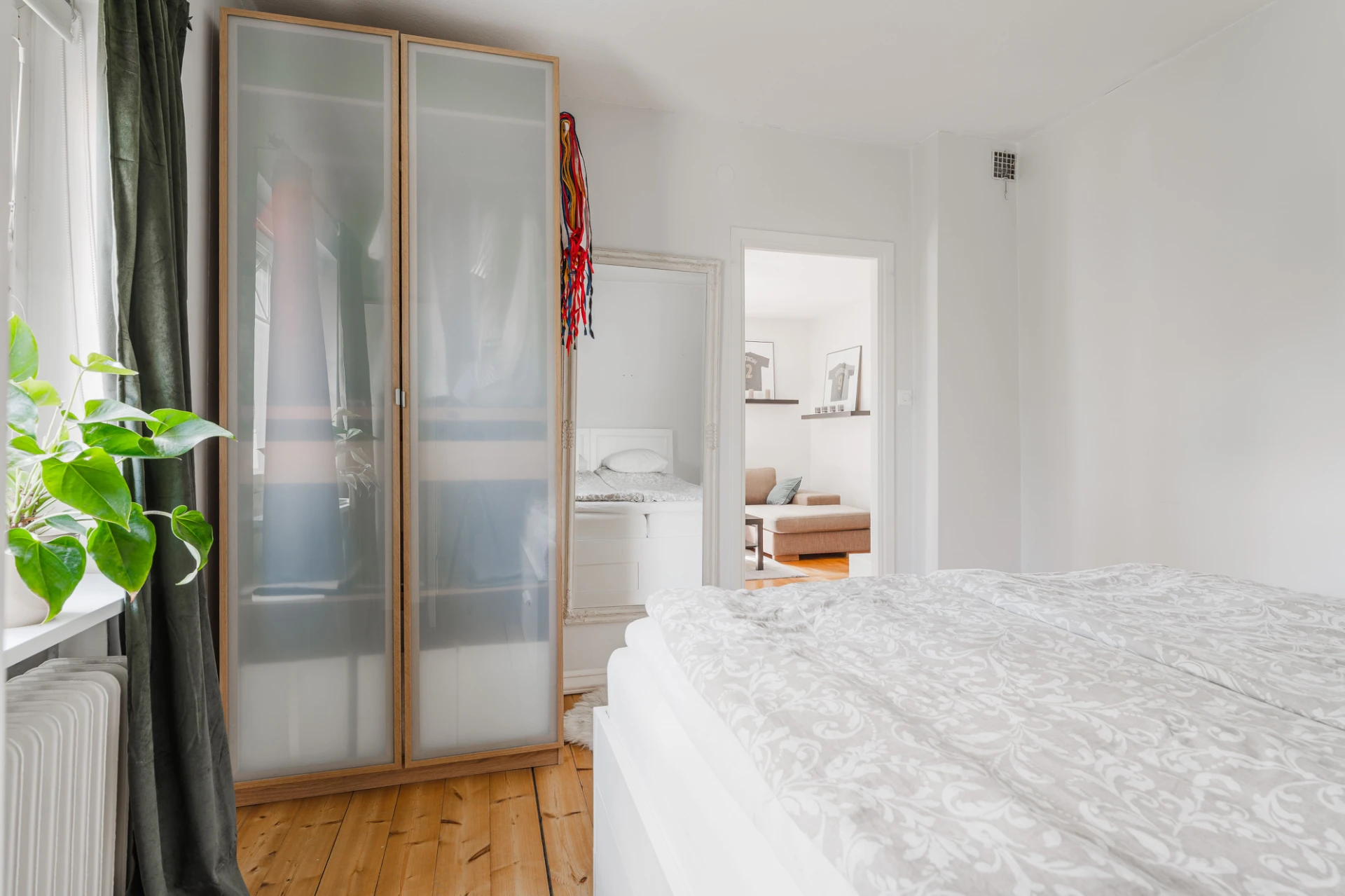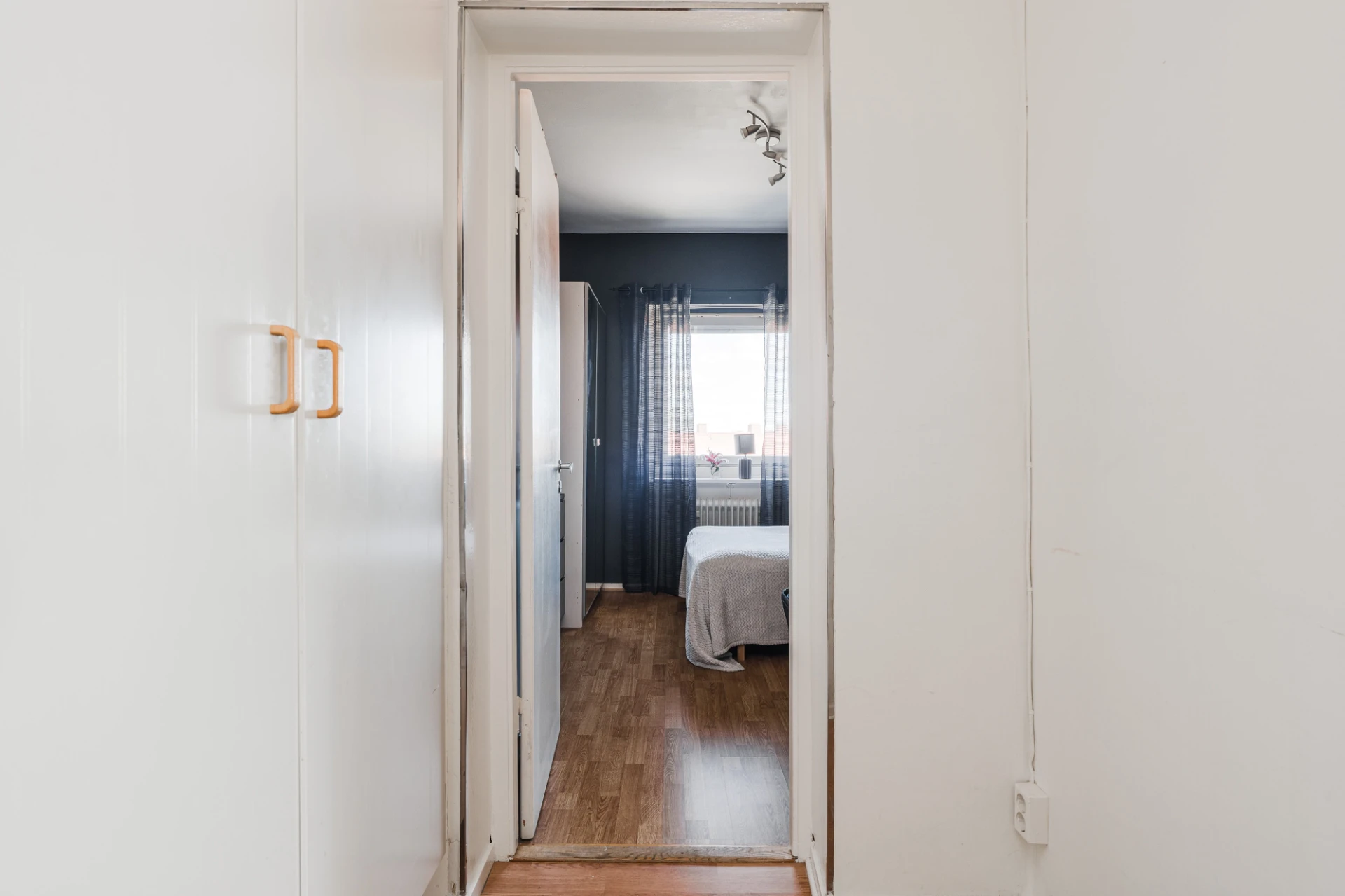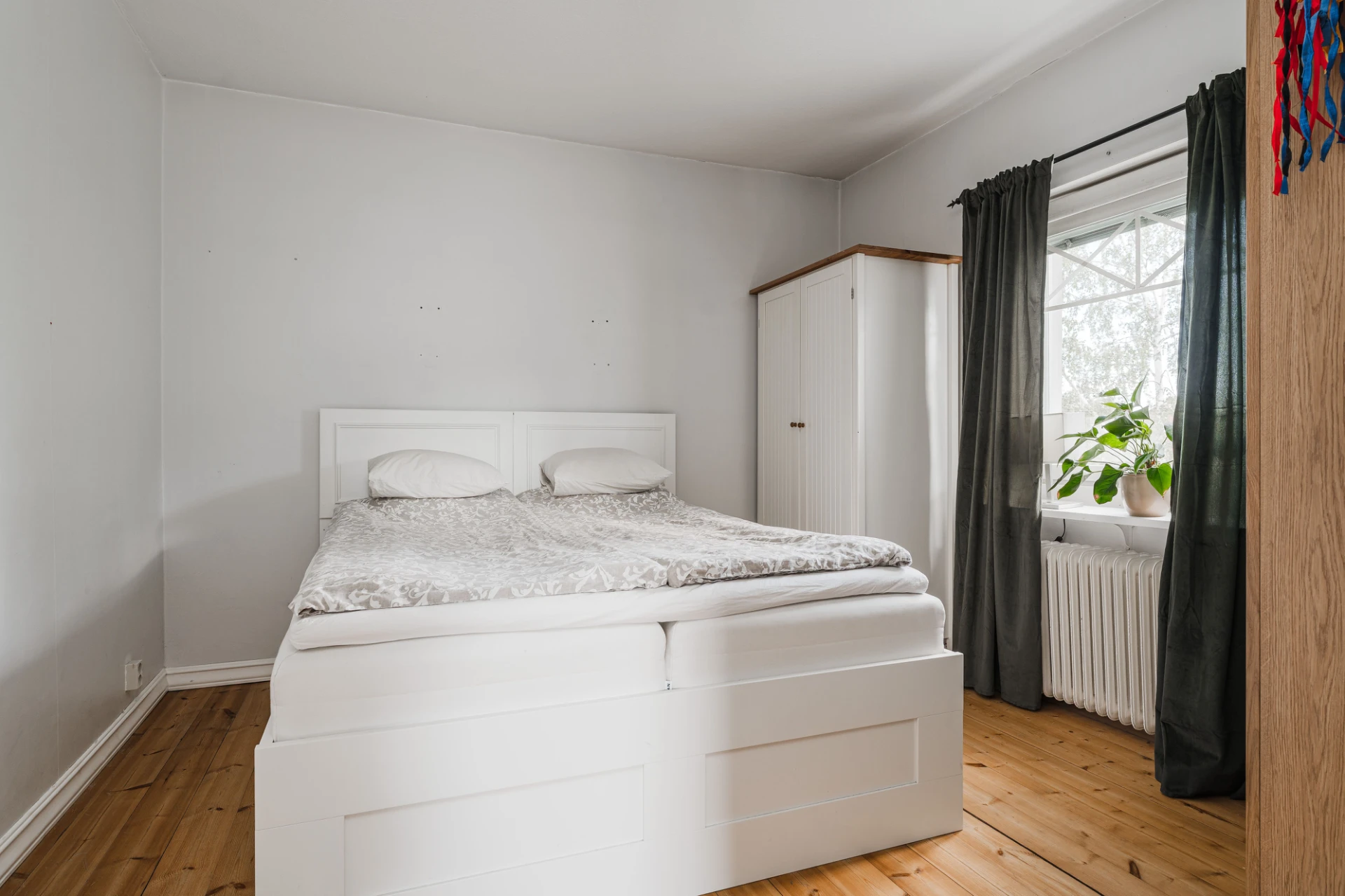 Trägolv och väggar i ljusgrått. Här finns plats för dubbelsäng med tillhörande möblemang. Förvaring i garderob.