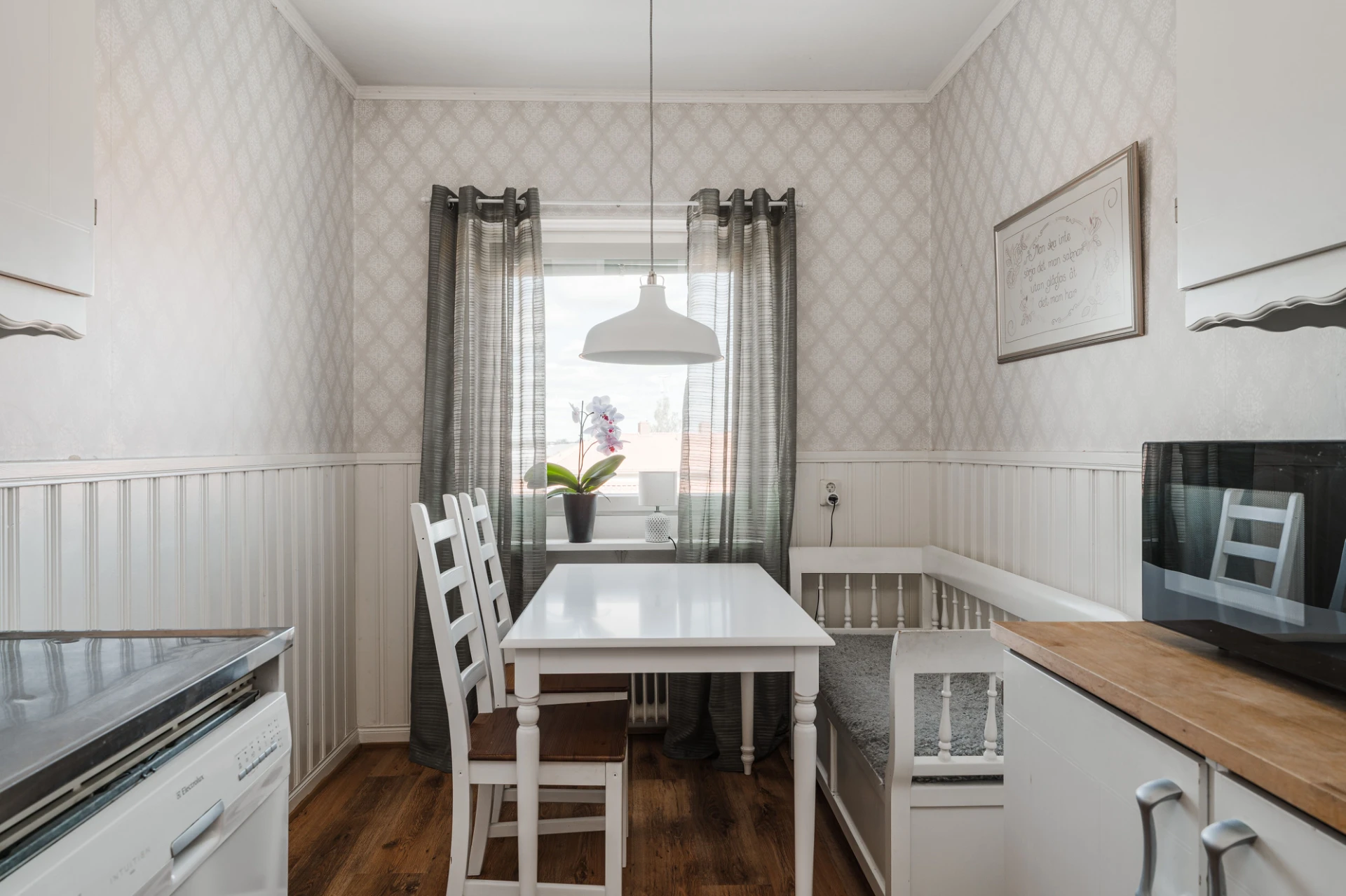 Laminatgolv och väggar i ett ljust mönster och vit bröstpanel. Vita skåpsluckor och grått kakel ovan bänkskivan i trä och rostfritt. Den maskinella utrustningen består av spis med ugn, spisfläkt, diskmaskin samt kombinerad kyl och frys. Matplats för 4 personer.