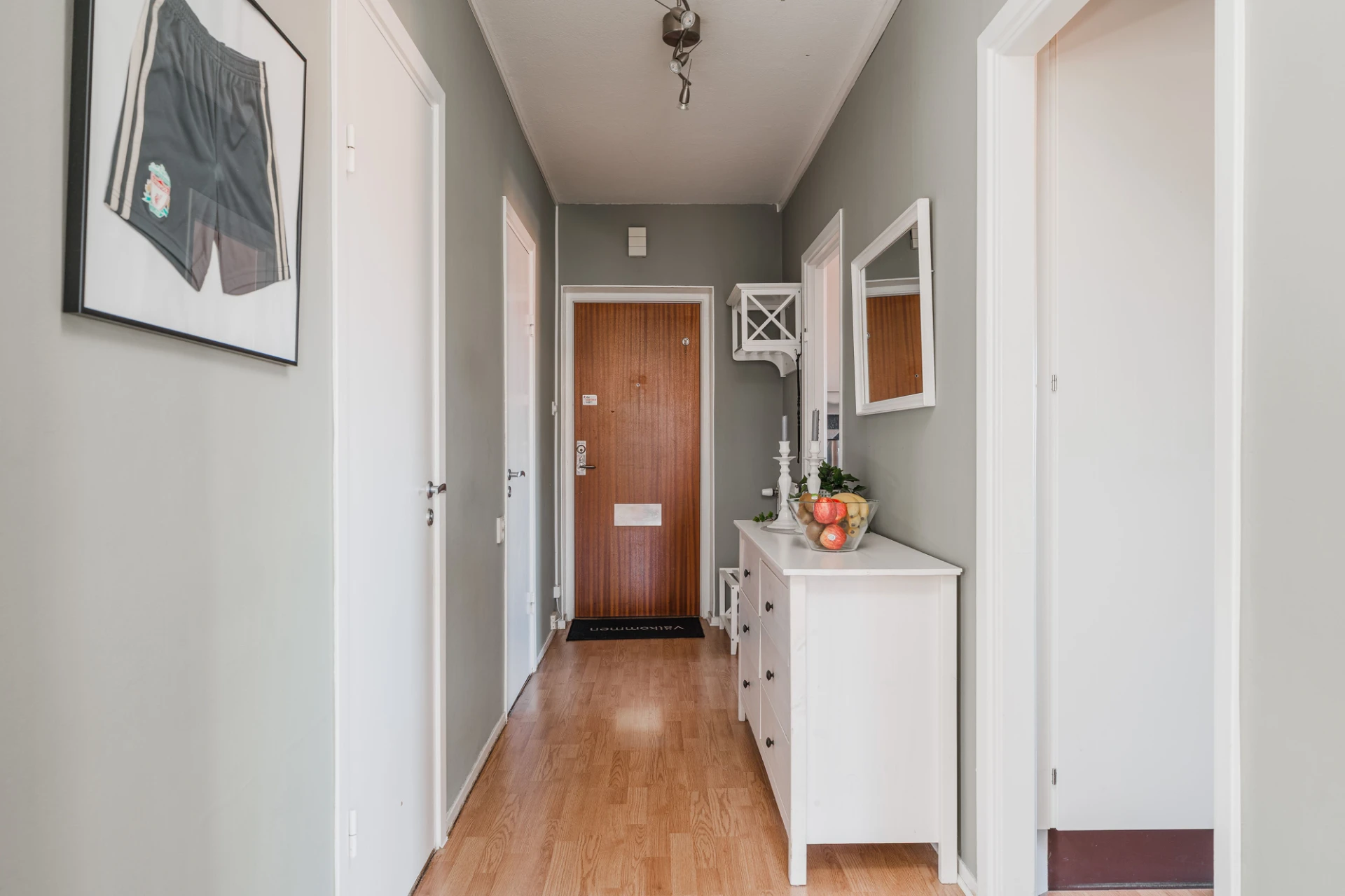 Laminatgolv och väggar i ljusgrönt. Avhängning i hatthylla och ytterligare förvaring i garderober.