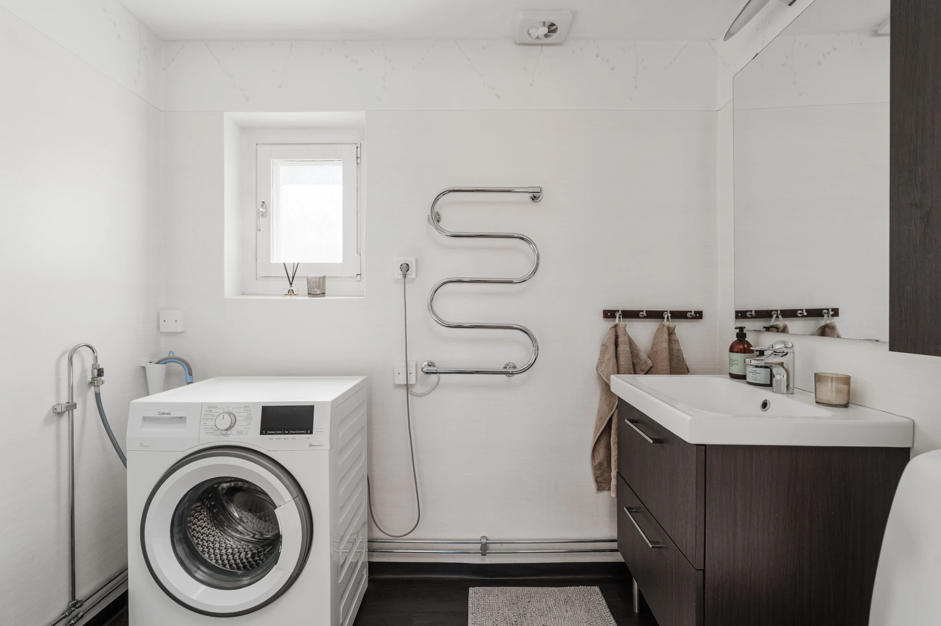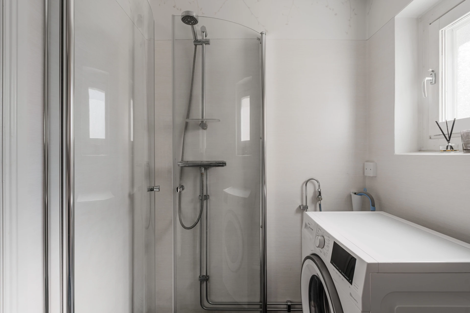 Mörkgrå våtrumsmatta och ljus våtrumstapet. Spotlights i taket. Badrummet är utrustat med WC, handfat med kommod, förvaringsskåp, dusch med vikbara väggar och handdukstork. Badrummet renoverades 2019. Tvättmaskinen ingår inte i köpet men det finns möjlighet att installera en ny.