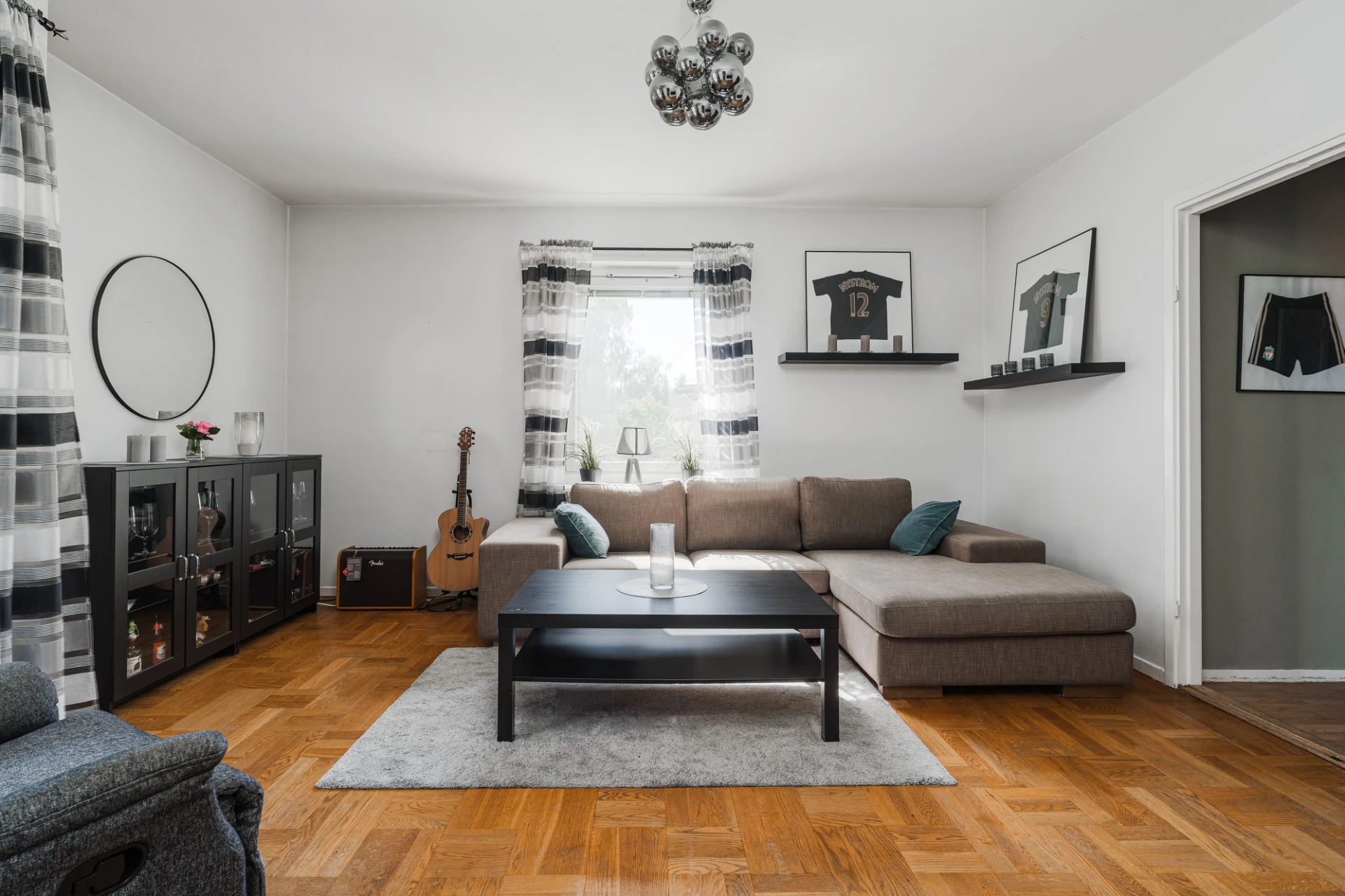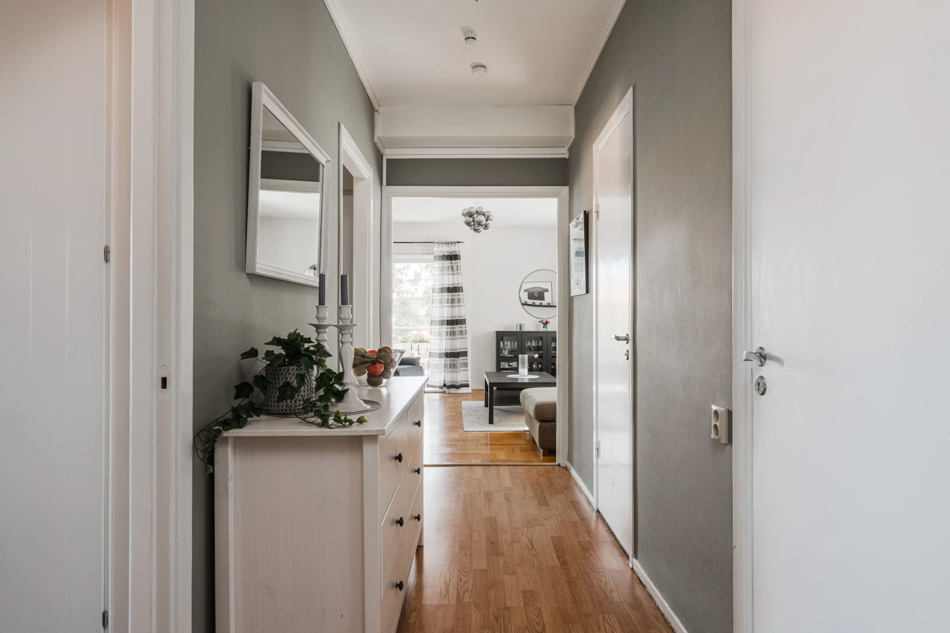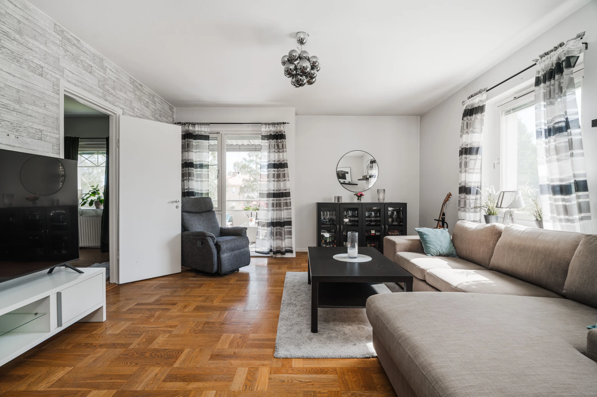 Parkettgolv och väggar i en grå nyans samt ljus fondvägg. Här finns plats för soffgrupp med tillhörande möblemang. Från vardagsrummet nås bostadens möblerbara balkong i österläge.