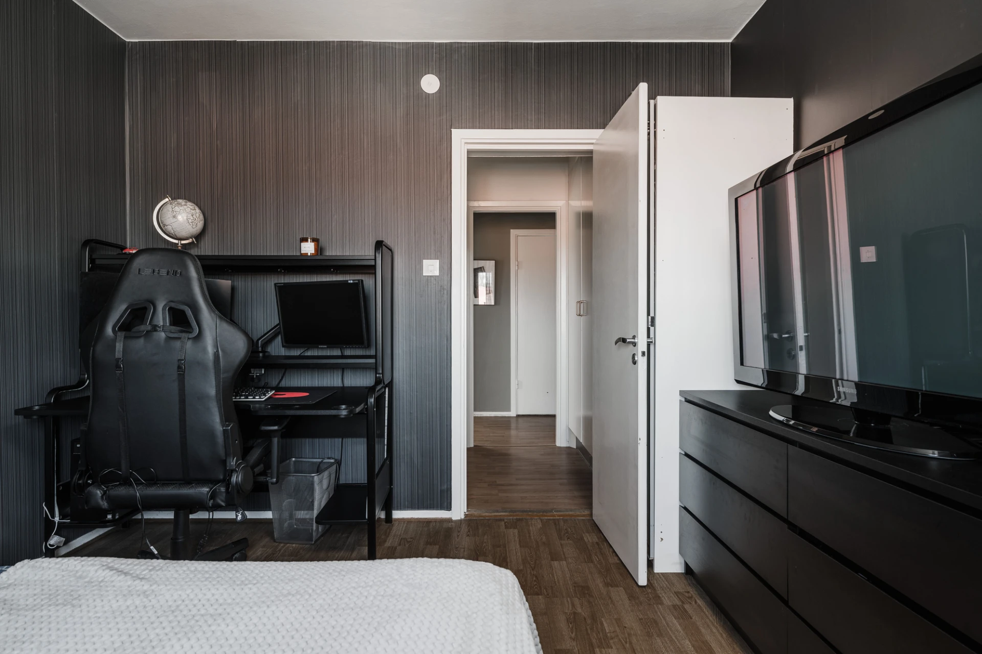 Laminatgolv och väggar i mörkgrått. Här finns plats för dubbelsäng med tillhörande möblemang. Förvaring i garderober.
