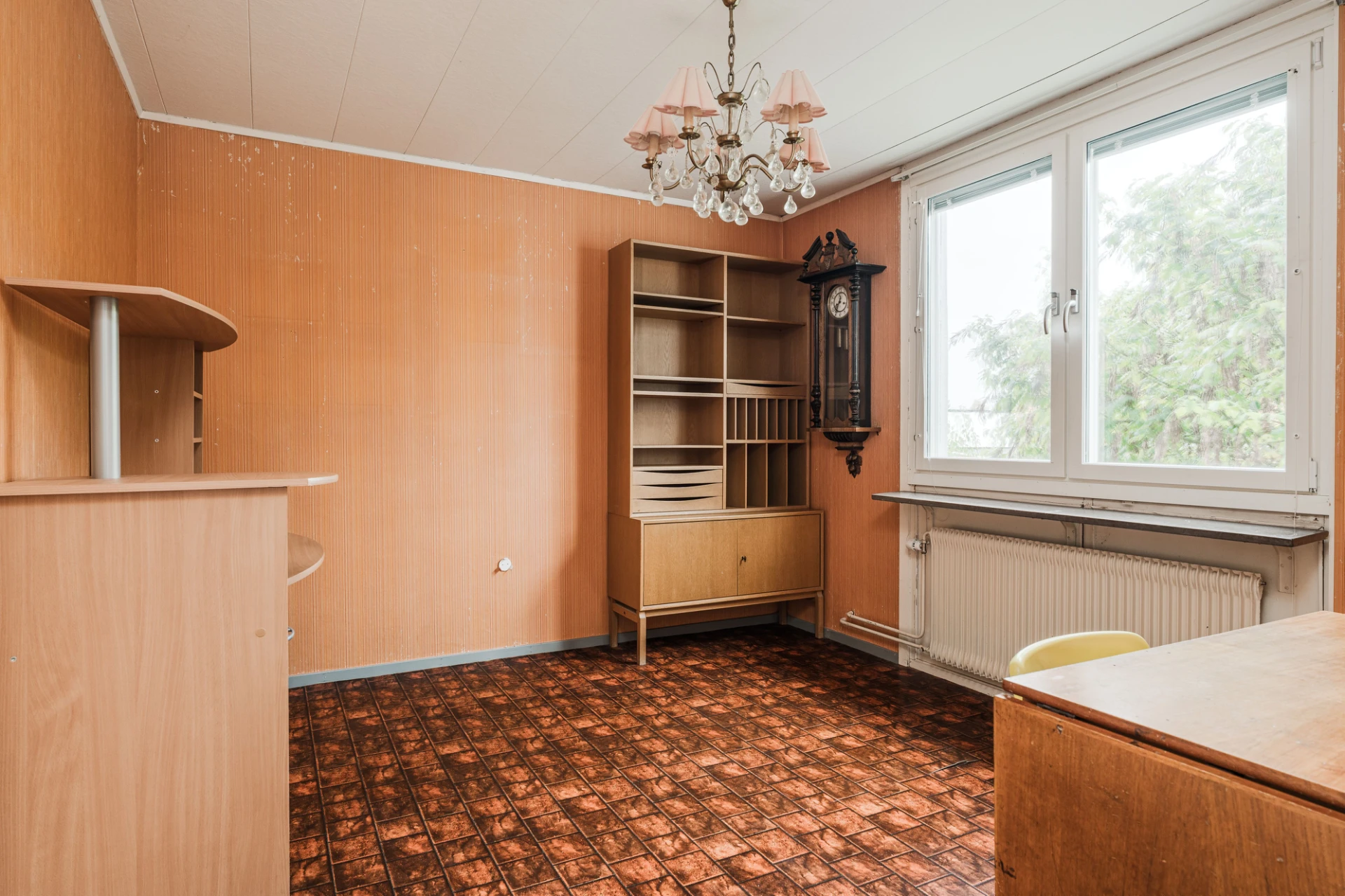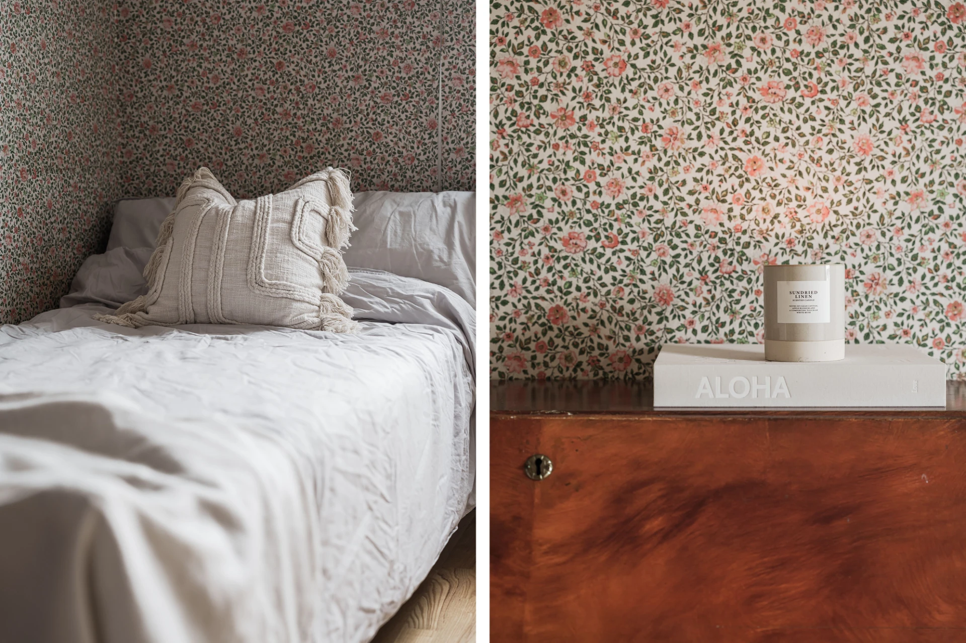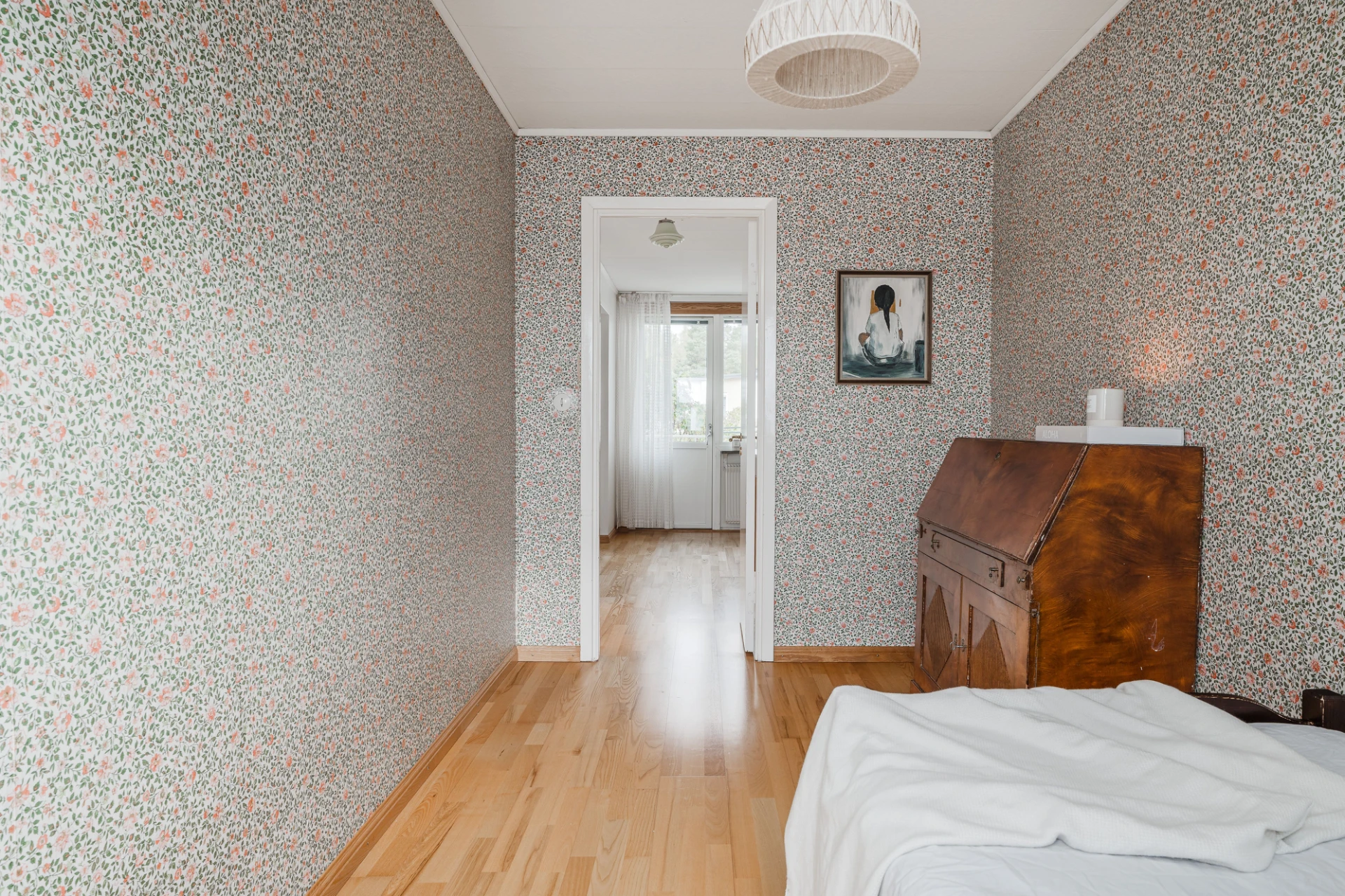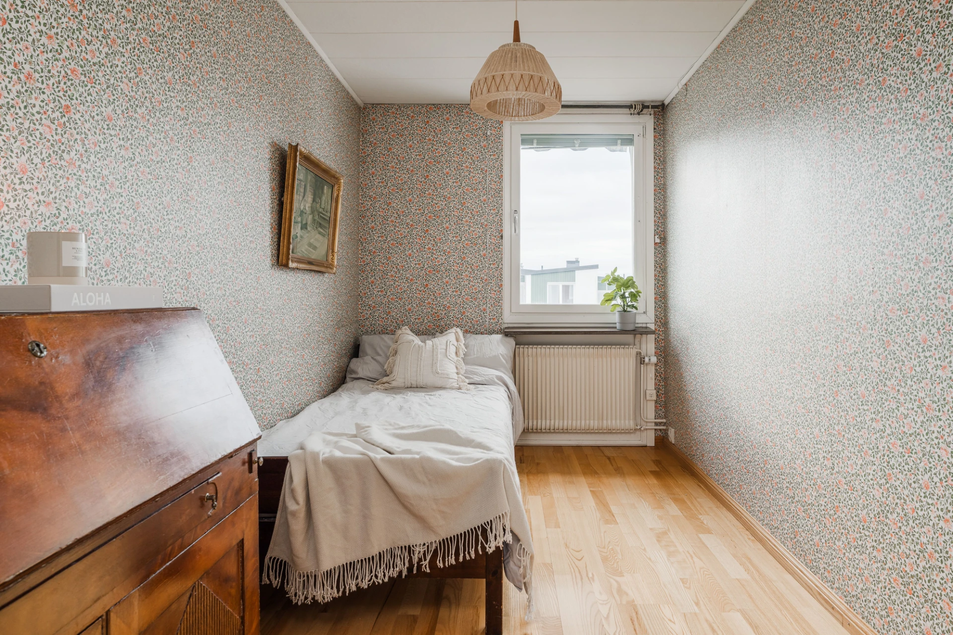 Parkettgolv och väggar i småblommigt mönster. Här finns plats för enkelsäng och skrivbordshörna.