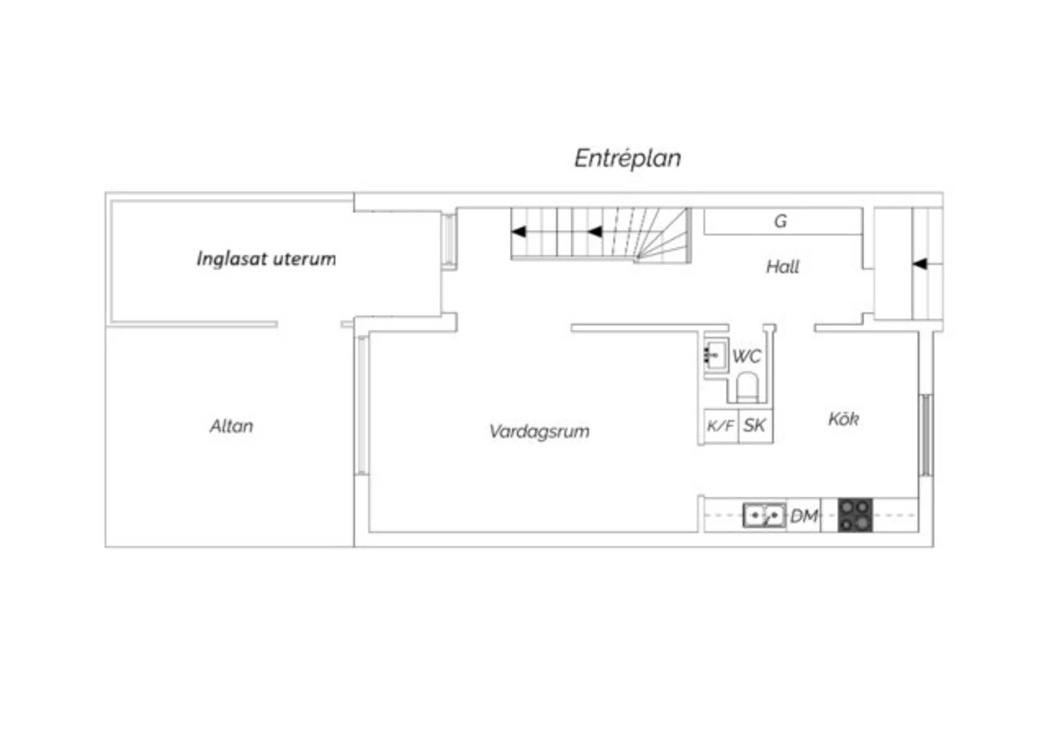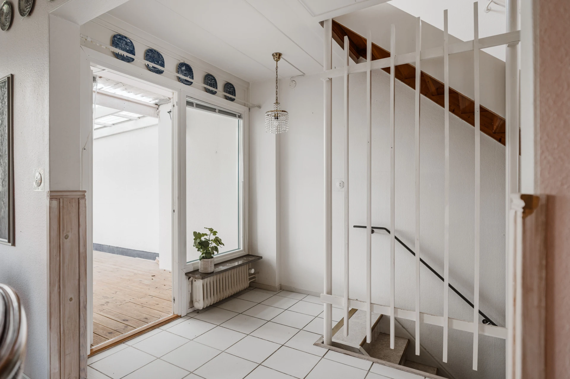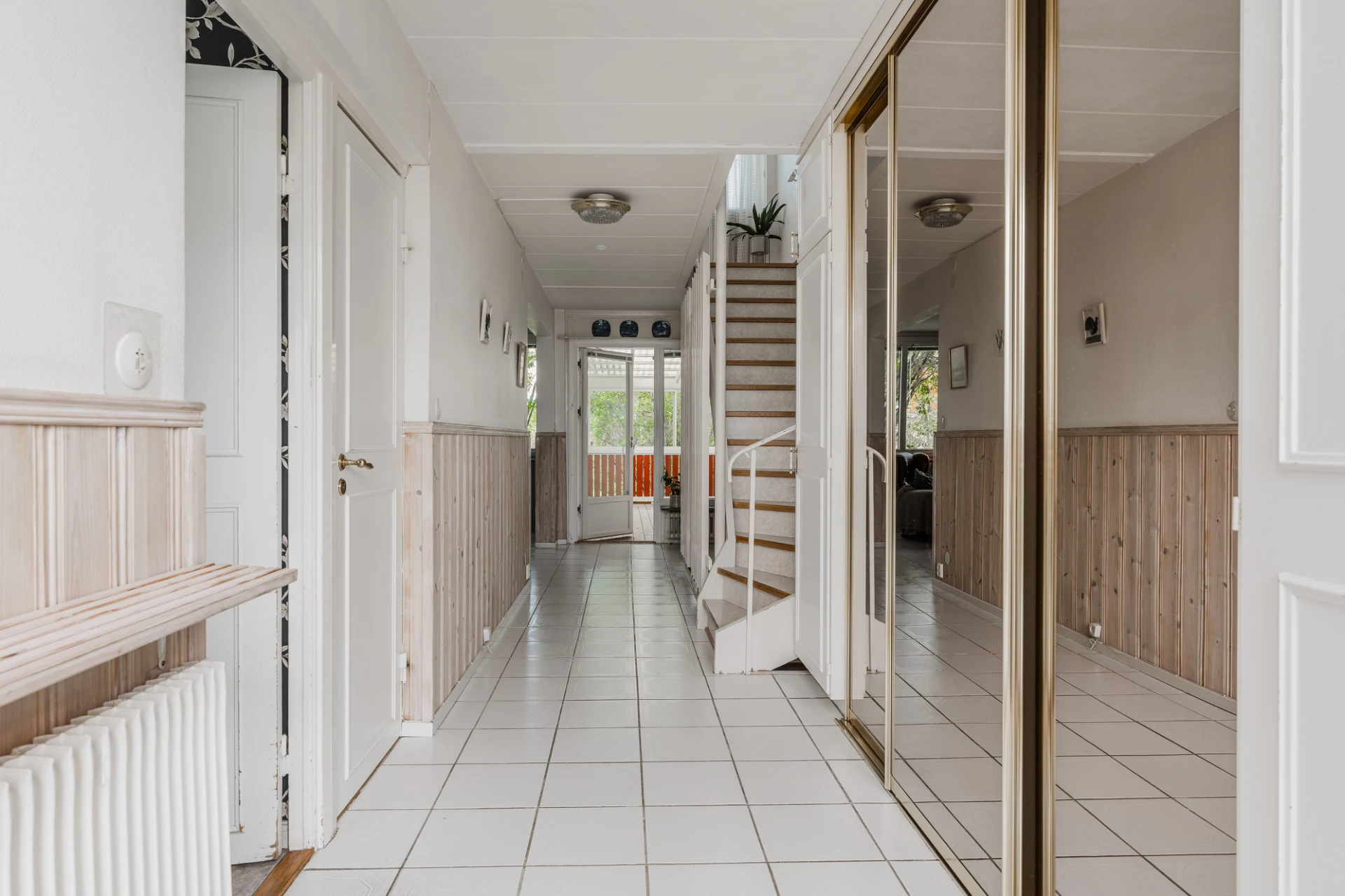 Ljust klinkergolv och väggar i en ljus nyans samt bröstpanel. Förvaring i skjutdörrsgarderob. Från hallen nås uterummet i nordvästläge med plats för möblering och utgång till altan och trädgård.