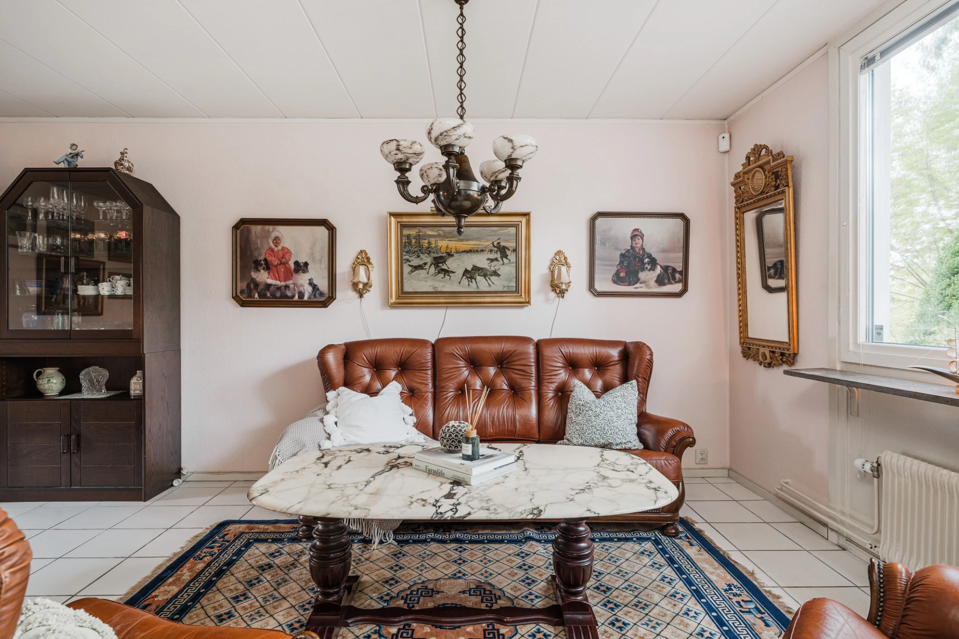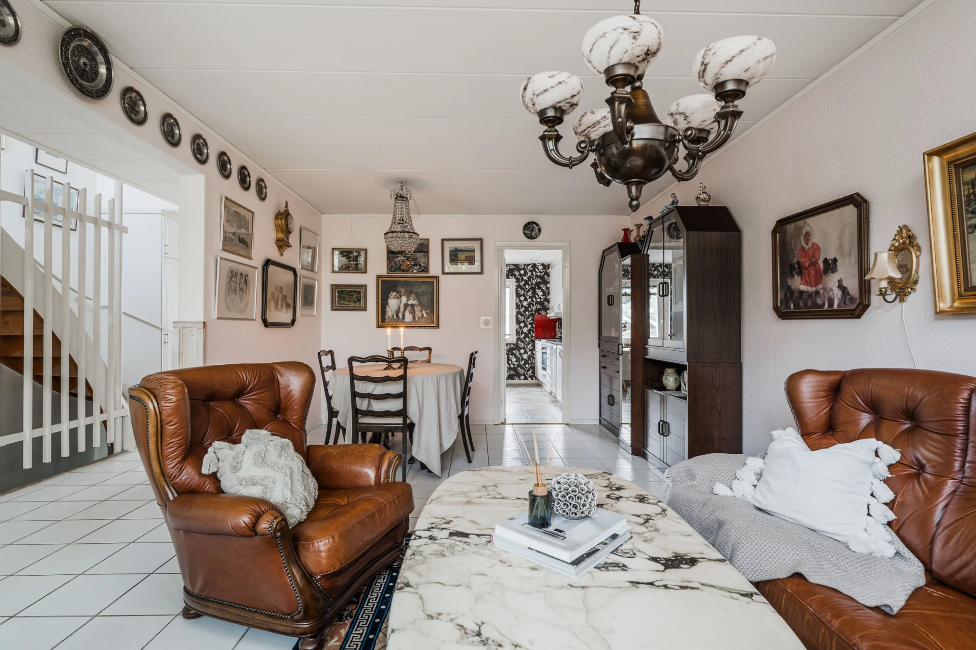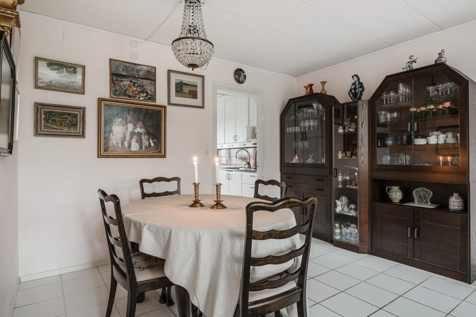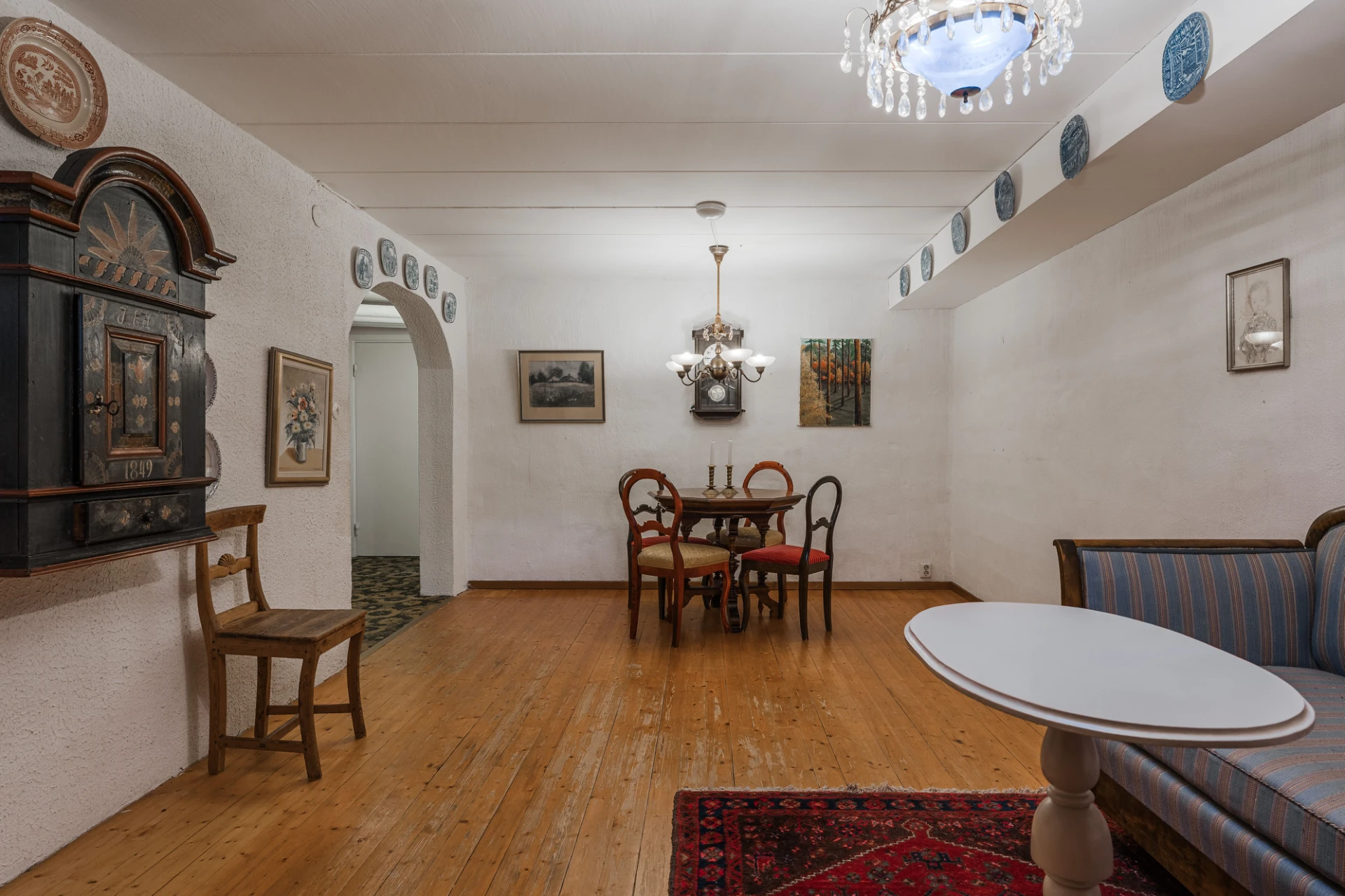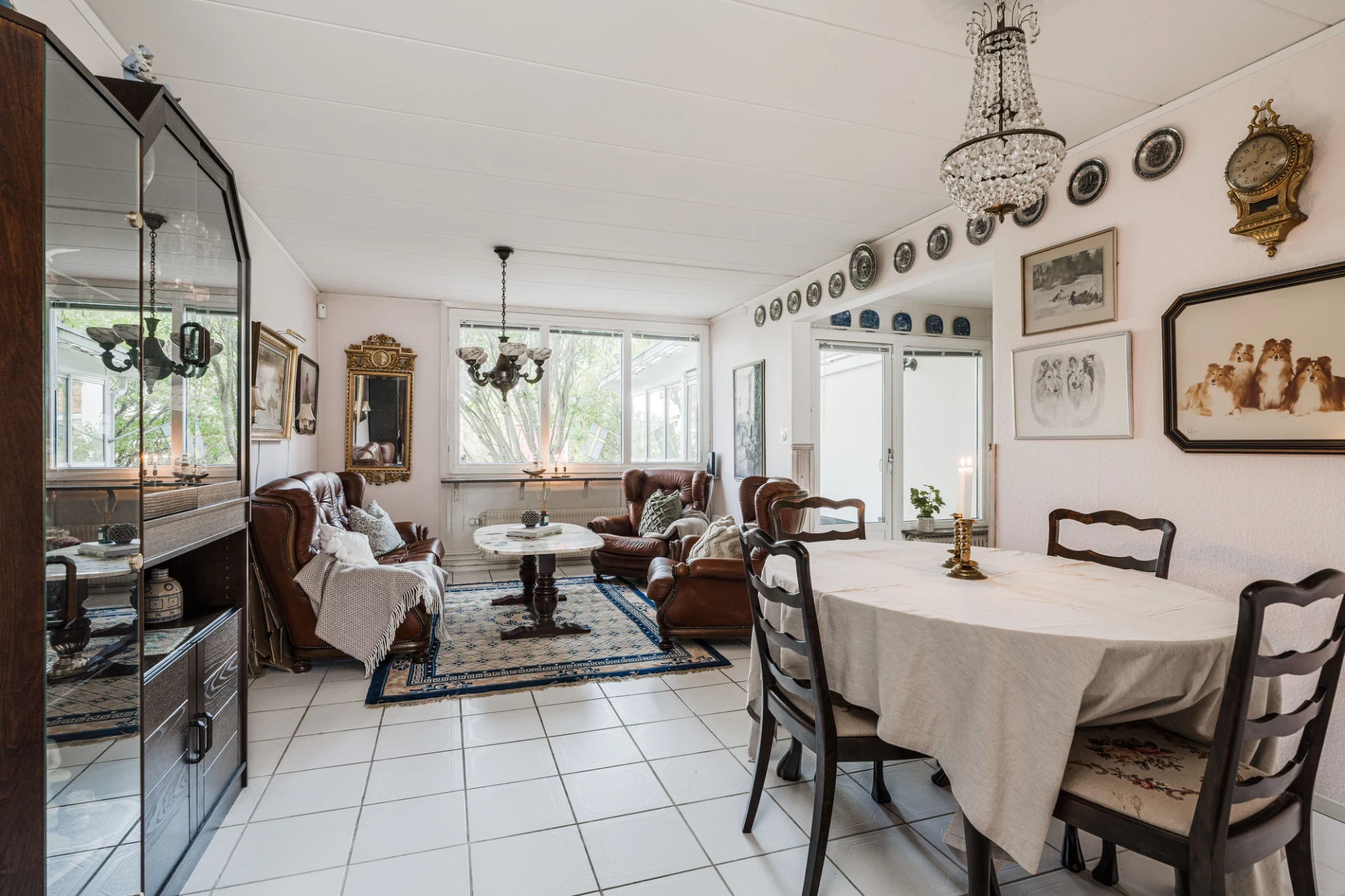 Ljust klinkergolv och väggar i en ljus nyans. Här finns plats för soffa med tillhörande möblemang och matplats för ca 6 personer.