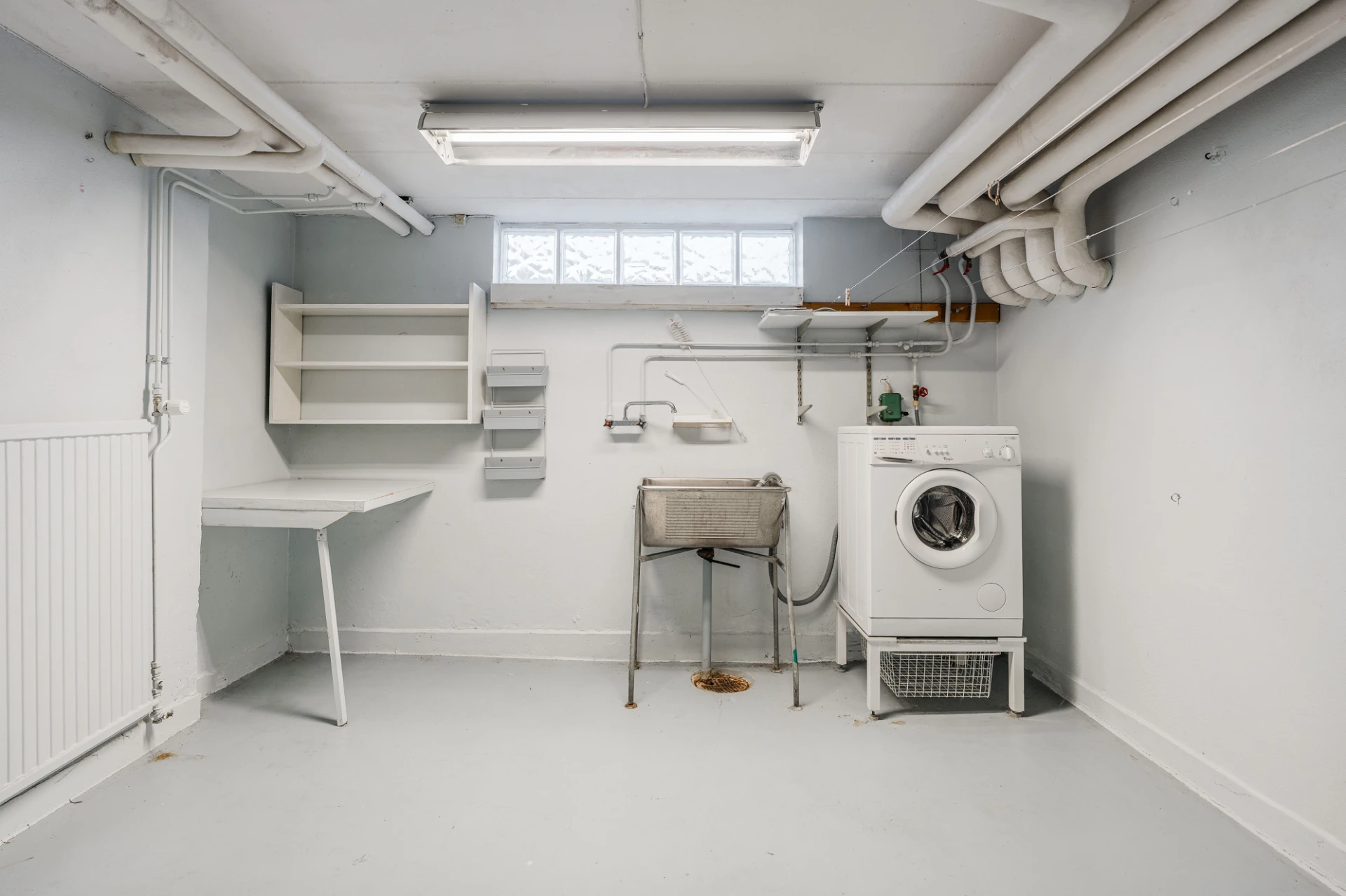 Målat betonggolv och väggar i vitt. Utrustat med tvättmaskin och tvättho.