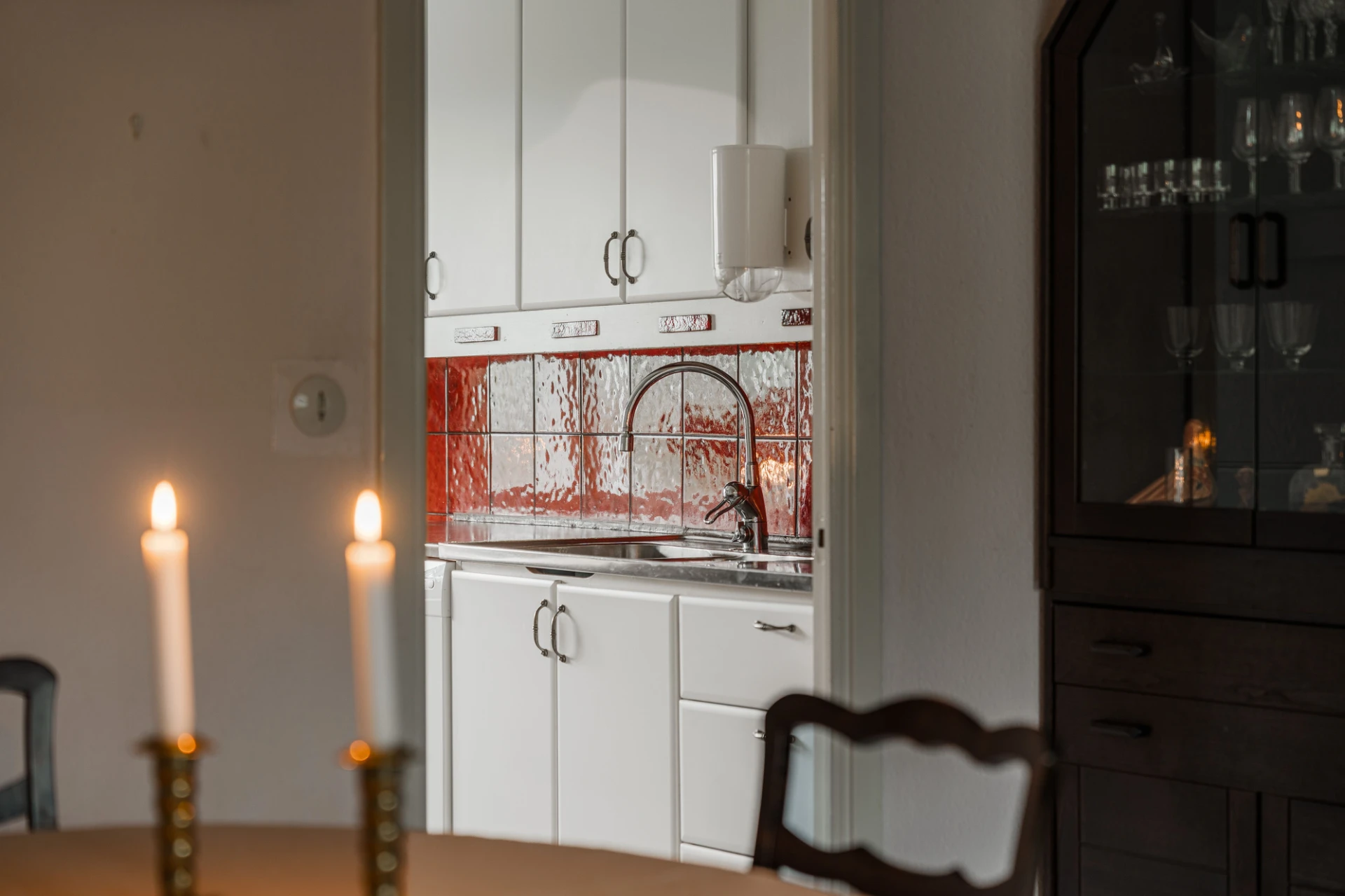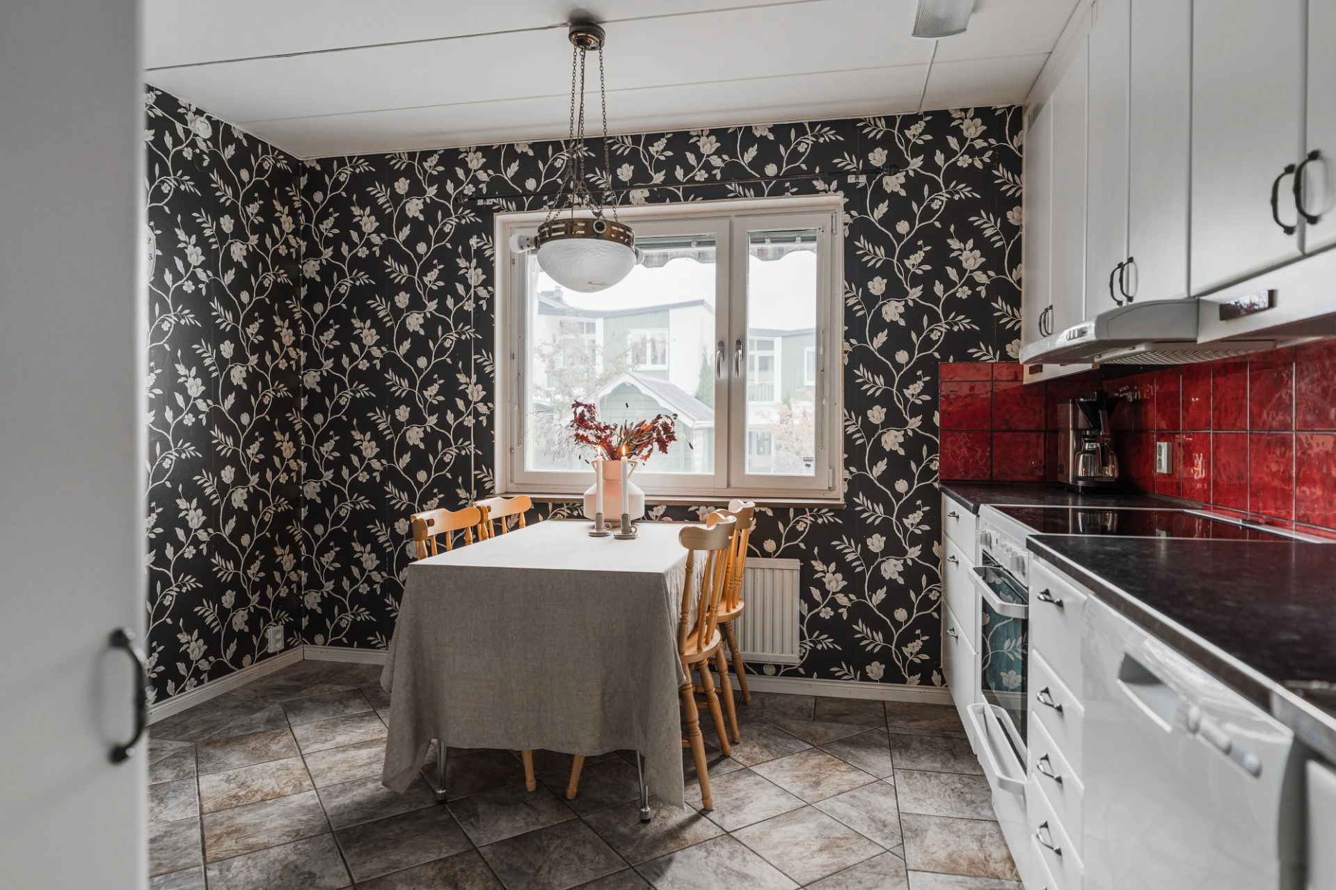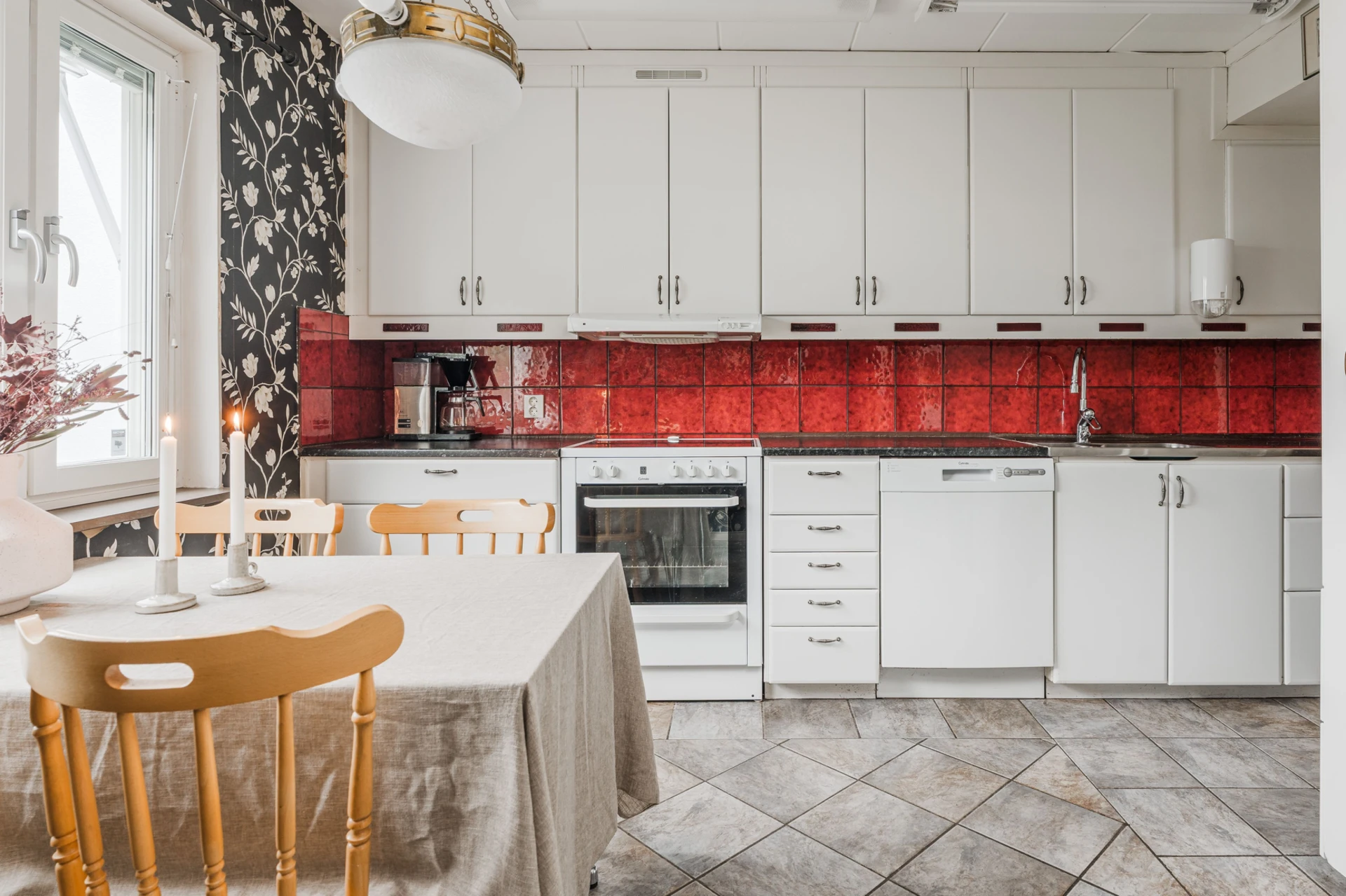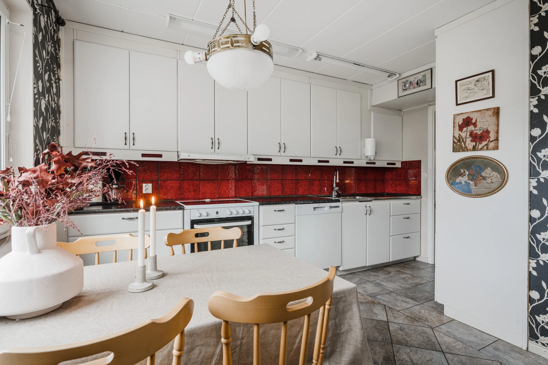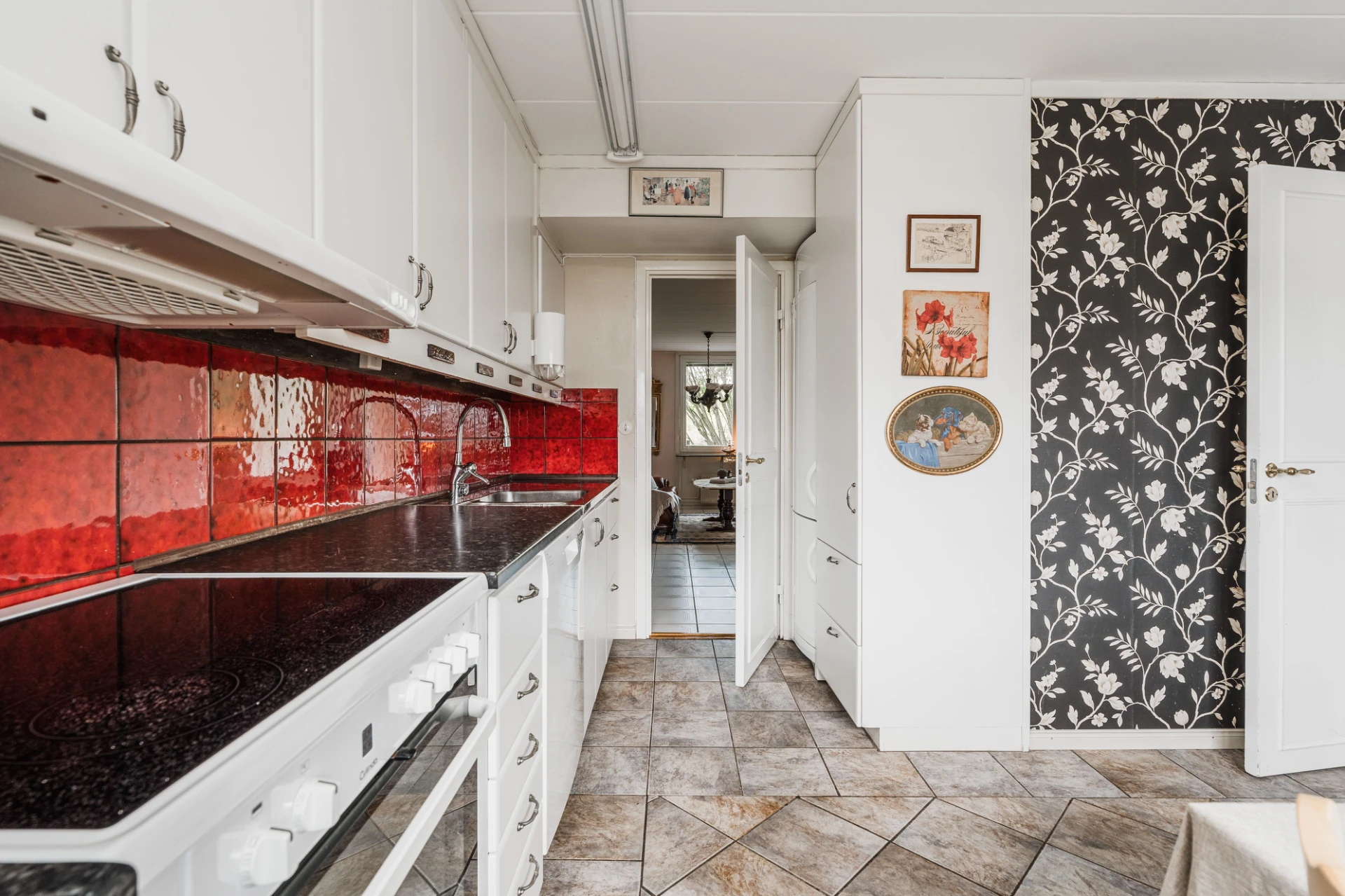 Grått klinkergolv och tapetserade väggar i svartvitt mönster. Vita skåpsluckor och rött kakel ovan bänkskivan i laminat och rostfritt. Den maskinella utrustningen består av spis med ugn, spisfläkt, diskmaskin samt kombinerad kyl och frys. Matplats för ca 4 personer.