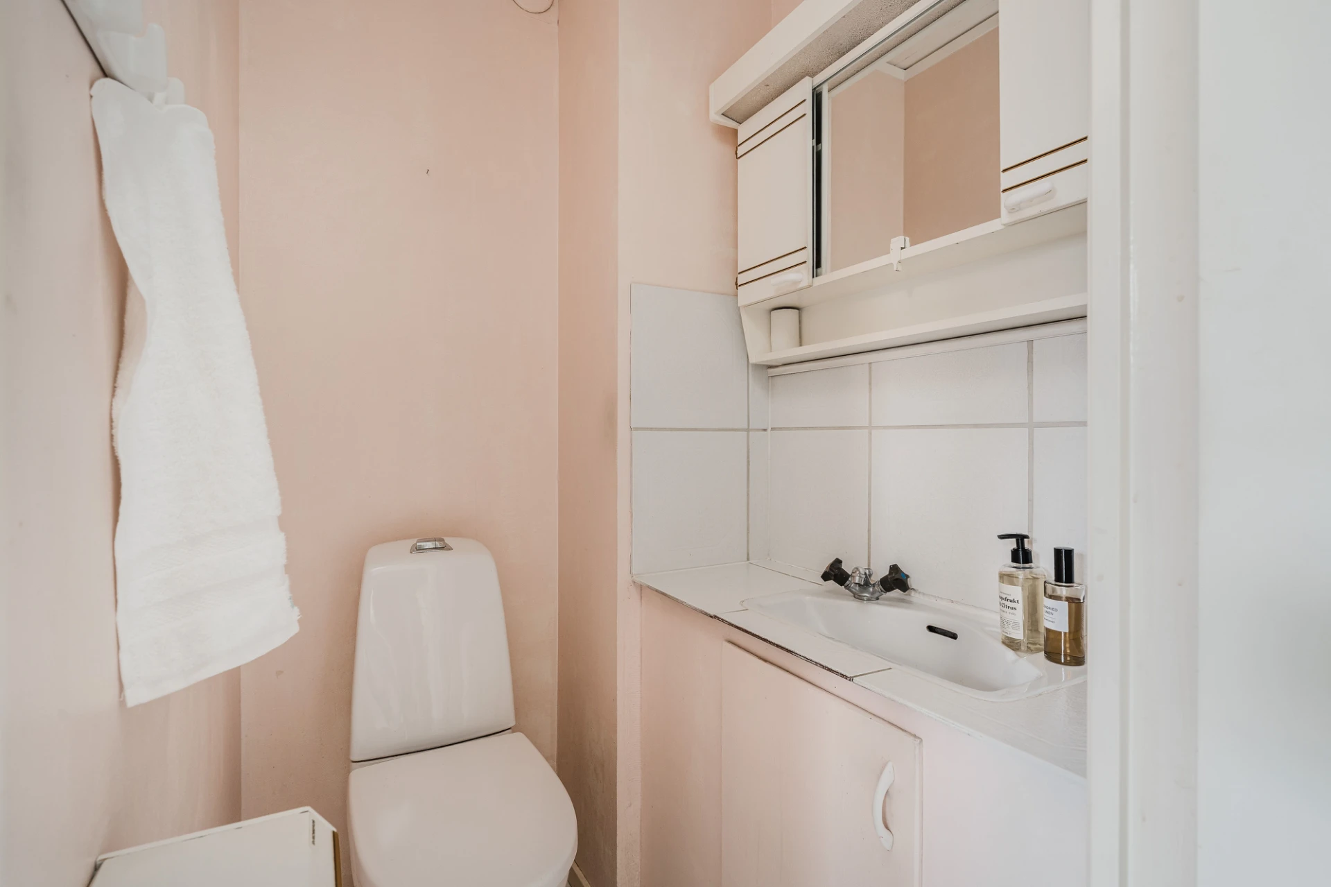 Gäst-WC utrustad med WC, handfat med kommod och vägghängt spegelskåp.