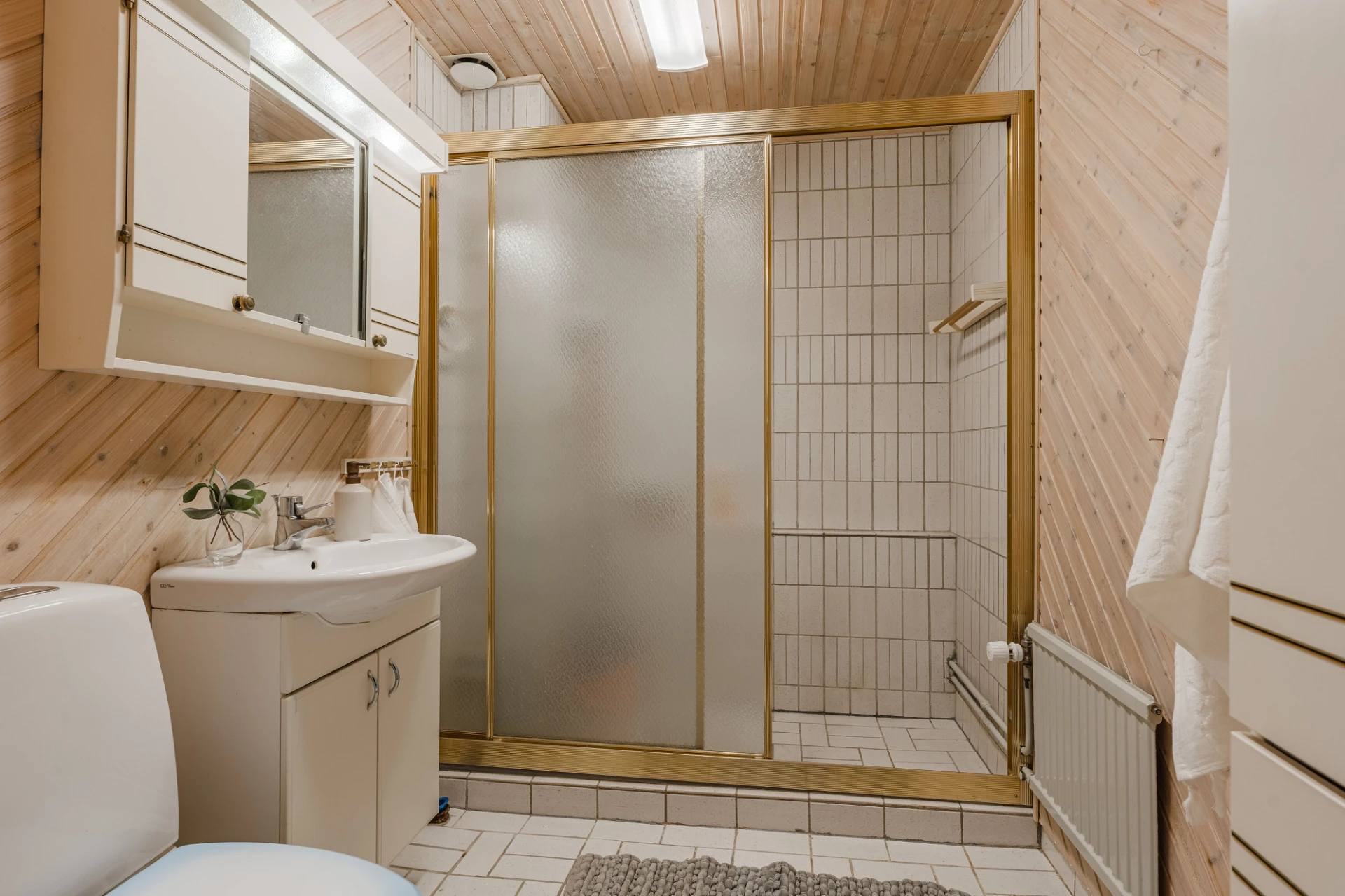 Ljust klinkergolv och väggar i träpanel samt kaklad duschhörna. Badrummet är utrustat med WC, handfat med kommod, vägghängt spegelskåp och dusch med skjutbara glasdörrar.