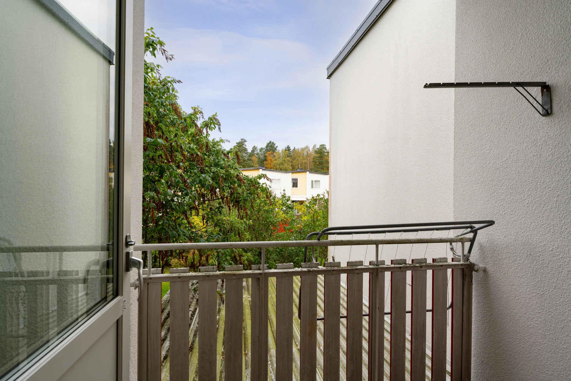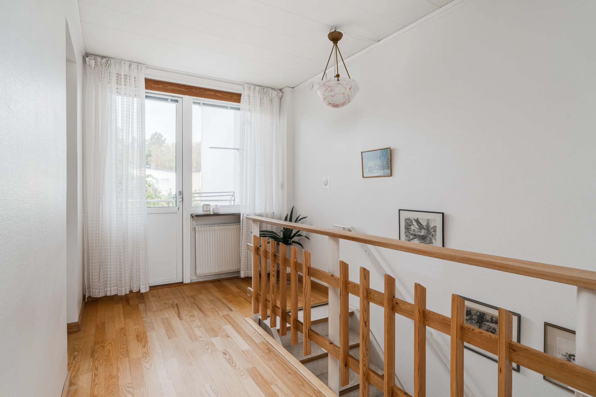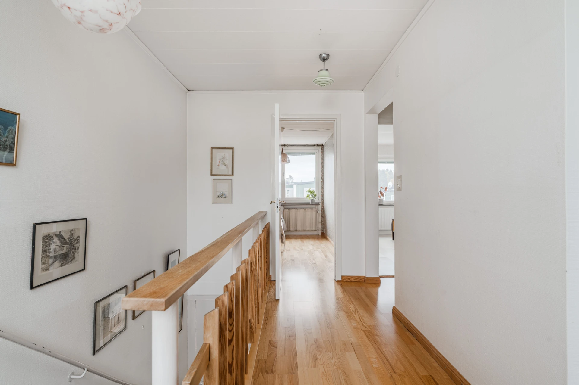 Parkettgolv och väggar i en ljus nyans. Förvaring i klädkammare. Från hallen nås en balkong i nordvästläge.