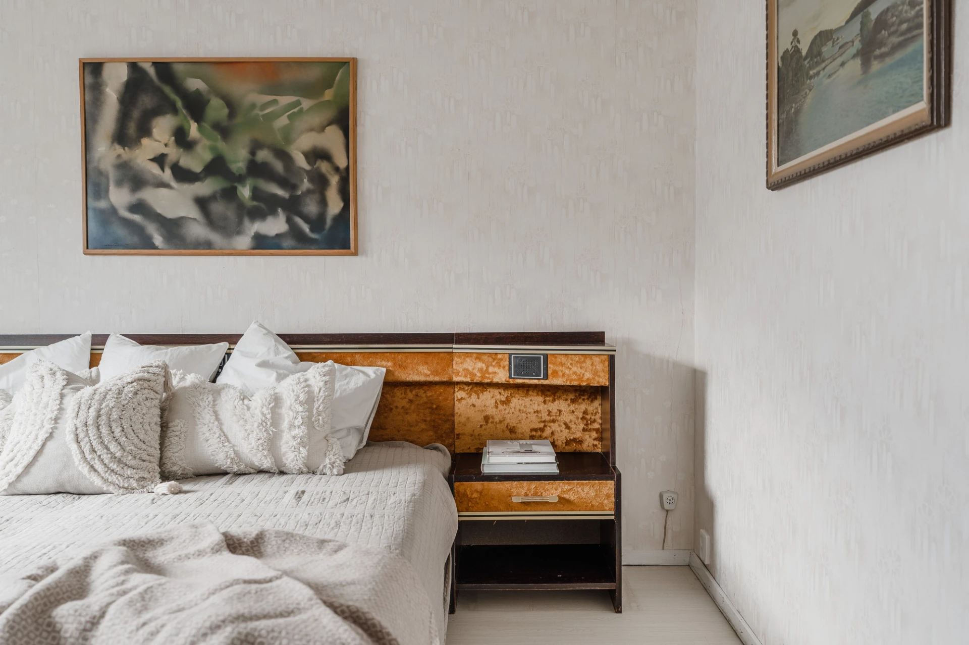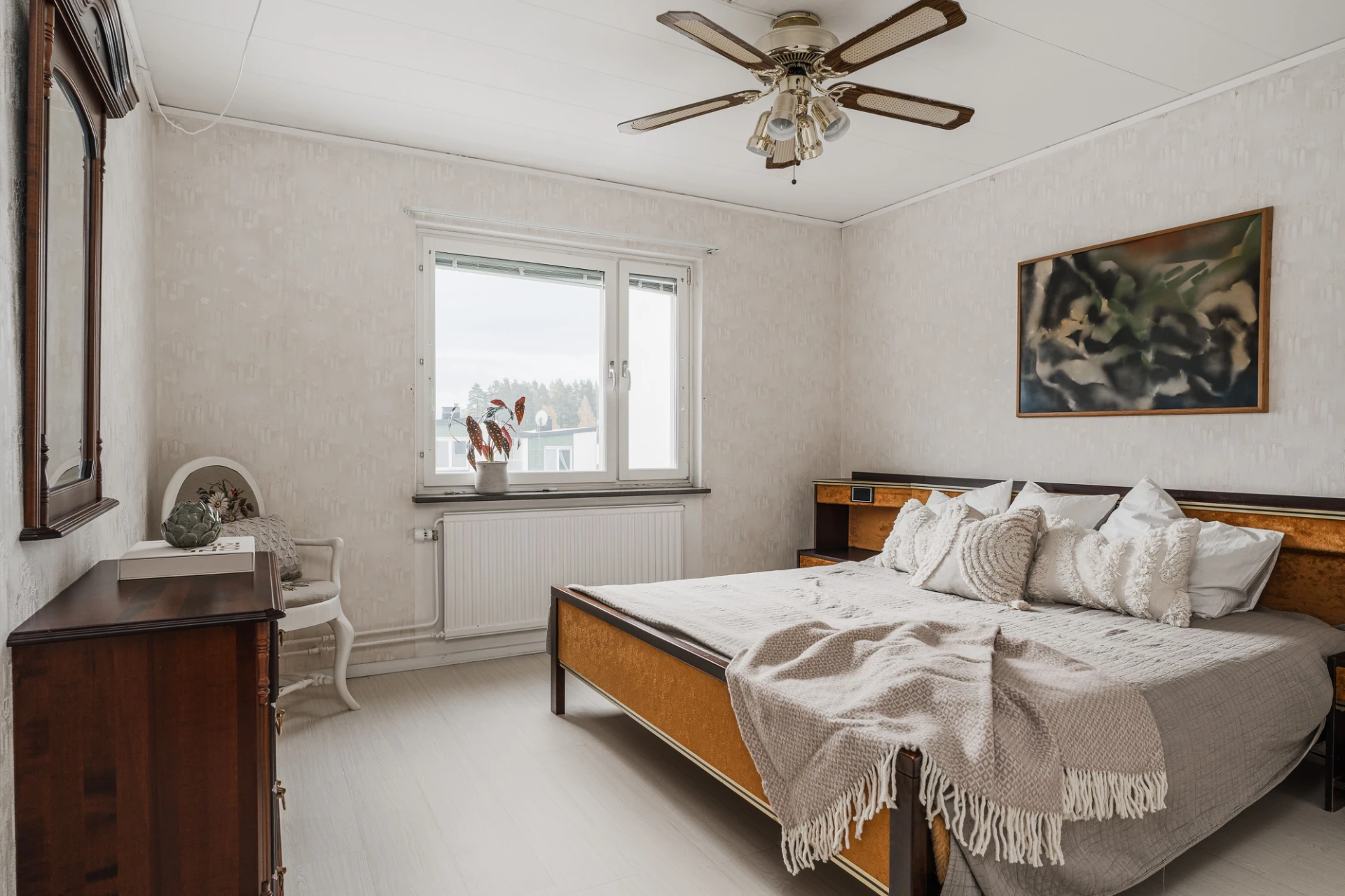 Laminatgolv och väggar i en ljus nyans. Här finns plats för dubbelsäng med tillhörande möblemang.