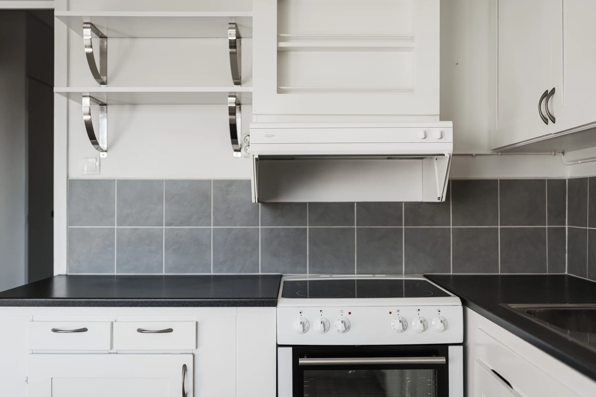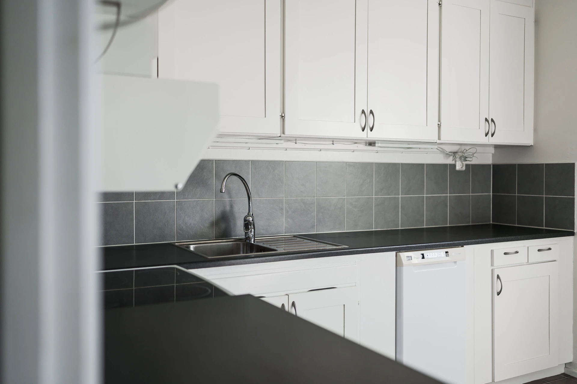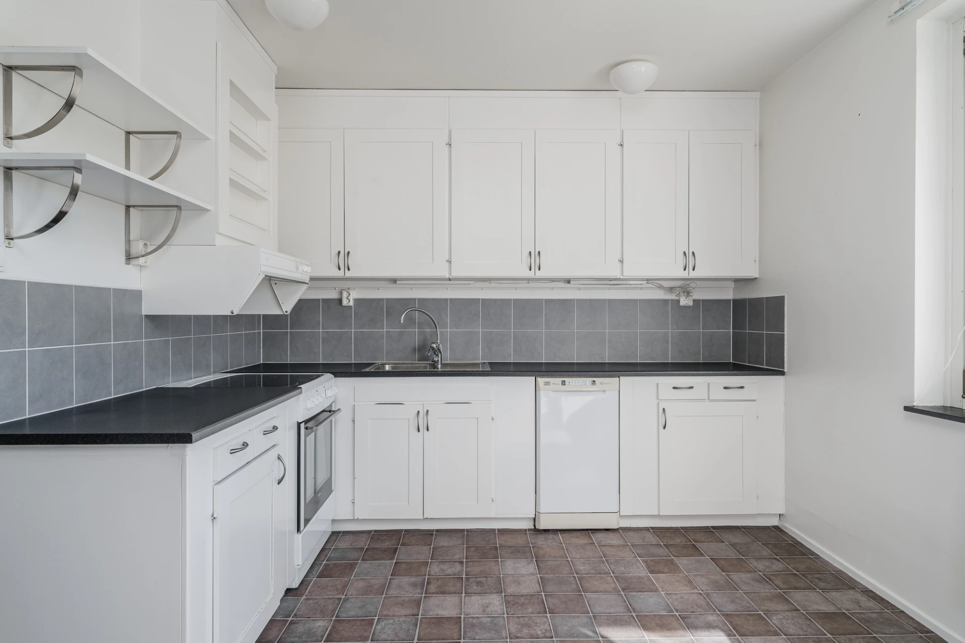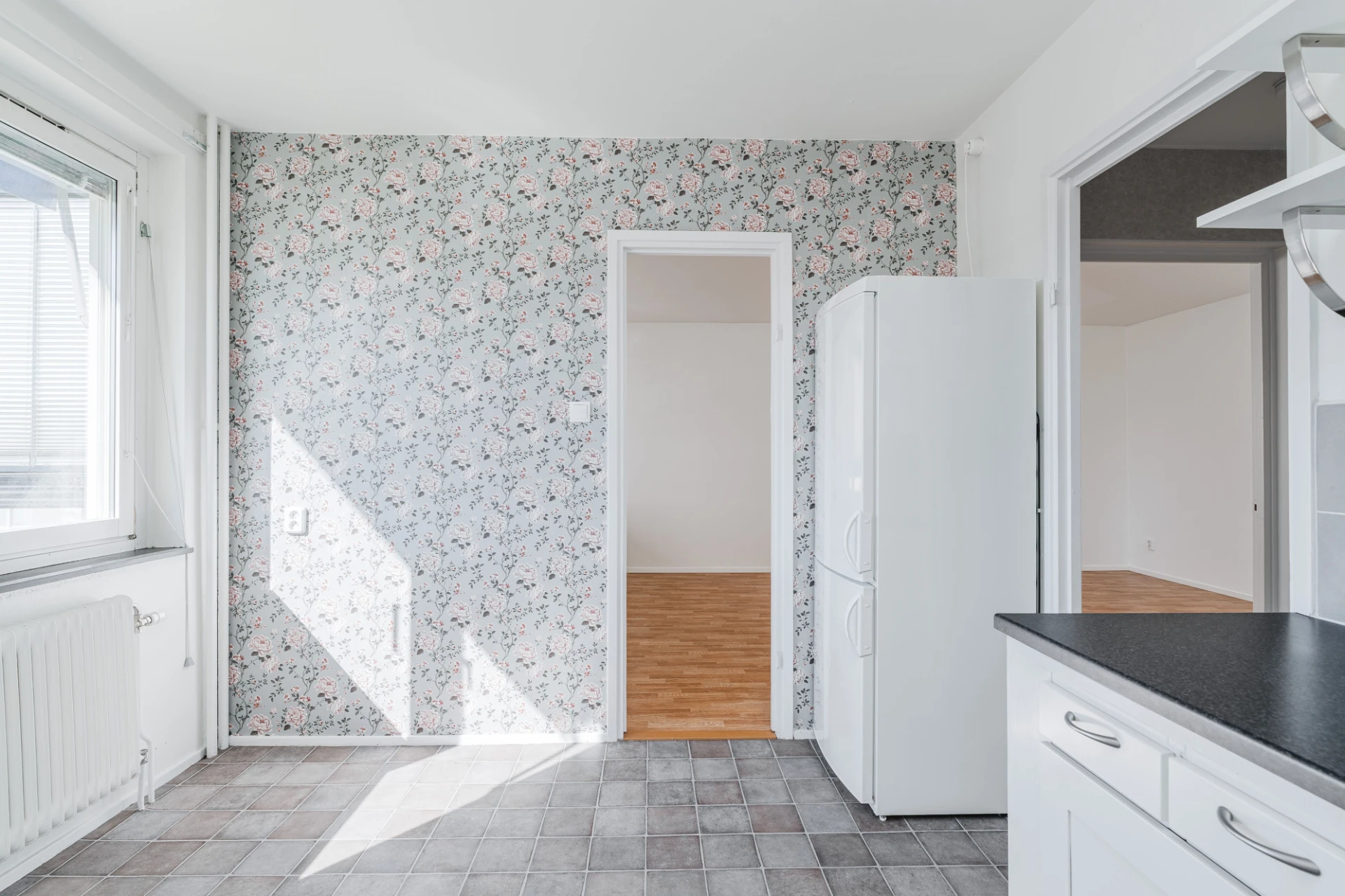 Grå plastmatta i klinkerimitation och målade väggar i vitt samt tapetserad fondvägg. Vita skåpsluckor och grått kakel ovan bänkskivan i mörk laminat. Den maskinella utrustningen består av spis med ugn, spisfläkt, diskmaskin samt kombinerad kyl och frys. Matplats för 4-6 personer. Köket har markis över köksfönstret.