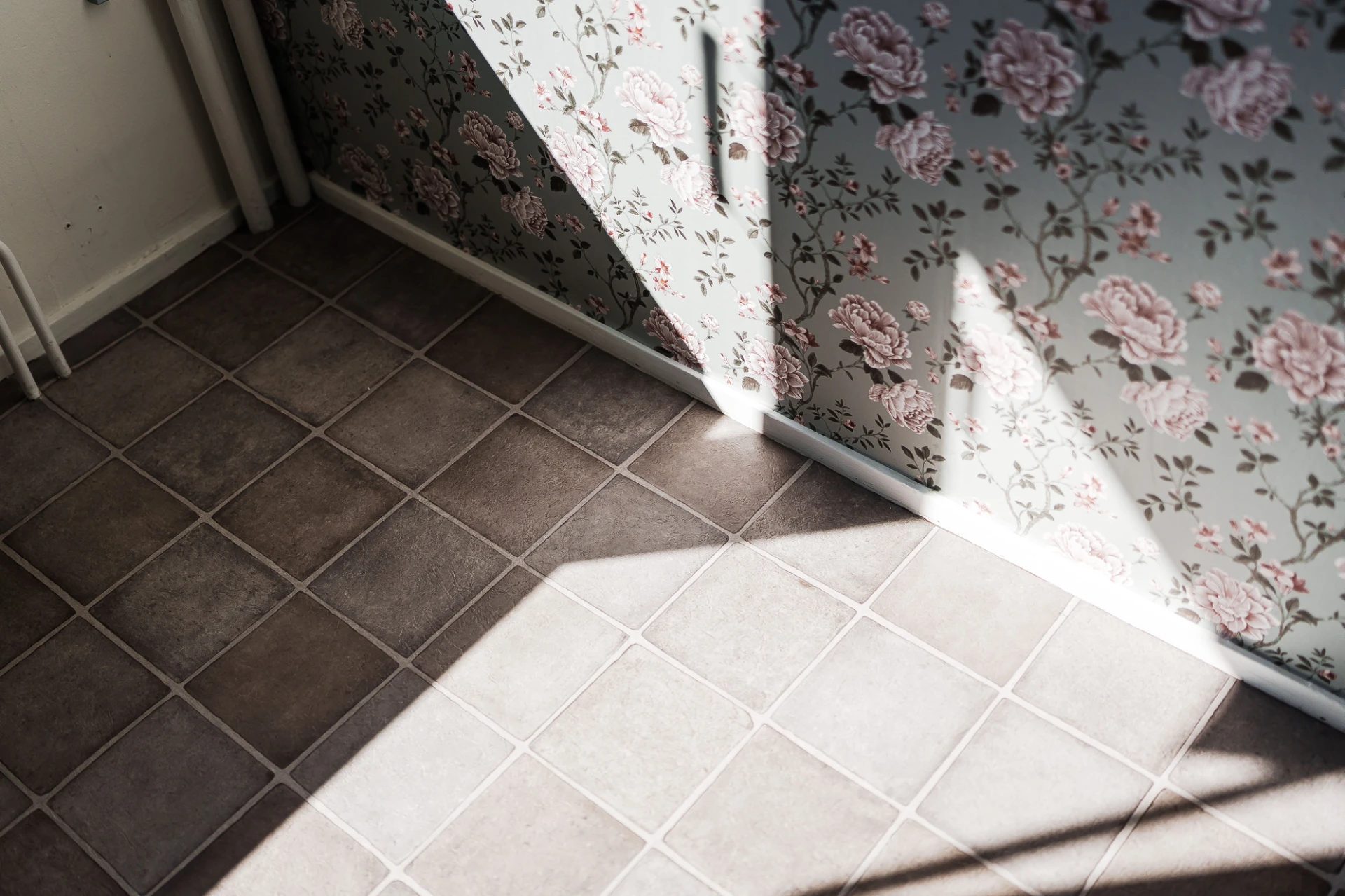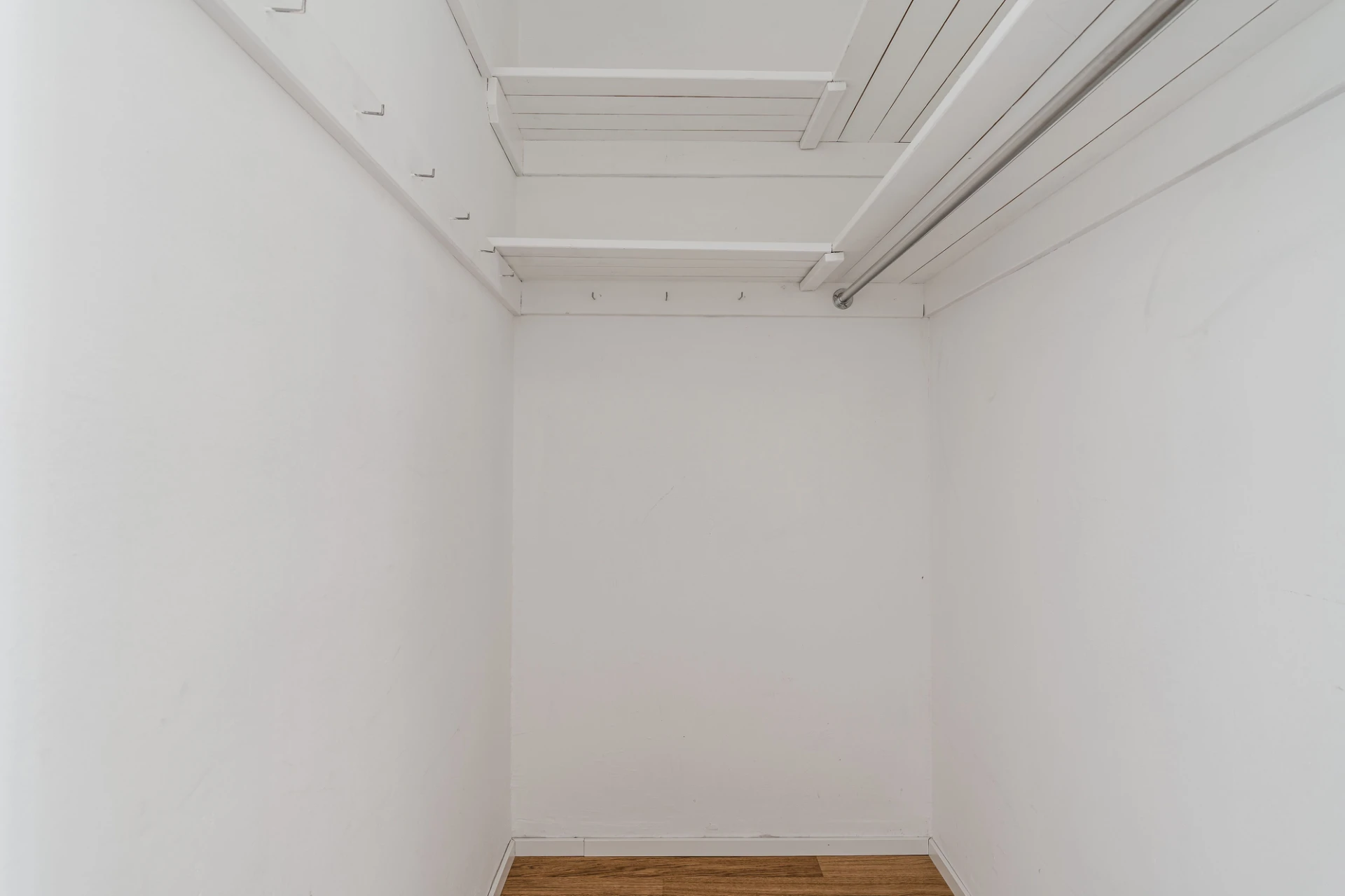 Grå plastmatta i klinkerimitation och målade väggar i vitt. Förvaring i garderober och en rymlig klädkammare.