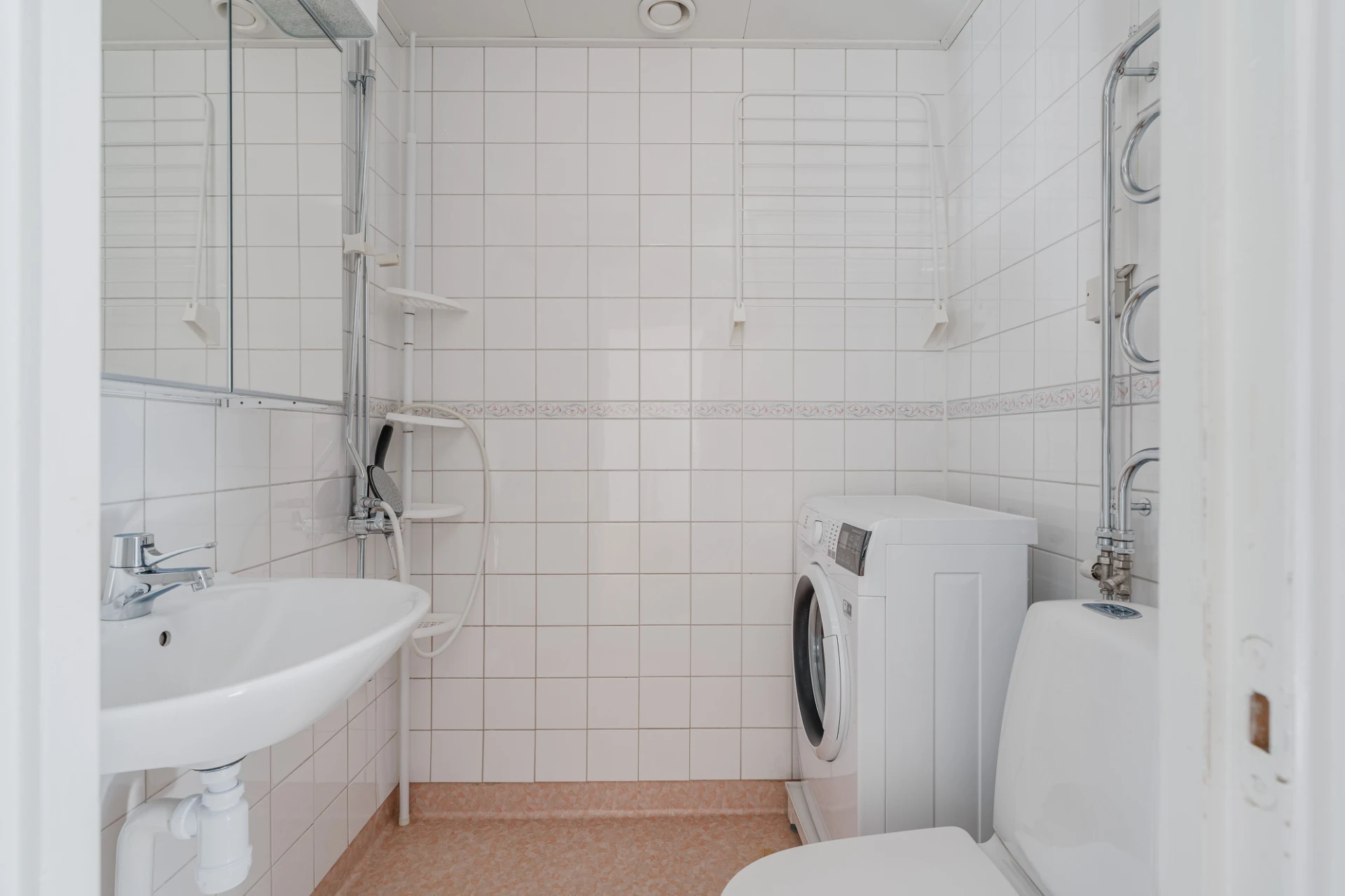 Beige våtrumsmatta och helkaklade väggar i vitt. Badrummet är utrustat med WC, handfat, vägghängt spegelskåp, dusch, handdukstork och tvättmaskin (2024).