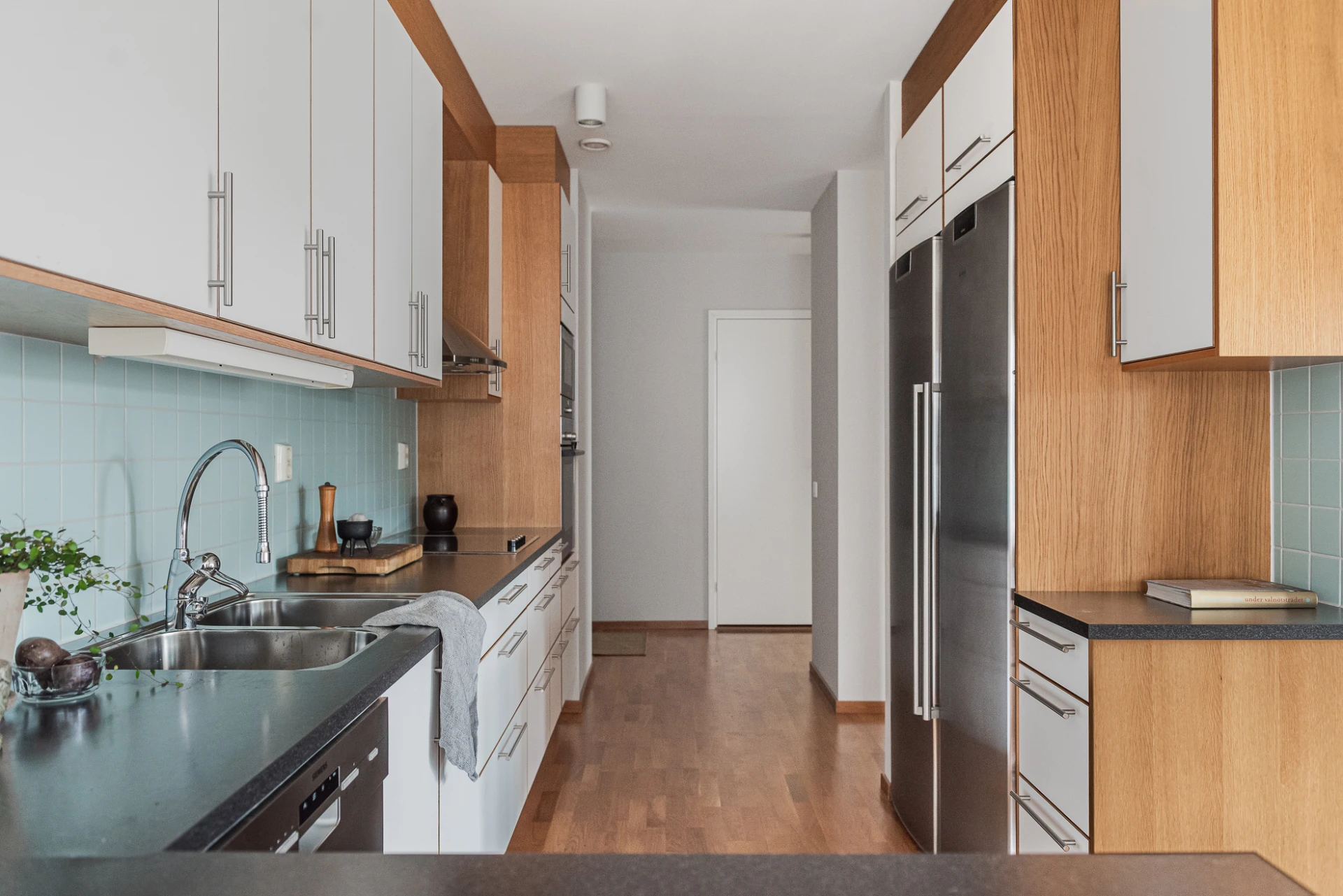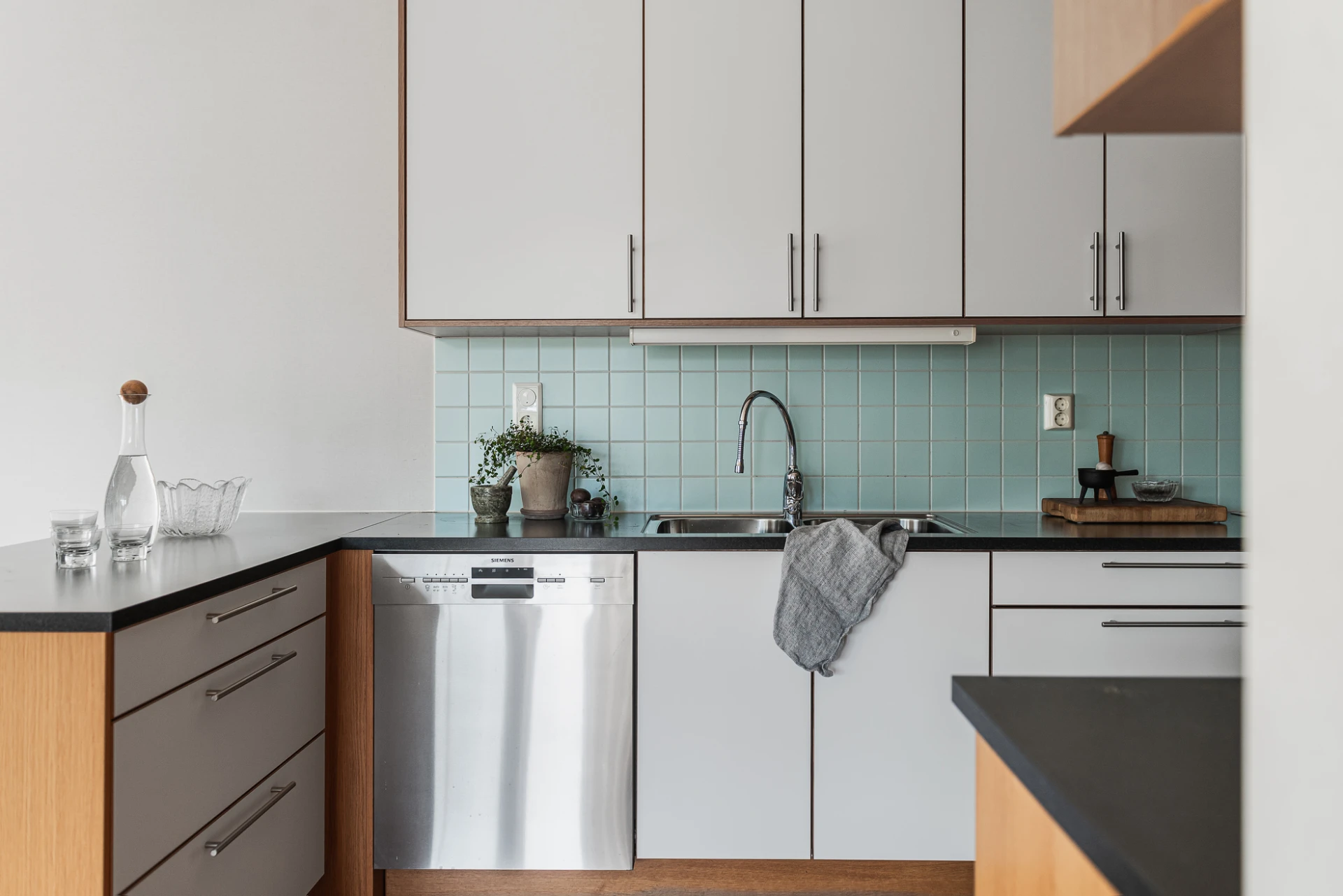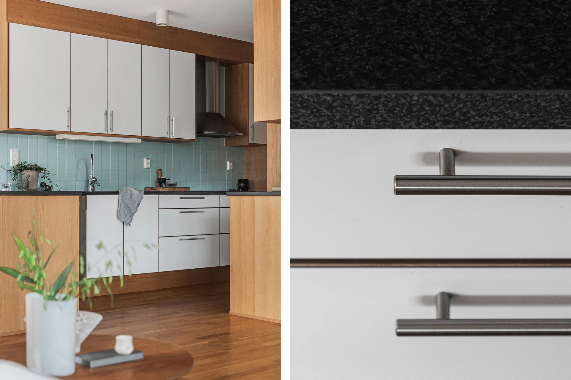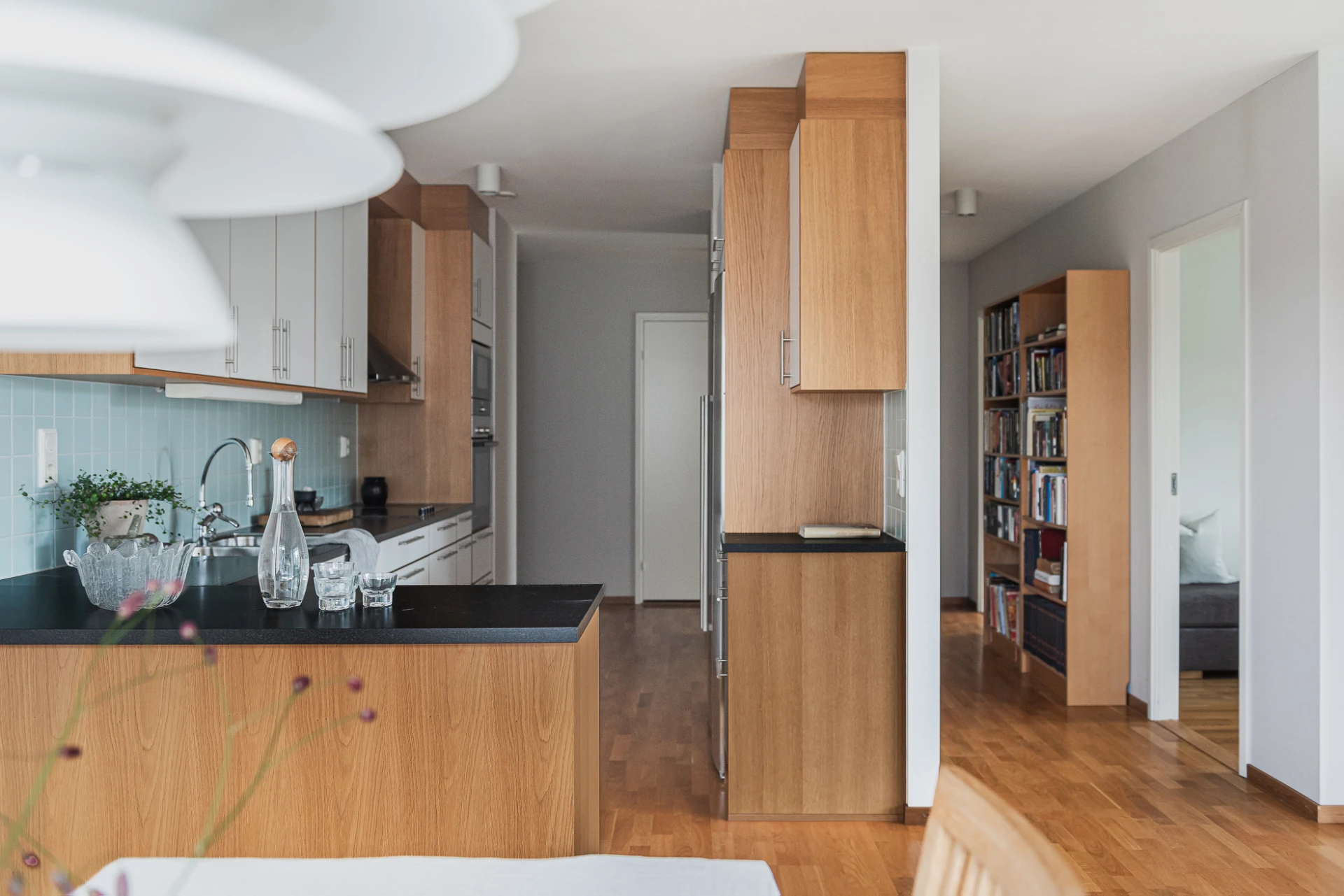 Parkettgolv och ljusa väggar. Skåpsinredning med stomme i ek och vita luckor samt turkos mosaik ovan svart arbetsbänk. Köket är utrustat med diskmaskin, spishäll, fläkt, inbyggd ugn och mikrovågsugn samt kyl och frys.