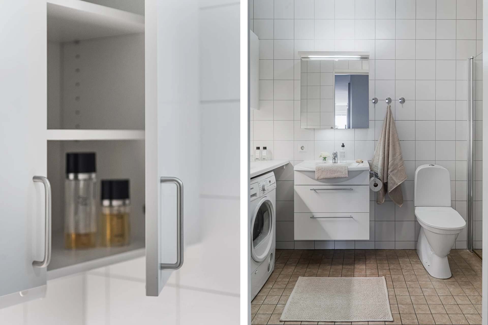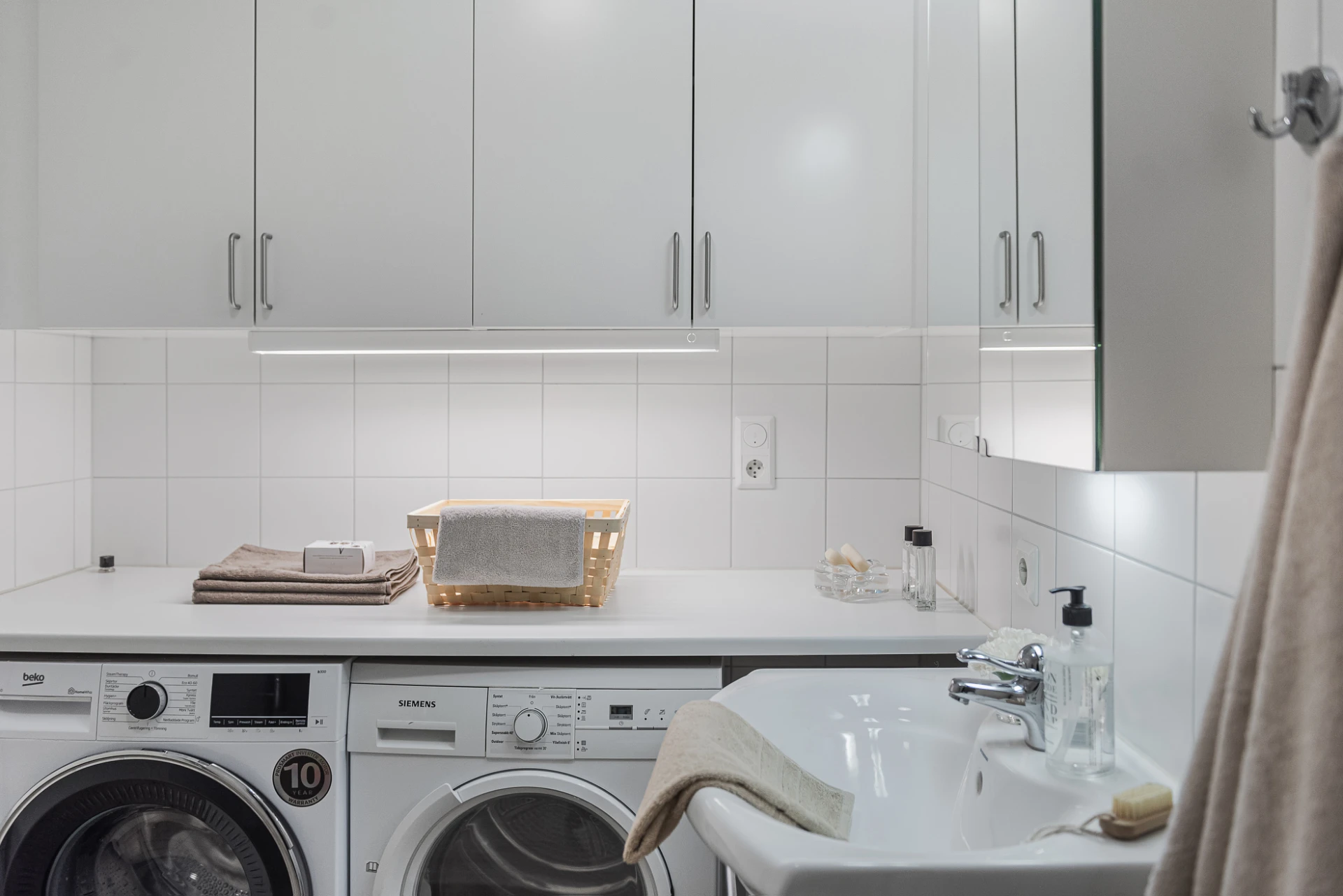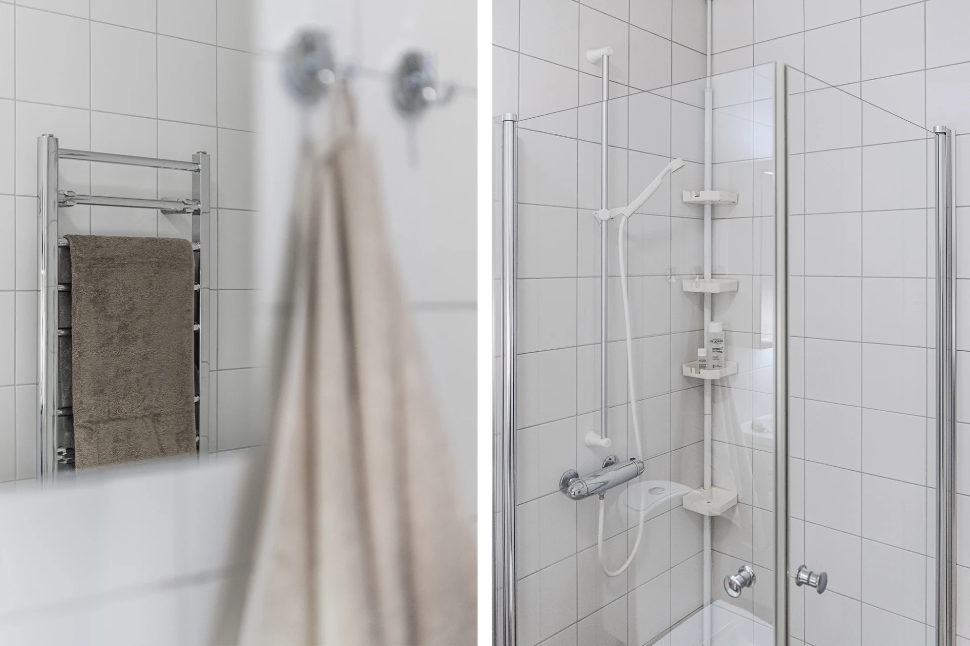 Beige klinker och vita helkaklade väggar. Badrummet är utrustat med WC, handfat med kommod, spegelskåp med belysning, tvättmaskin, torktumlare, avlastningsyta med belysning ovan, skåpsinredning, handdukstork och dusch med infällbara duschdörrar.