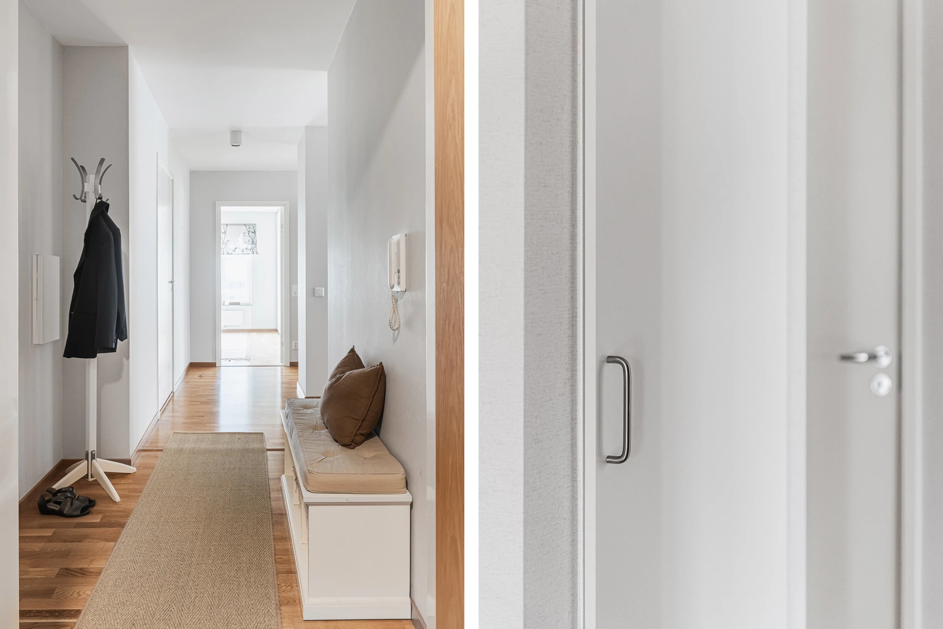 Parkettgolv och ljusa väggar. Städskåp och klädkammare.