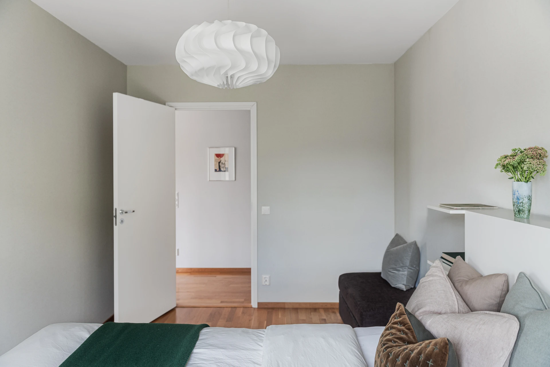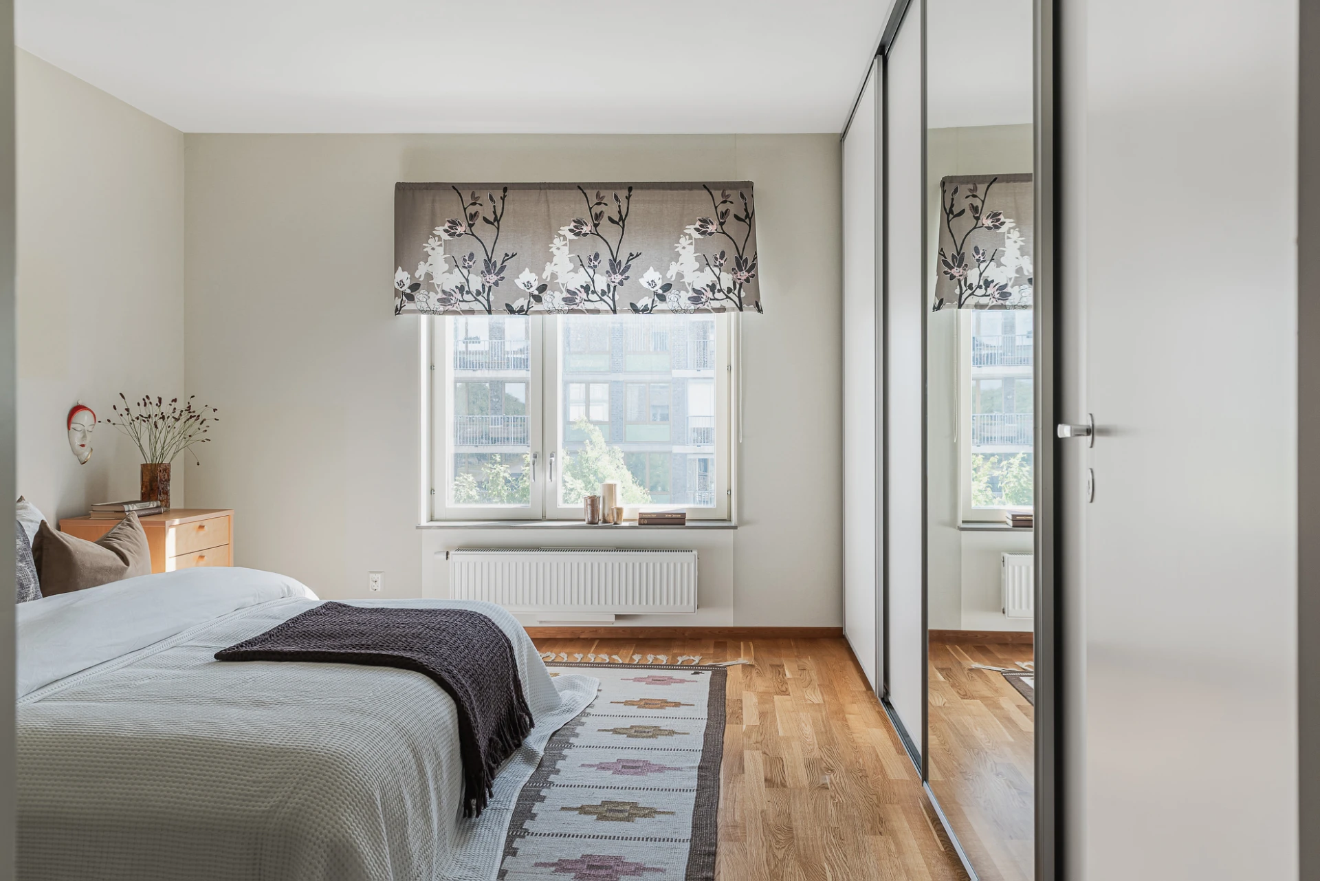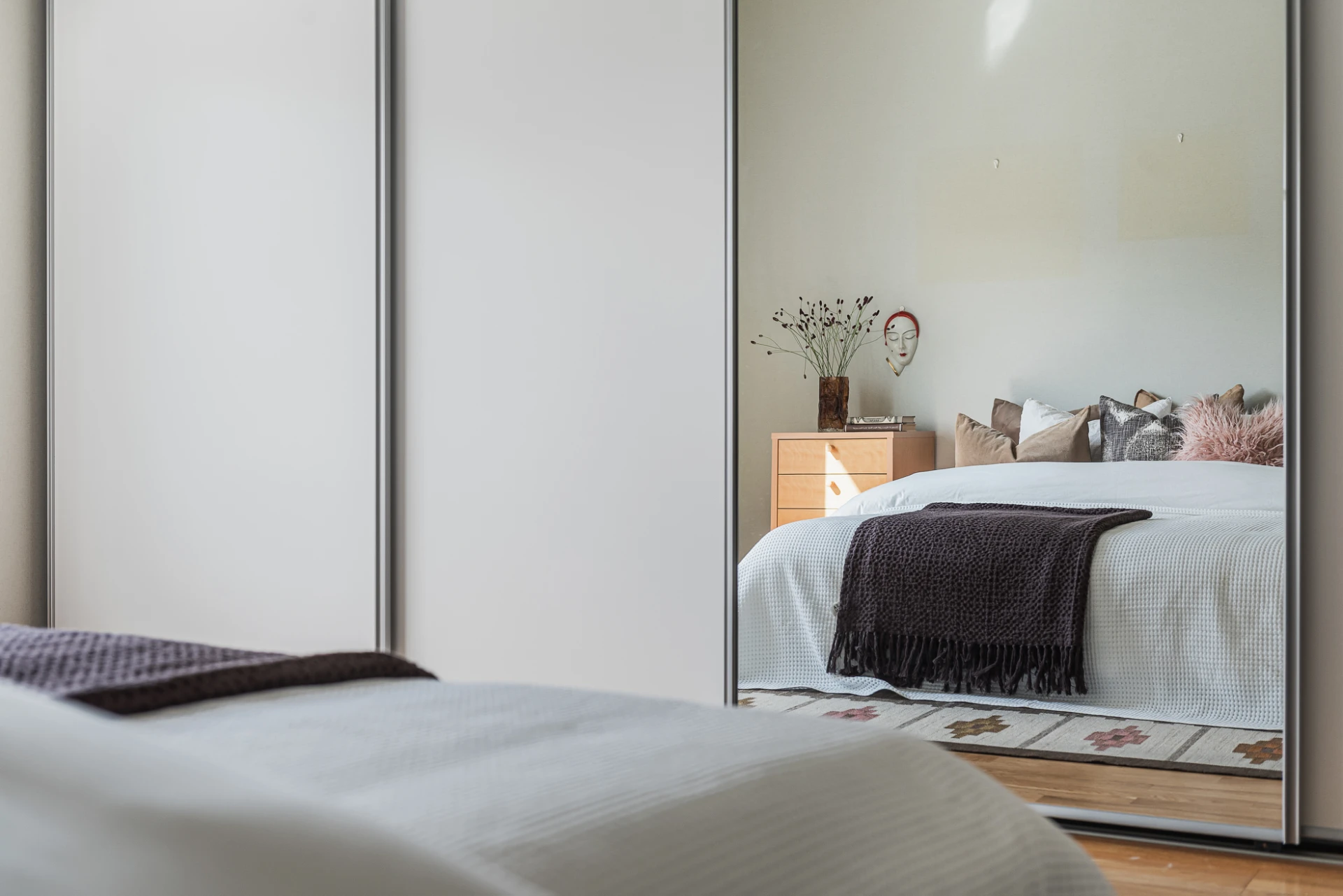 Parkettgolv och ljusa väggar samt skjutdörrsgarderob med spegel.