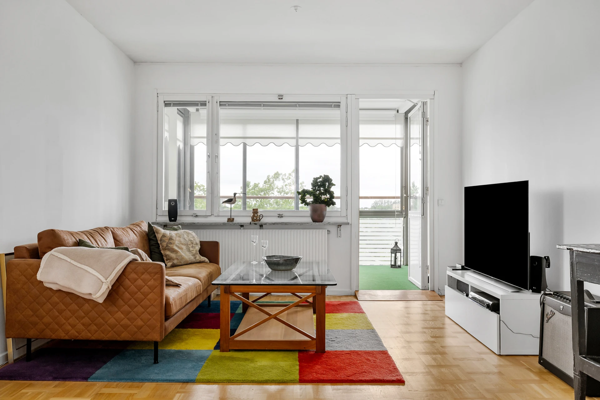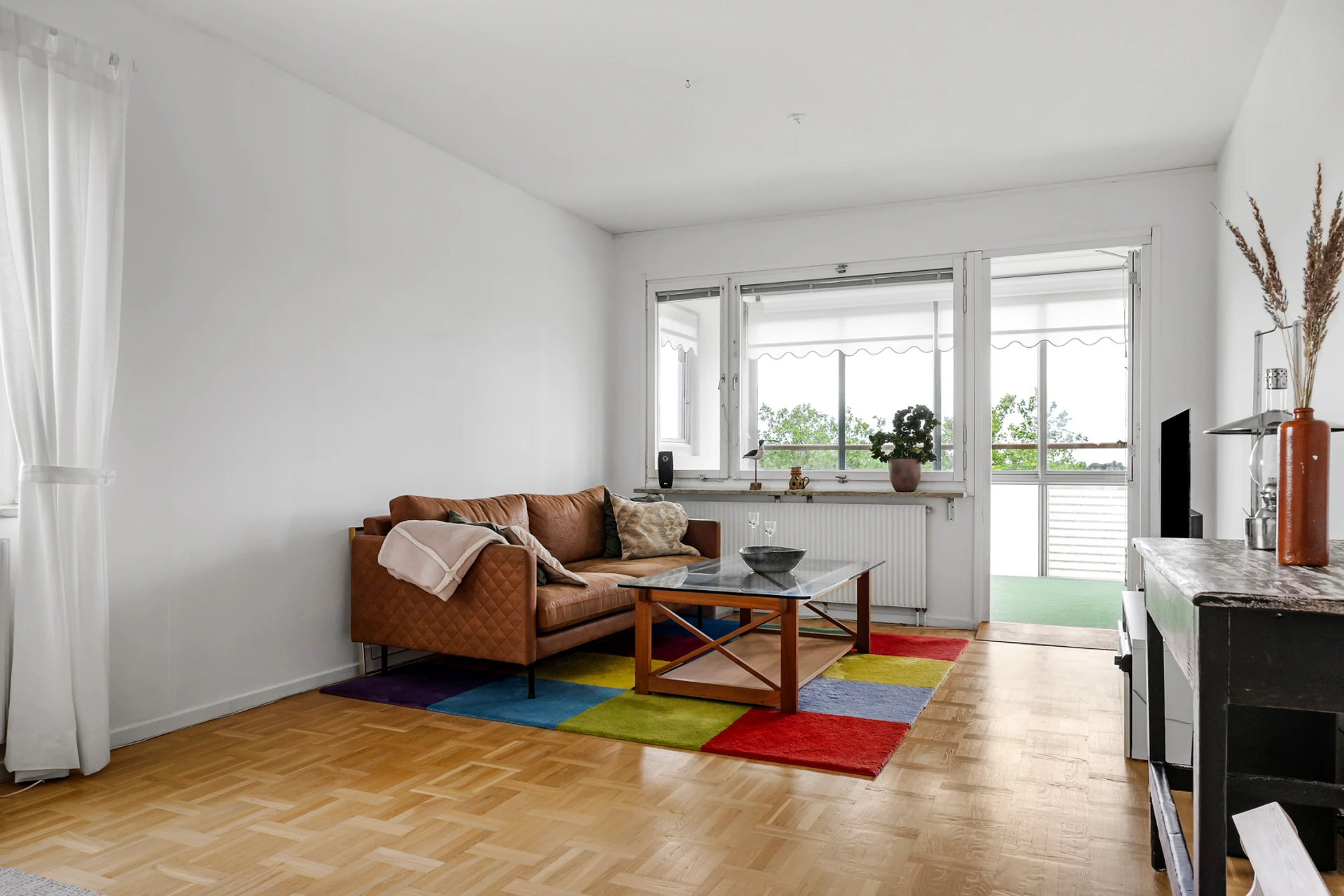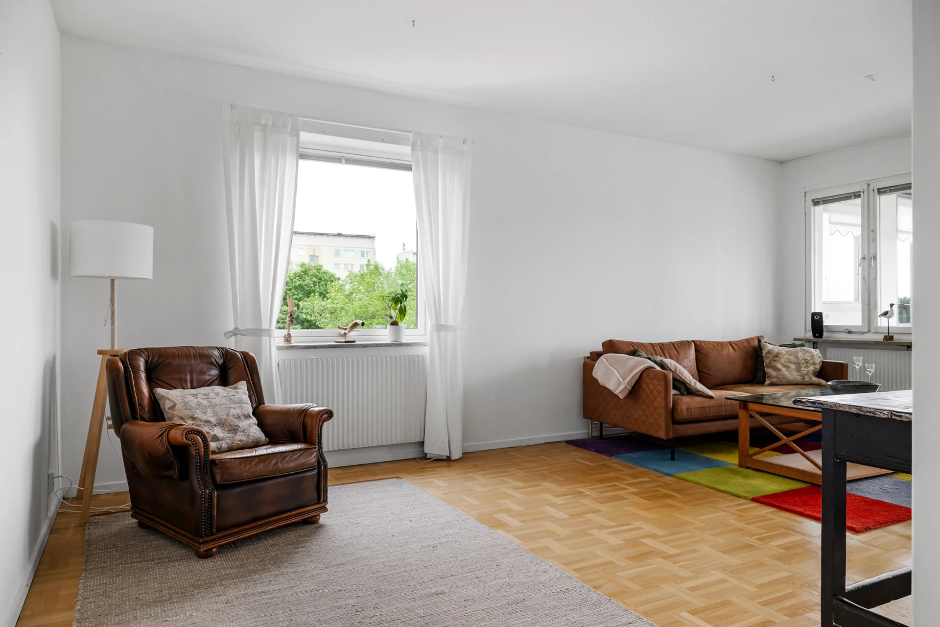 Parkettgolv i original och vita väggar. Utgång till inglasad balkong i väster.