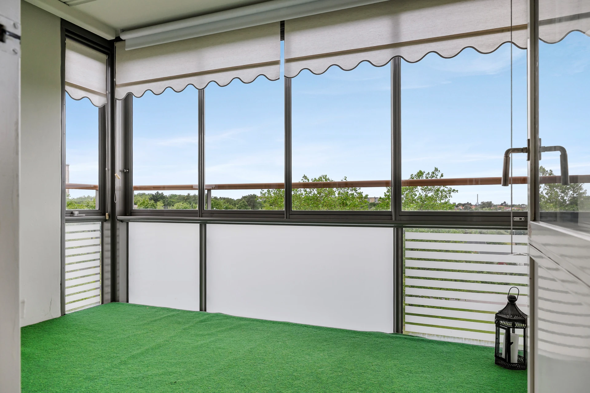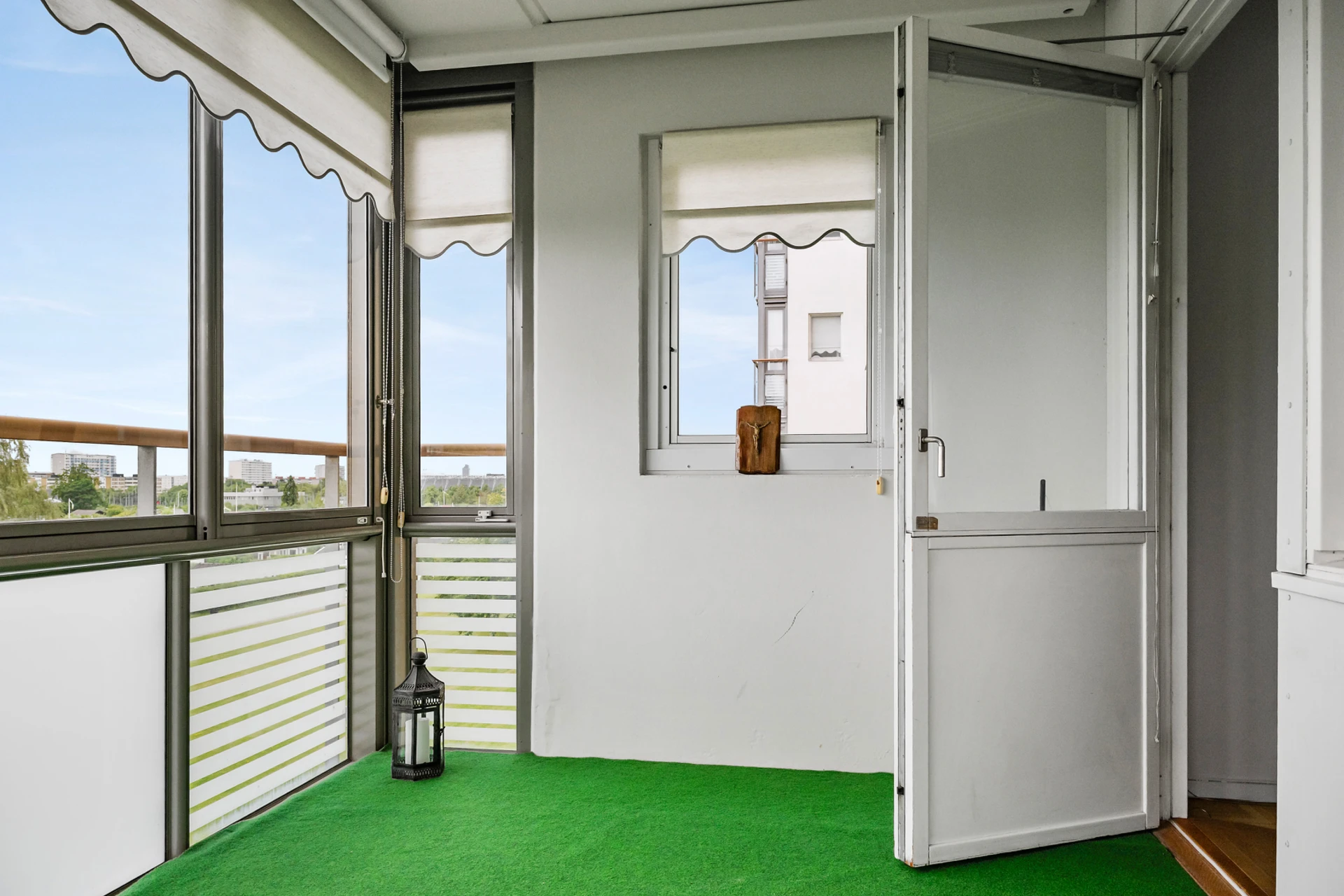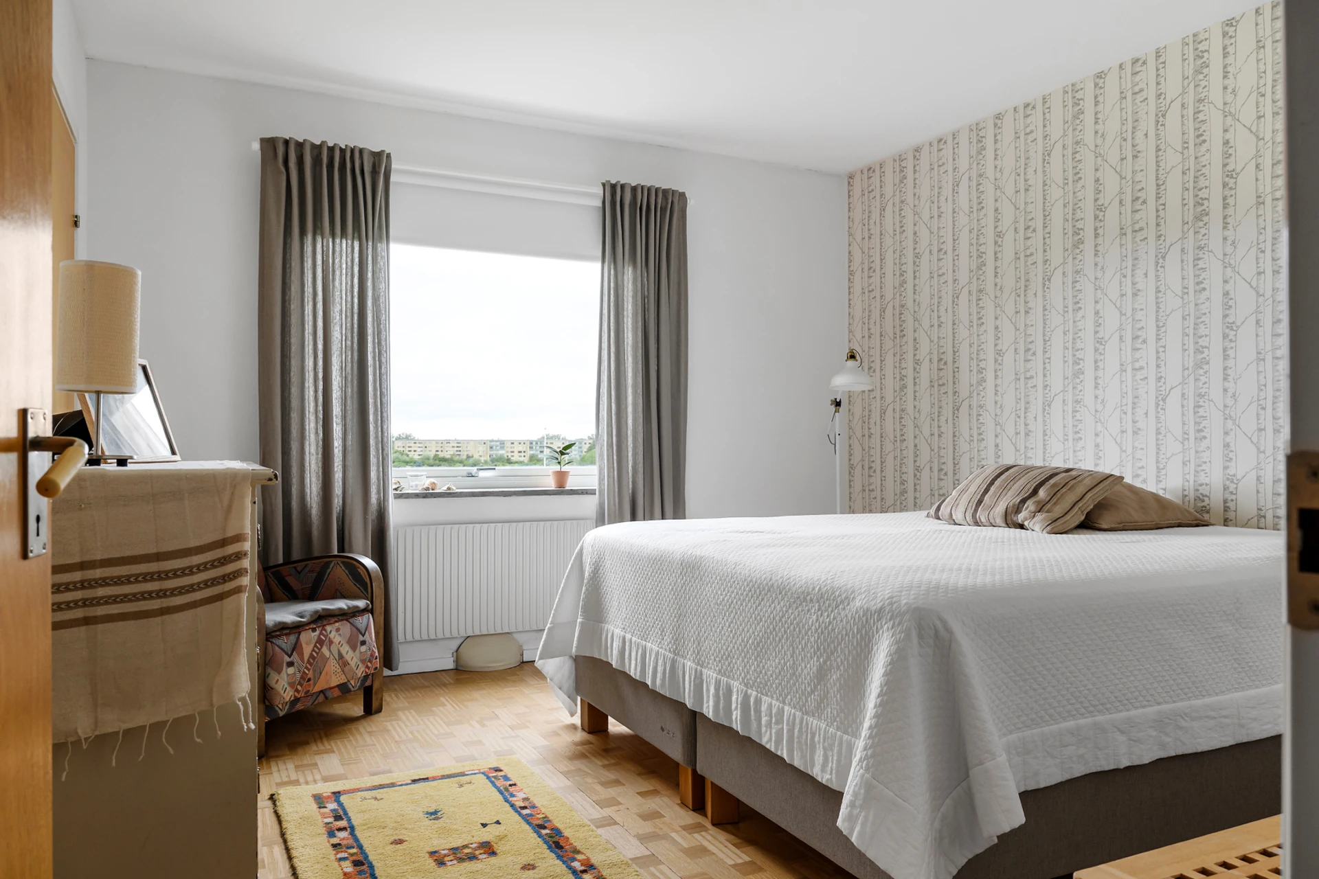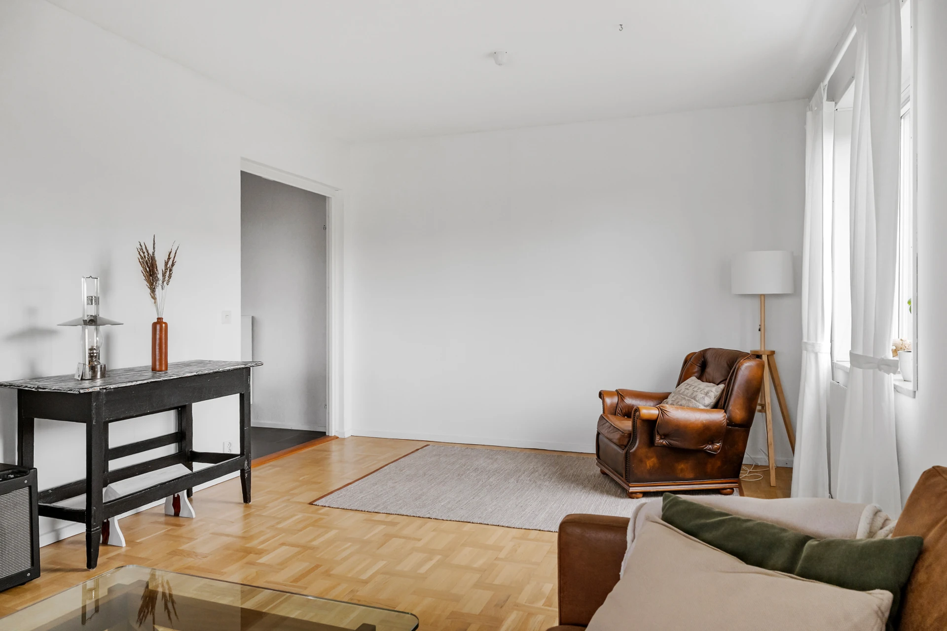 Parkettgolv i original och vita väggar. Utgång till inglasad balkong i väster.